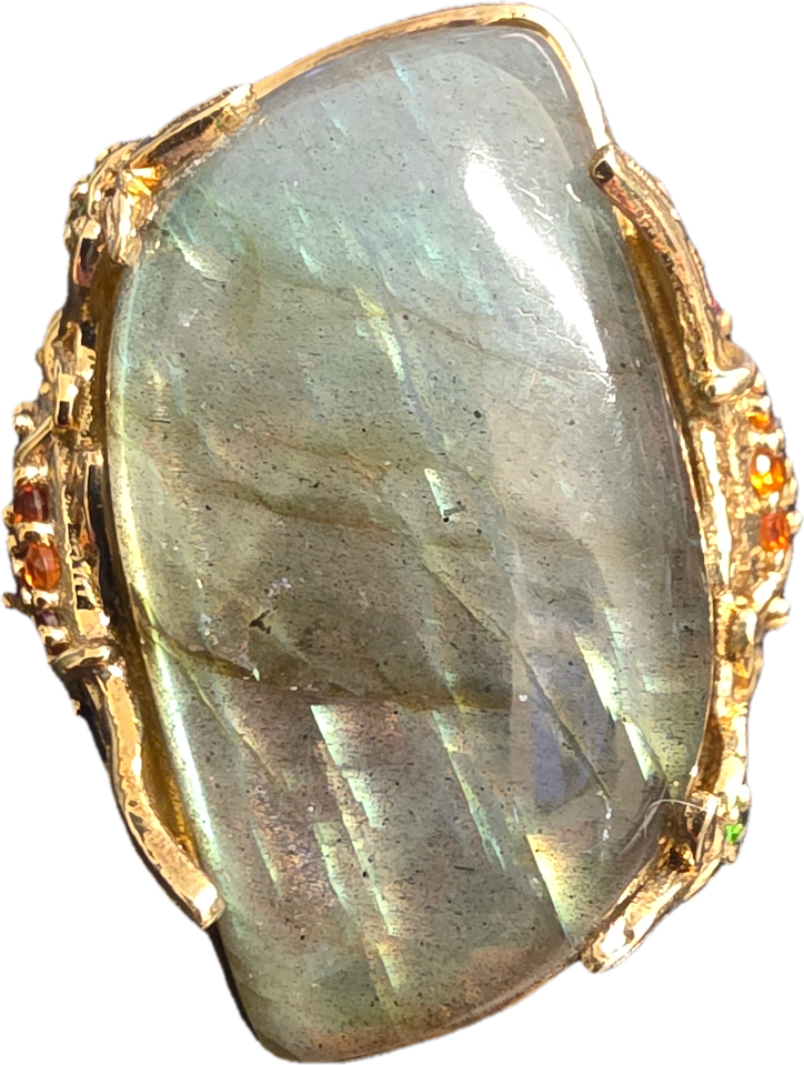 The ring remains in good overall condition. The central labradorite and accent gemstones appear secure within their settings. There is minor surface wear and light oxidation to the silver-gilt finish consistent with use.