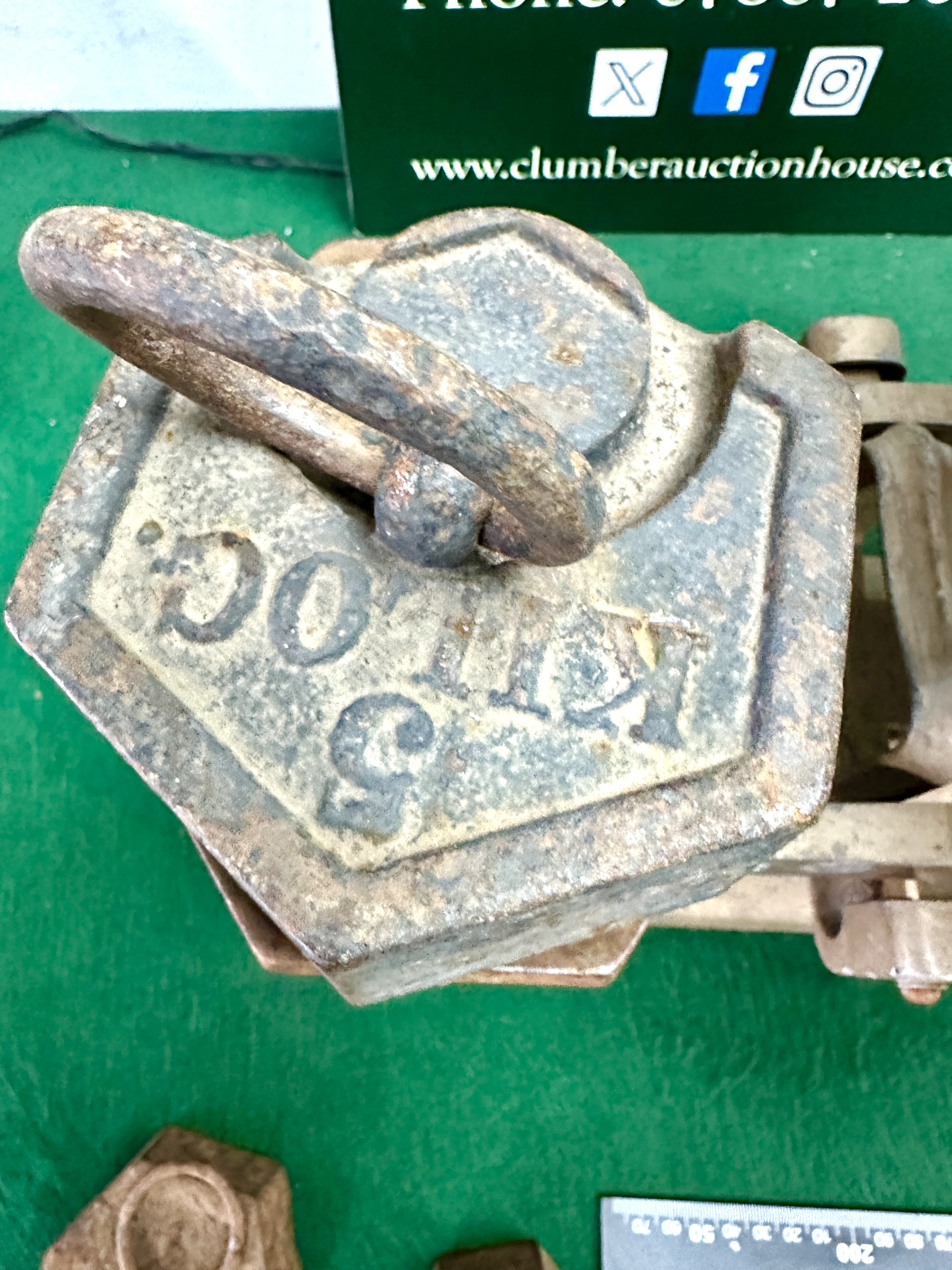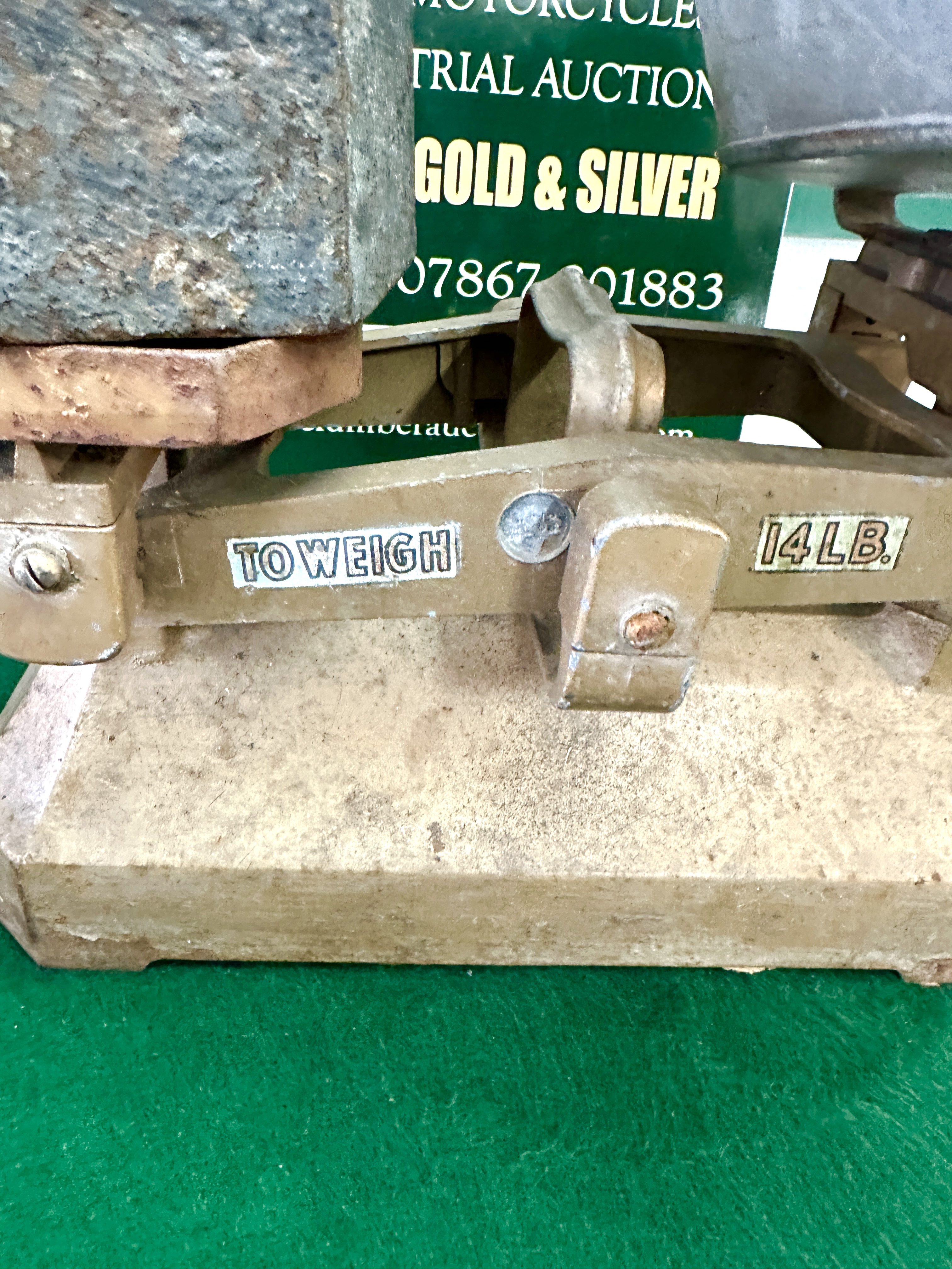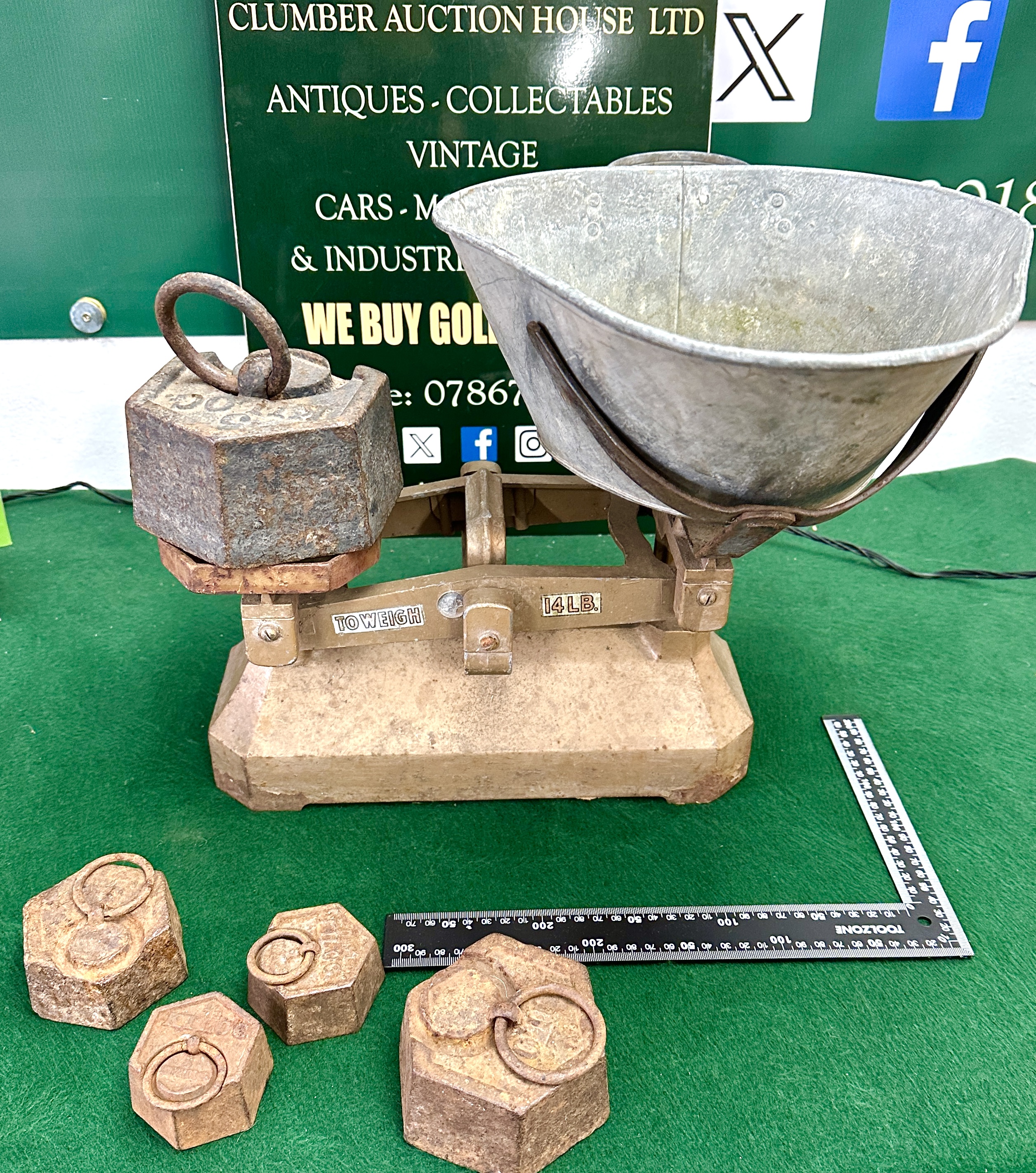 A vintage industrial counter beam scale and a group of cast iron weights. The scale is constructed with a painted cast metal frame and is fitted with a removable galvanised sheet metal scoop. The frame features a cast inscription reading TO WEIGH 14 LB. The accompanying group of graduated weights are hexagonal in form, cast from iron, and feature integrated ring handles. One weight is marked 5 KILO 5000G.