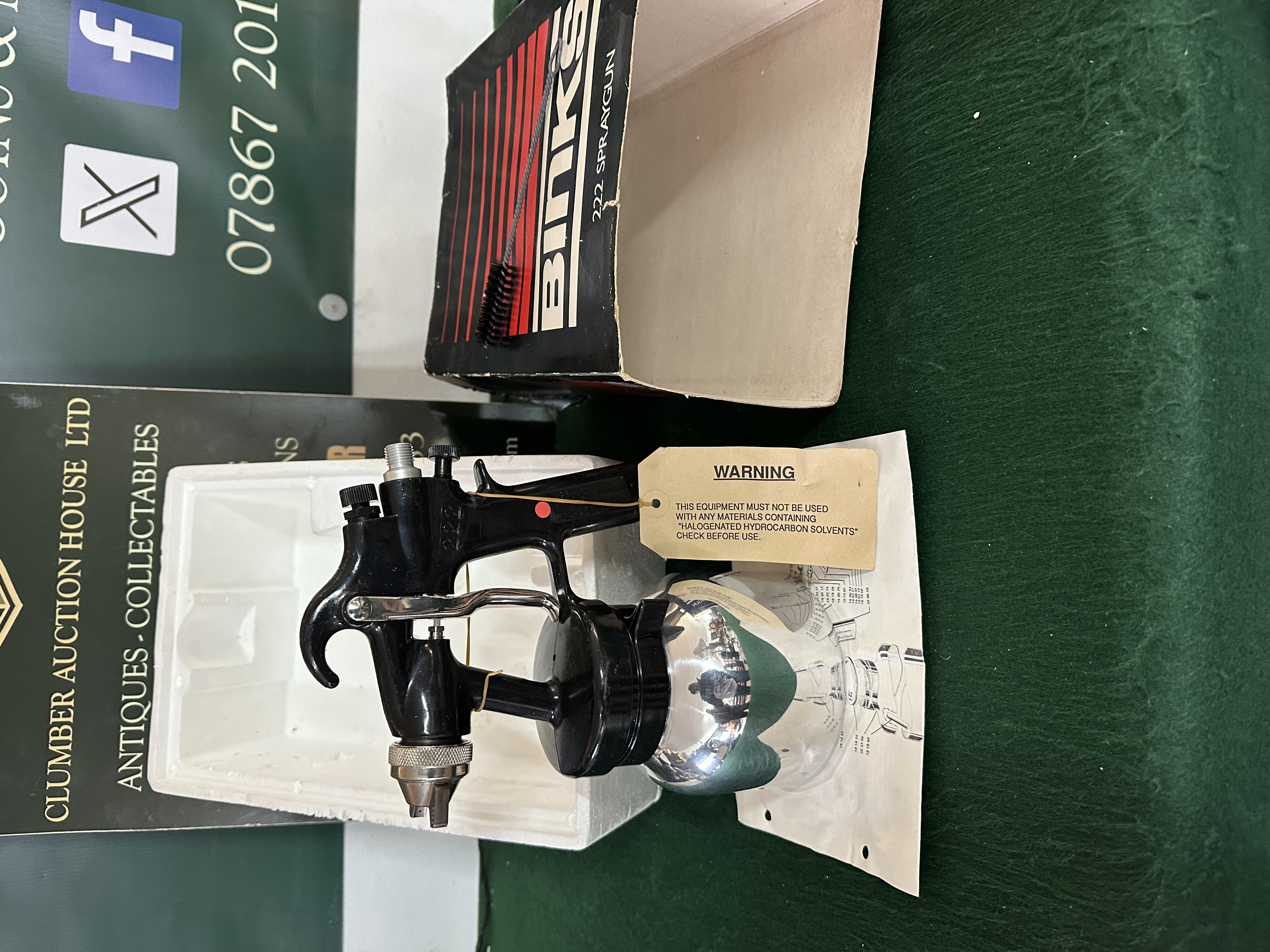A Binks Model 222 pneumatic spray gun set, complete with original retail packaging and documentation. The spray gun features a black-finished body with the model number 222 cast into the side, a chrome-toned trigger and nozzle assembly, and an attached polished metal material cup. The set is housed in its original black, red, and white branded cardboard box with a white polystyrene protective insert. Included is a technical parts list manual for the Model 222, reference BB 1000-6, a wire-handled cleaning brush, and an original factory warning tag regarding the use of halogenated hydrocarbon solvents attached to the handle.