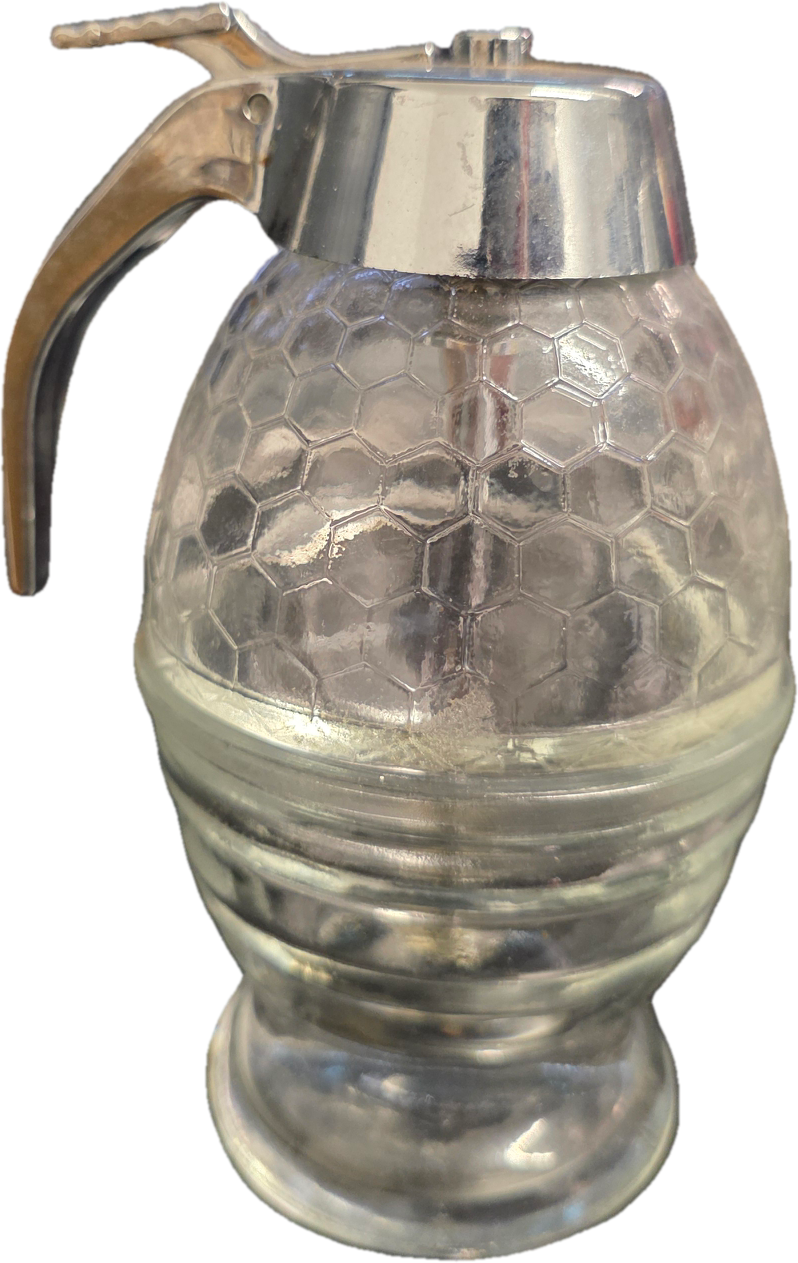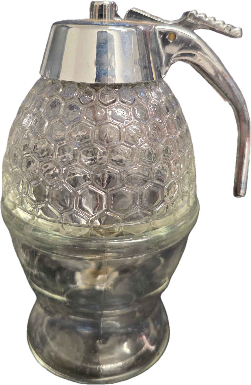 A collection of glass honey and syrup dispensers, each featuring a clear glass reservoir with a pressed honeycomb pattern on the upper half. The dispensers are equipped with chrome-plated metal lids that incorporate a thumb-operated trigger mechanism and a curved handle for pouring. Each unit sits within a separate, flared clear glass base designed to catch drips. The items are constructed from moulded glass and metal components.