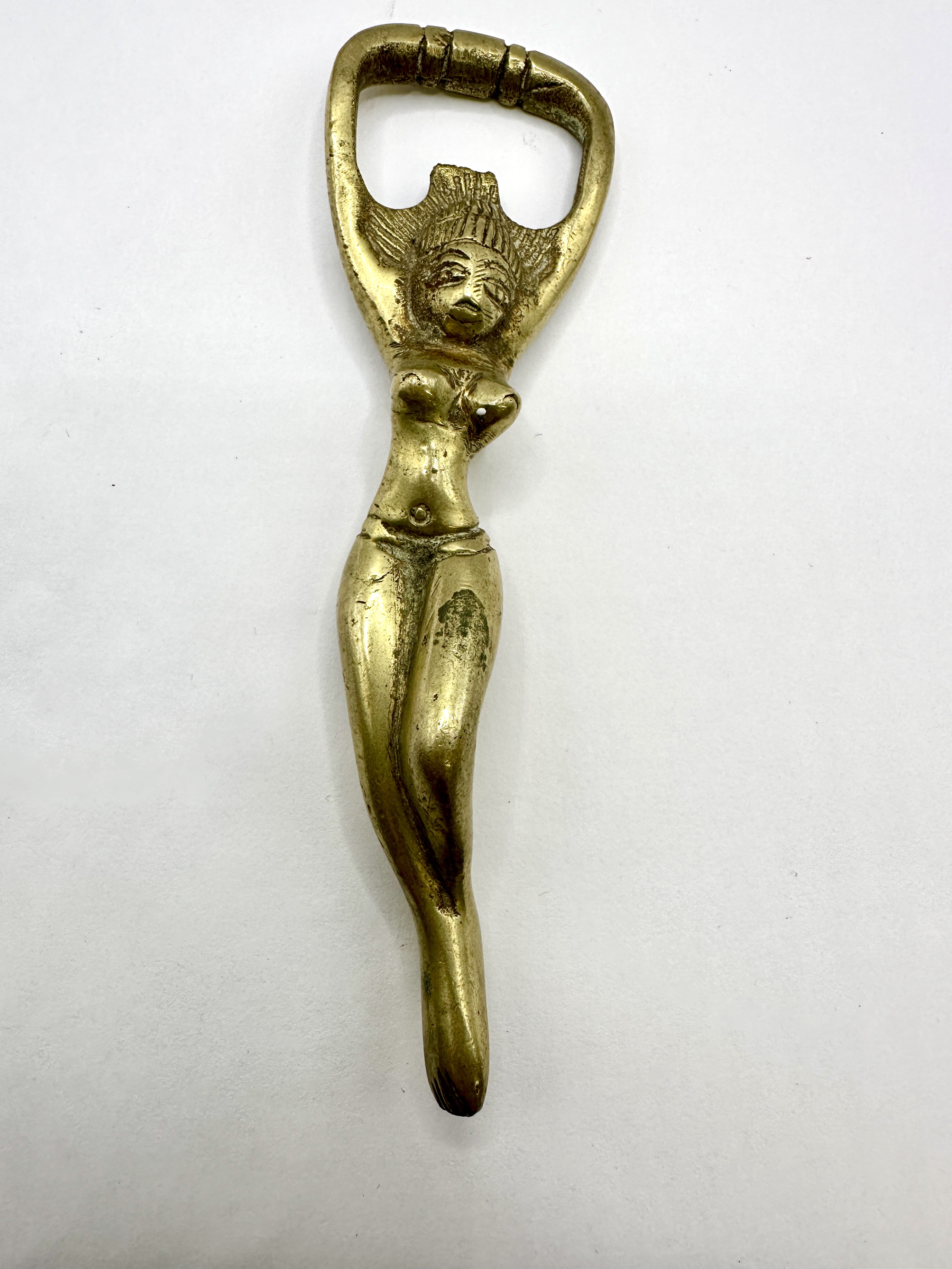 A vintage cast brass bottle opener featuring a stylised nude female figure. The object is constructed from solid brass with a polished gold-toned finish. The figure is depicted in an elongated pose with arms raised overhead to form the circular opener loop, while the legs are crossed at the base. The design reflects a mid-20th-century aesthetic influenced by South Asian artistic traditions. There are no visible maker marks or inscriptions on the piece.