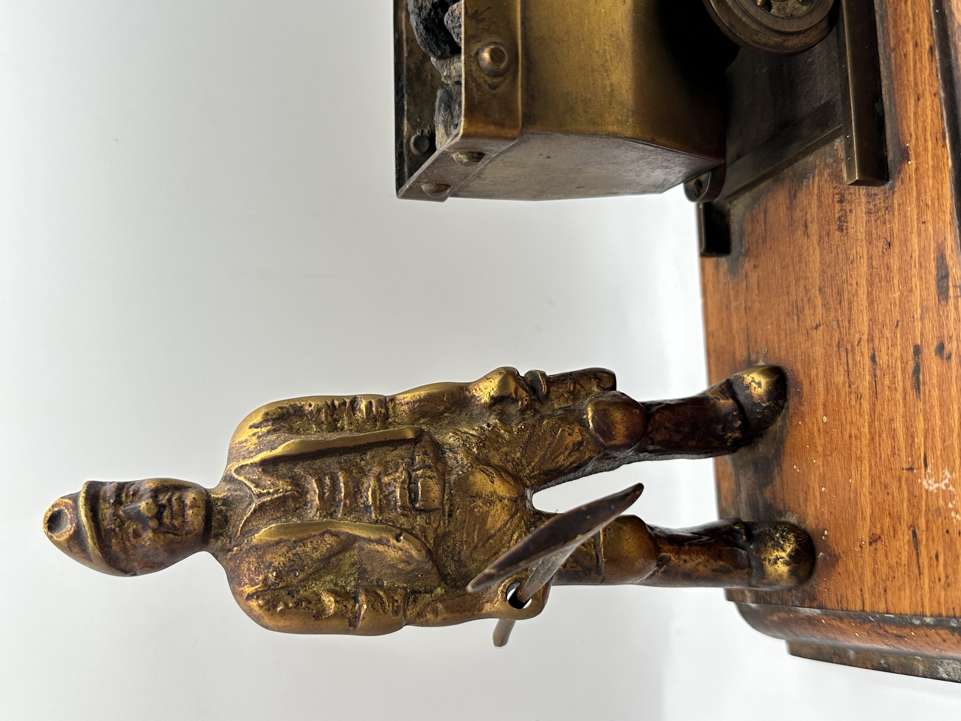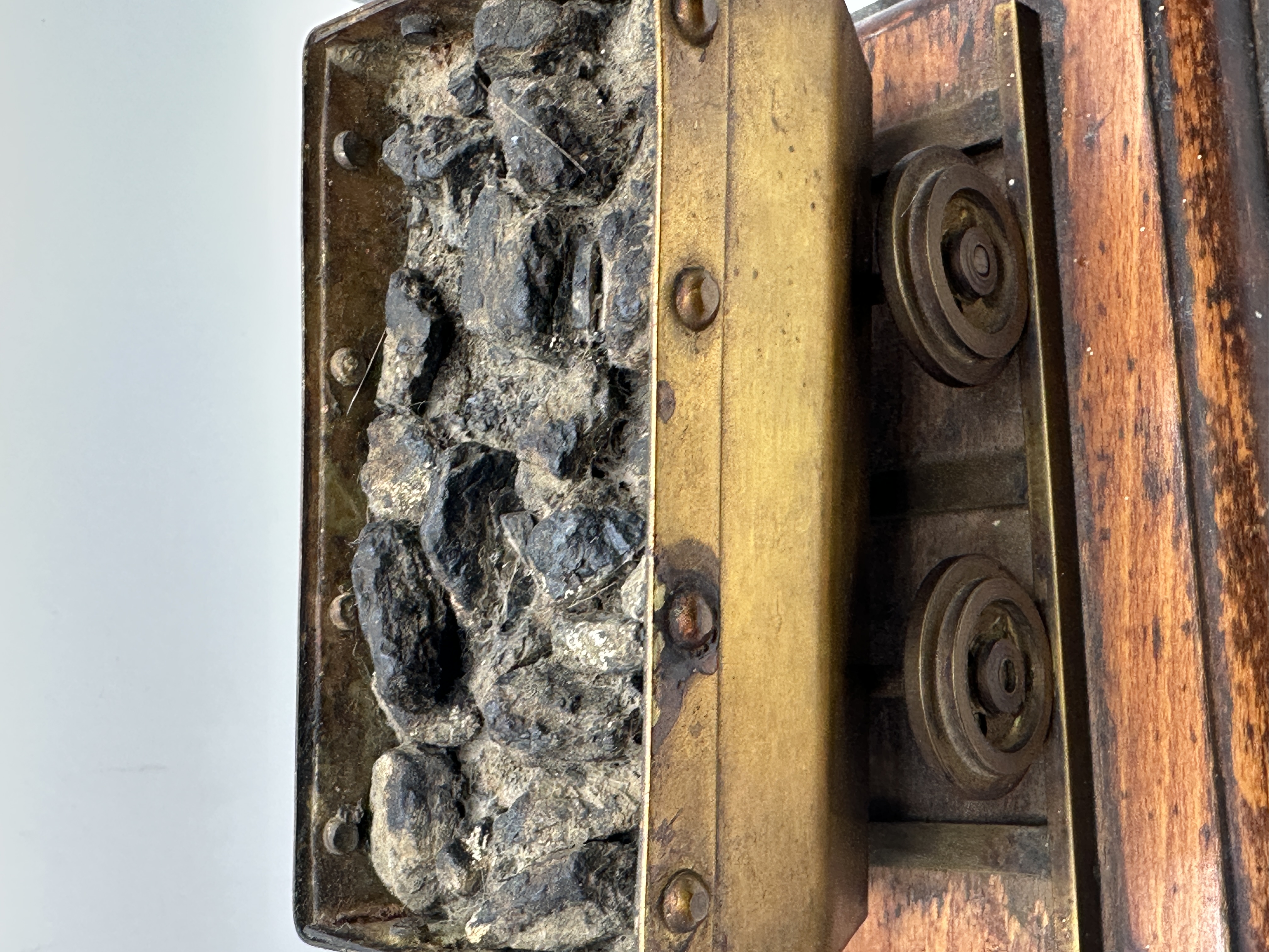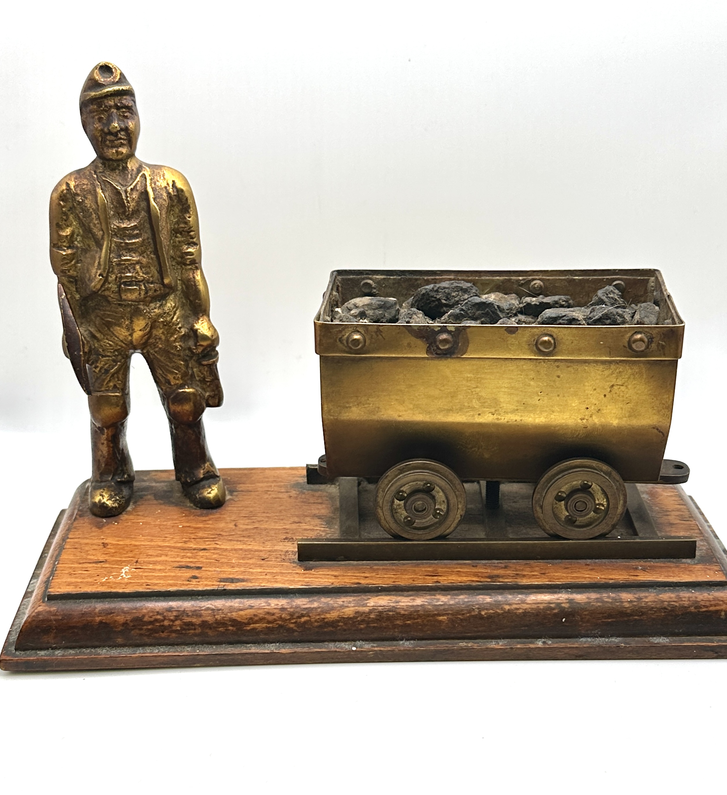 A decorative cast brass model depicting a Welsh miner standing beside a coal truck. The miner is rendered in traditional work attire, including a cap and a handheld tool. The coal truck features rivet detailing and is filled with small fragments of natural coal, set upon a short section of metal tracks. The entire assembly is mounted on a rectangular bevelled wooden plinth. The metal components exhibit a golden-toned finish with an aged patina.