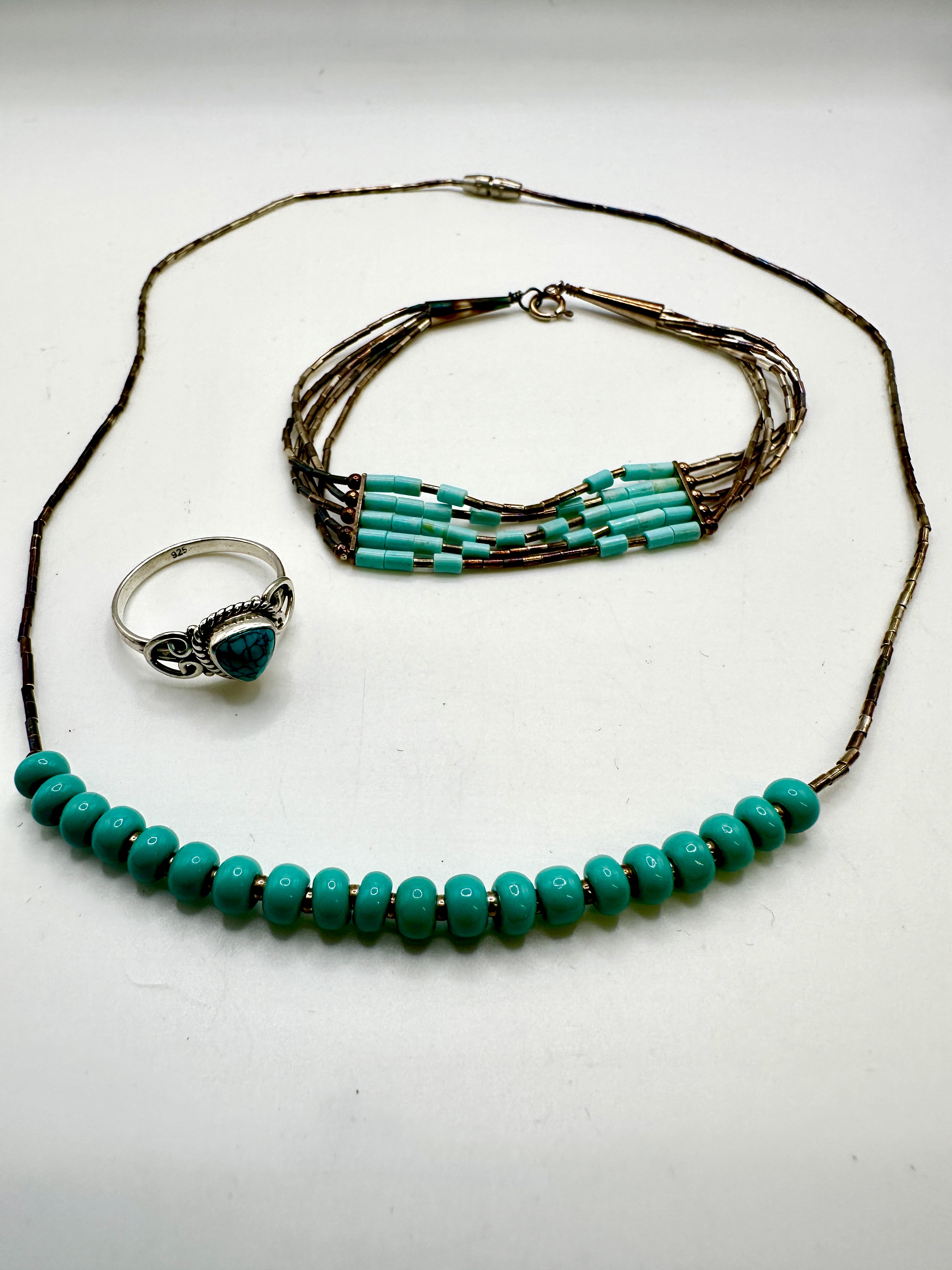 A trio of jewellery items comprising a necklace, a bracelet, and a ring, all featuring 925 silver components and turquoise-coloured beads. The single-strand necklace is composed of cylindrical 925 silver beads with a central section of round turquoise-coloured beads, finished with a barrel clasp. The multi-strand bracelet consists of several rows of liquid silver-style 925 silver beads accented with cylindrical turquoise-coloured beads, secured with tapered metal end caps and a spring ring clasp. The 925 silver ring features a triangular turquoise-coloured stone set within a decorative bezel and is stamped 925 on the inner band.