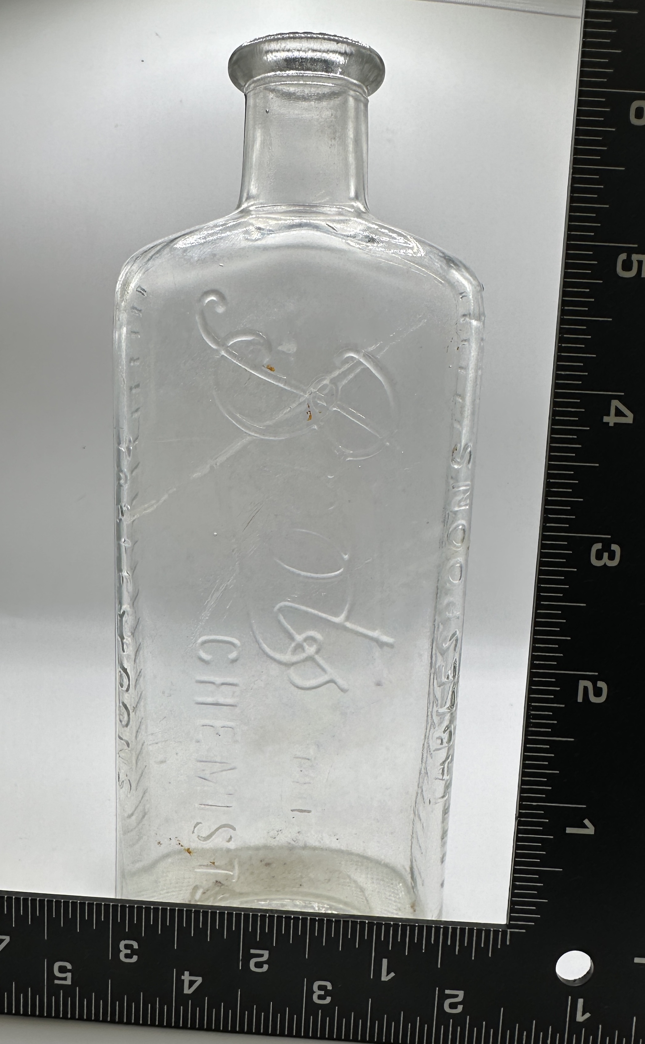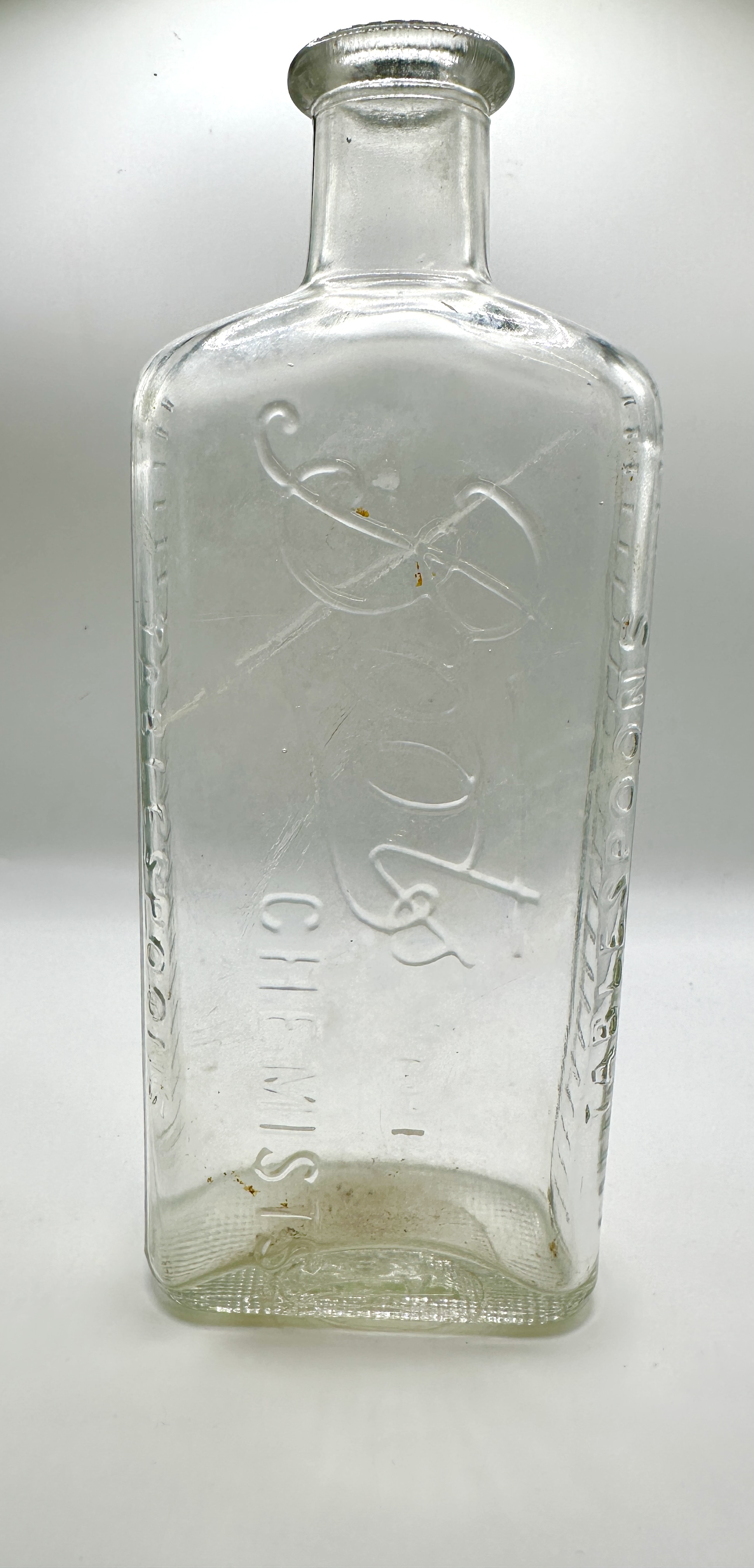 An antique clear glass apothecary bottle produced for Boots Chemists. The vessel is of rectangular form with rounded shoulders and a wide, flanged lip. The front face features the embossed Boots signature script above the word CHEMISTS in block lettering. The lateral panels are marked with embossed measurement graduations for TABLESPOONS. The underside of the base exhibits a textured, cross-hatched pattern.