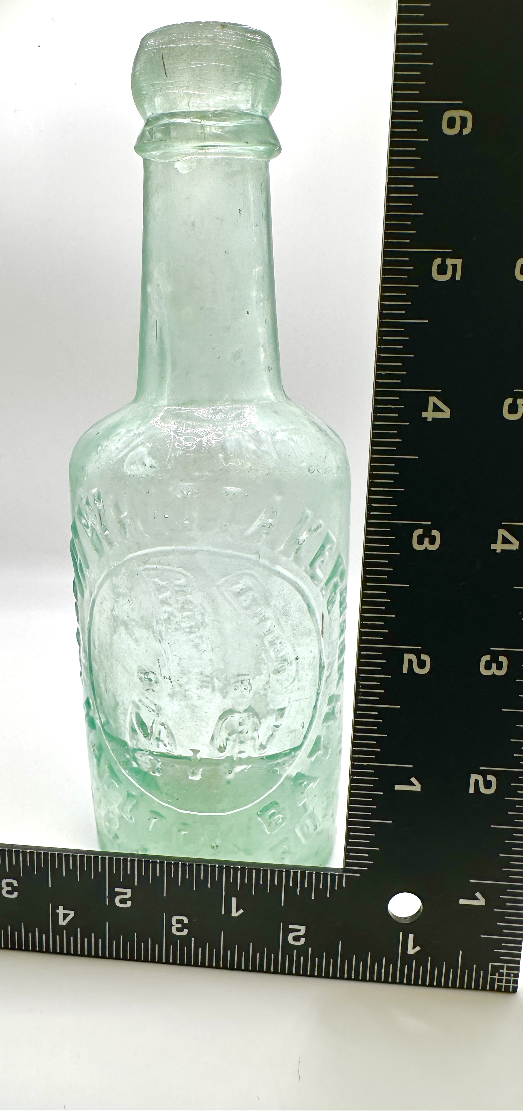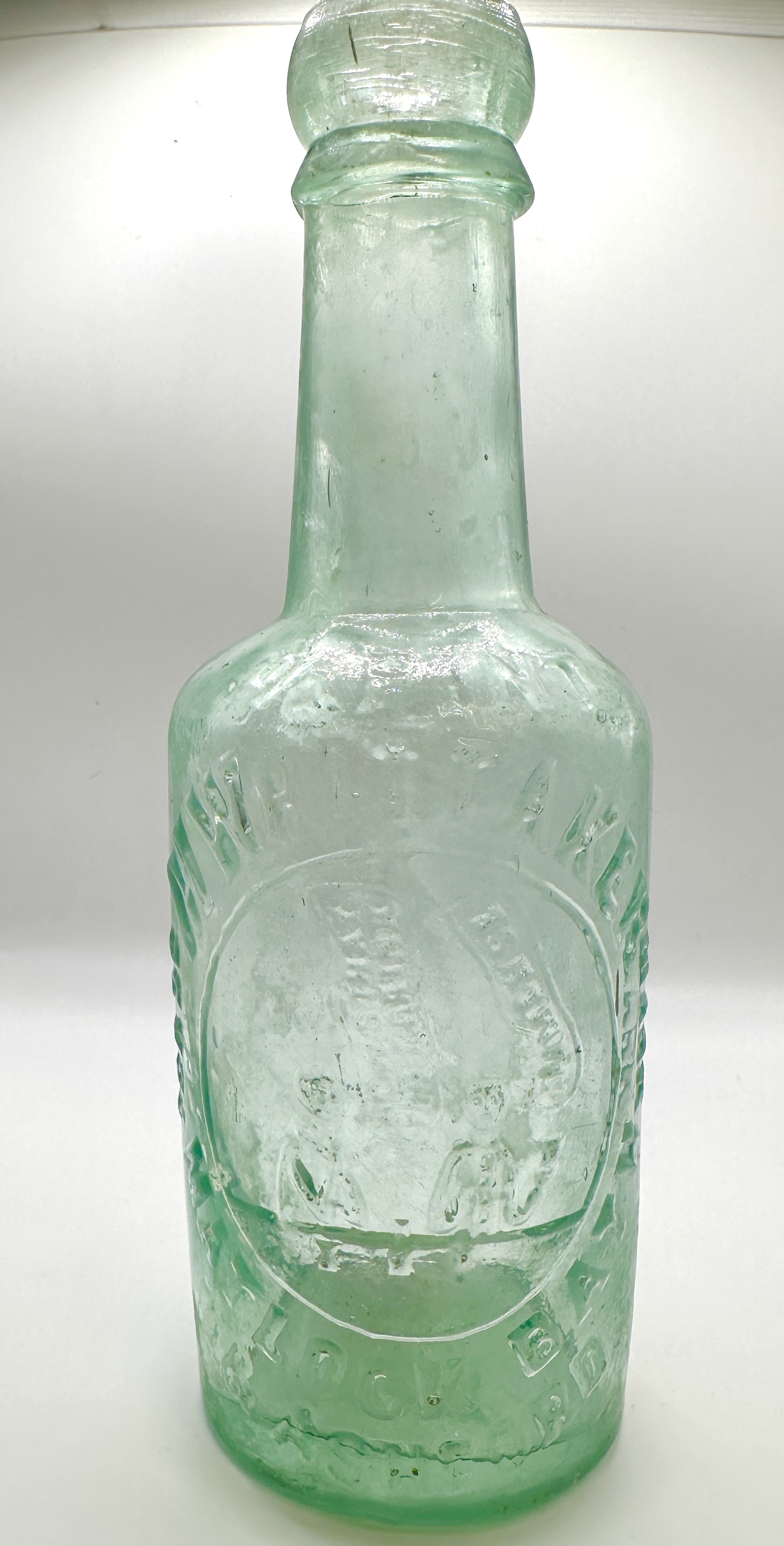 An antique aqua glass bottle produced for Whittaker, Elsa Block Ltd of Barrow-in-Furness. The vessel is constructed from mould-blown glass featuring a rounded finish lip. The body is heavily embossed with a central circular medallion depicting two seated figures under banners reading Chartreuse and Liqueur. Arched above the medallion is the name Whittaker, with the lower section embossed with Elsa Block Ltd and Barrow-in-Furness.
