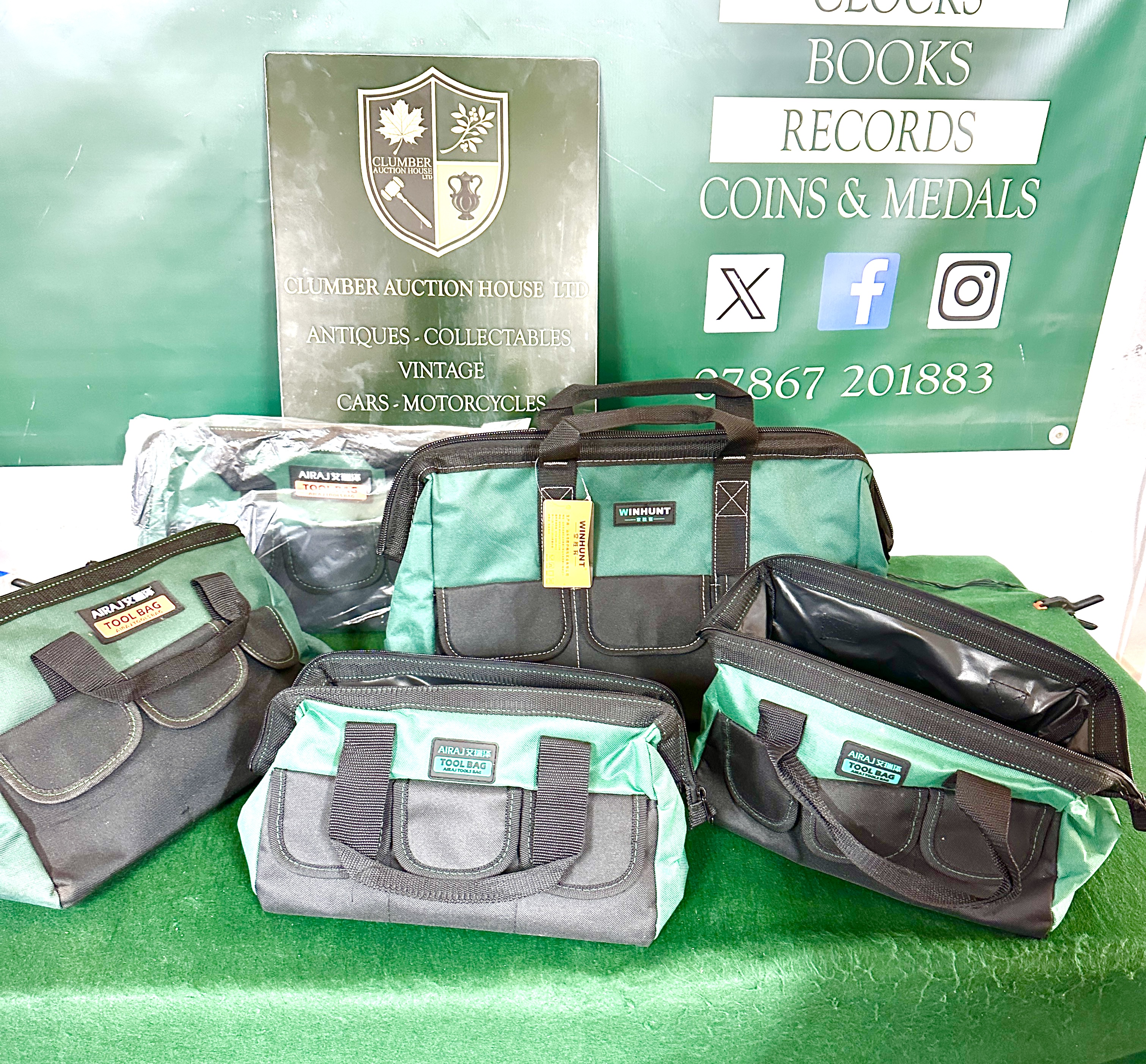 A collection of heavy duty soft-sided tool bags manufactured by AIRAJ and WINHUNT. The bags are constructed from a durable green and black synthetic Oxford cloth with reinforced webbing handles and wide-mouth main compartments. Each bag features multiple external storage pockets with hook-and-loop closures. Branding is present across the items, including labels for AIRAJ (艾瑞泽) and WINHUNT (常胜客). The collection includes various sizes designed for portable tool storage and organisation.