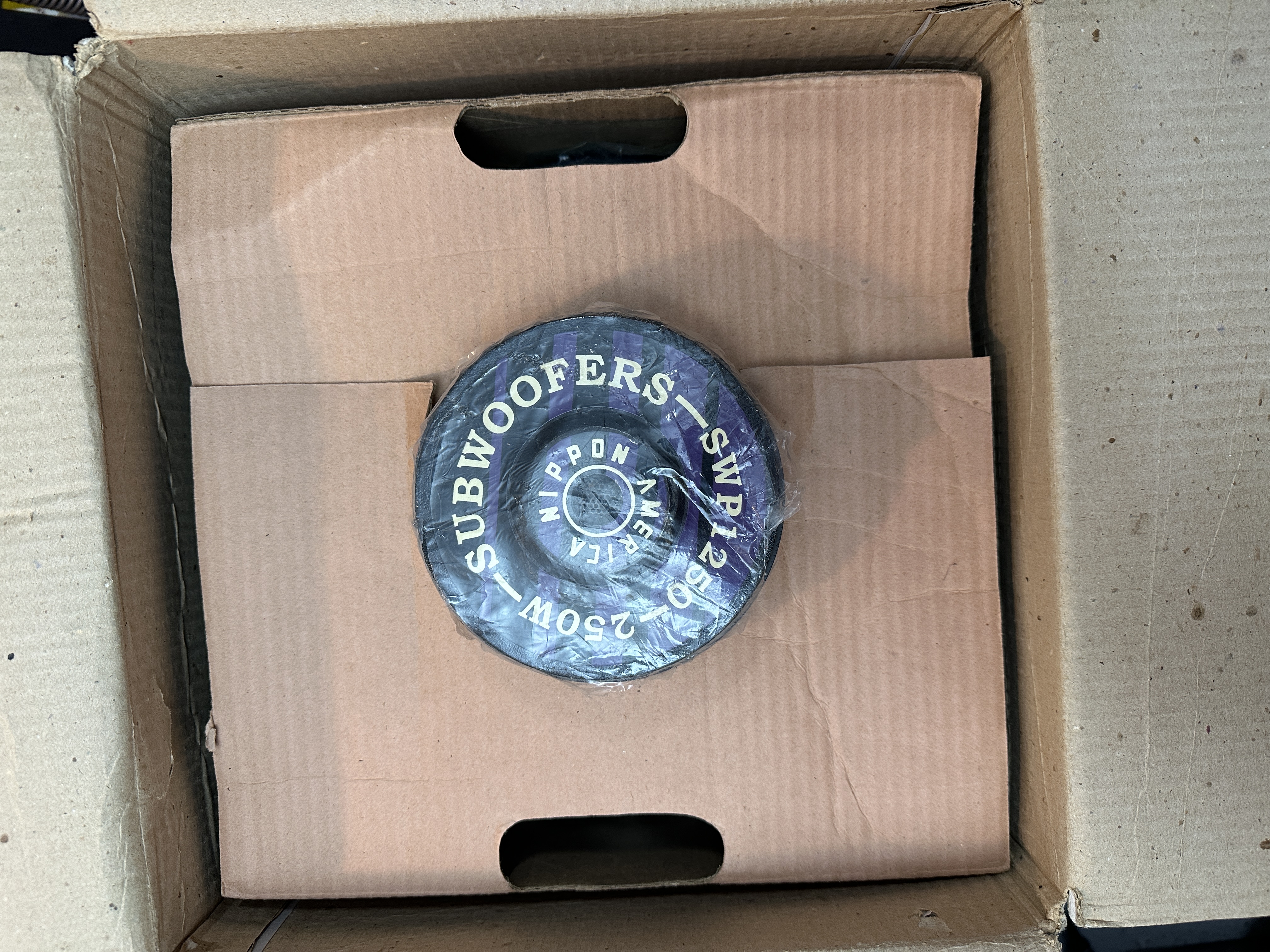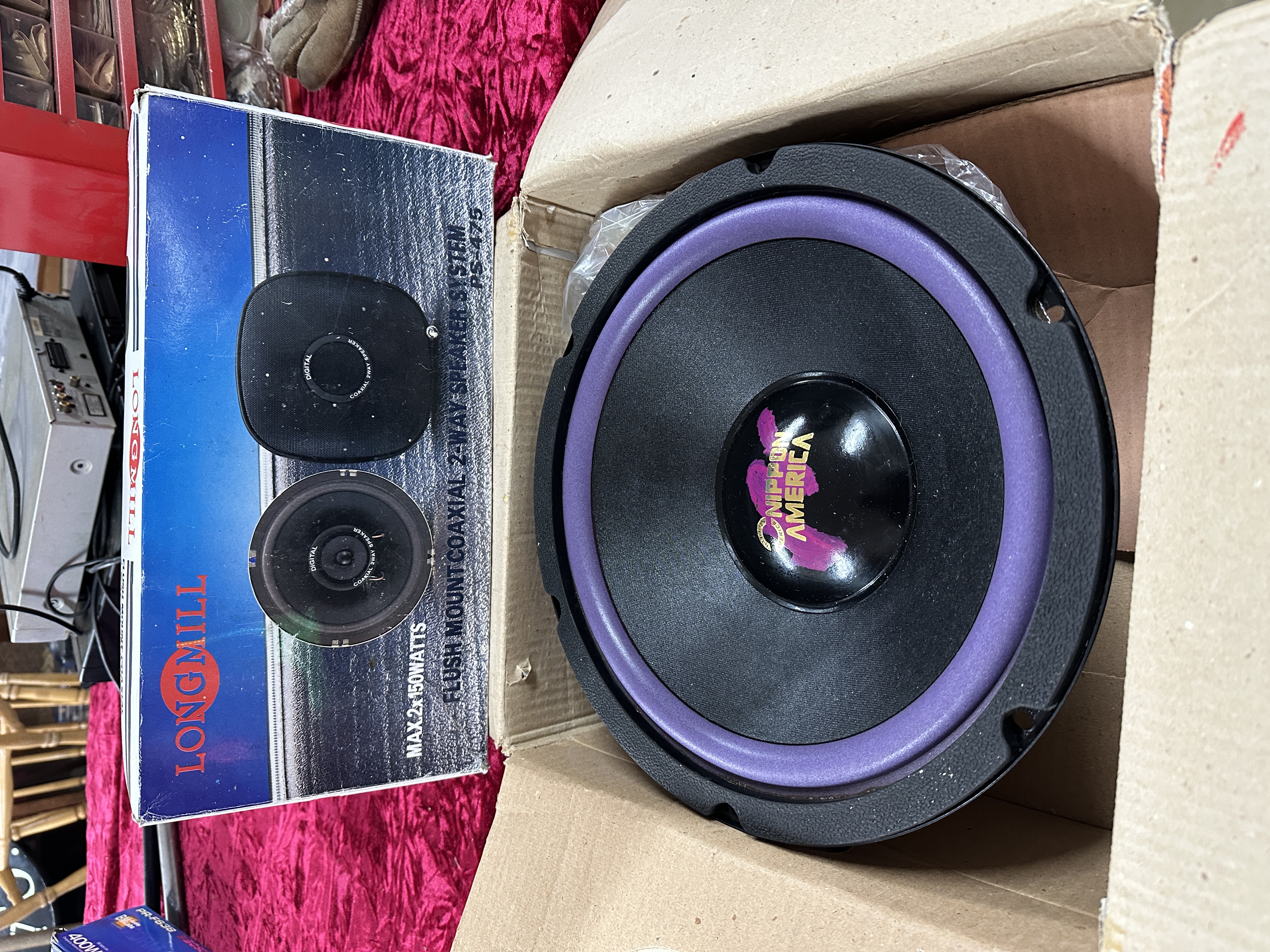 A collection of car audio equipment comprising a Longmill PS-475 flush mount coaxial 2-way speaker system and a Nippon America SWP1250 subwoofer. The Longmill system is housed in its original retail packaging, which specifies a maximum power output of 2×150 watts. The box displays images of round speaker units and square grilles. The Nippon America subwoofer, model SWP1250, is rated at 250W and features a black cone with a purple surround and a central dust cap bearing the manufacturer’s logo. It is contained within a retail box for a Super Pro Competition Series 400W system.