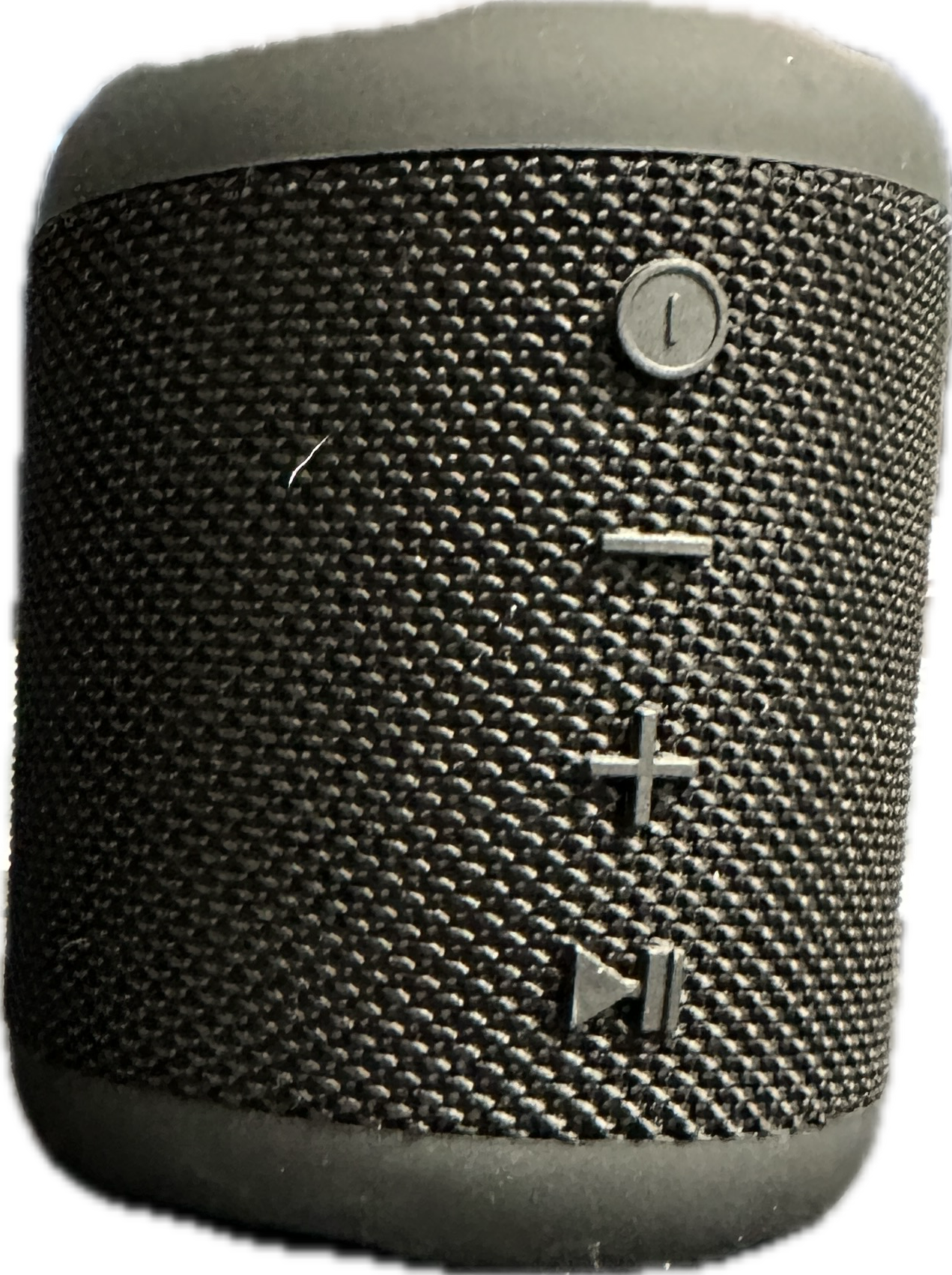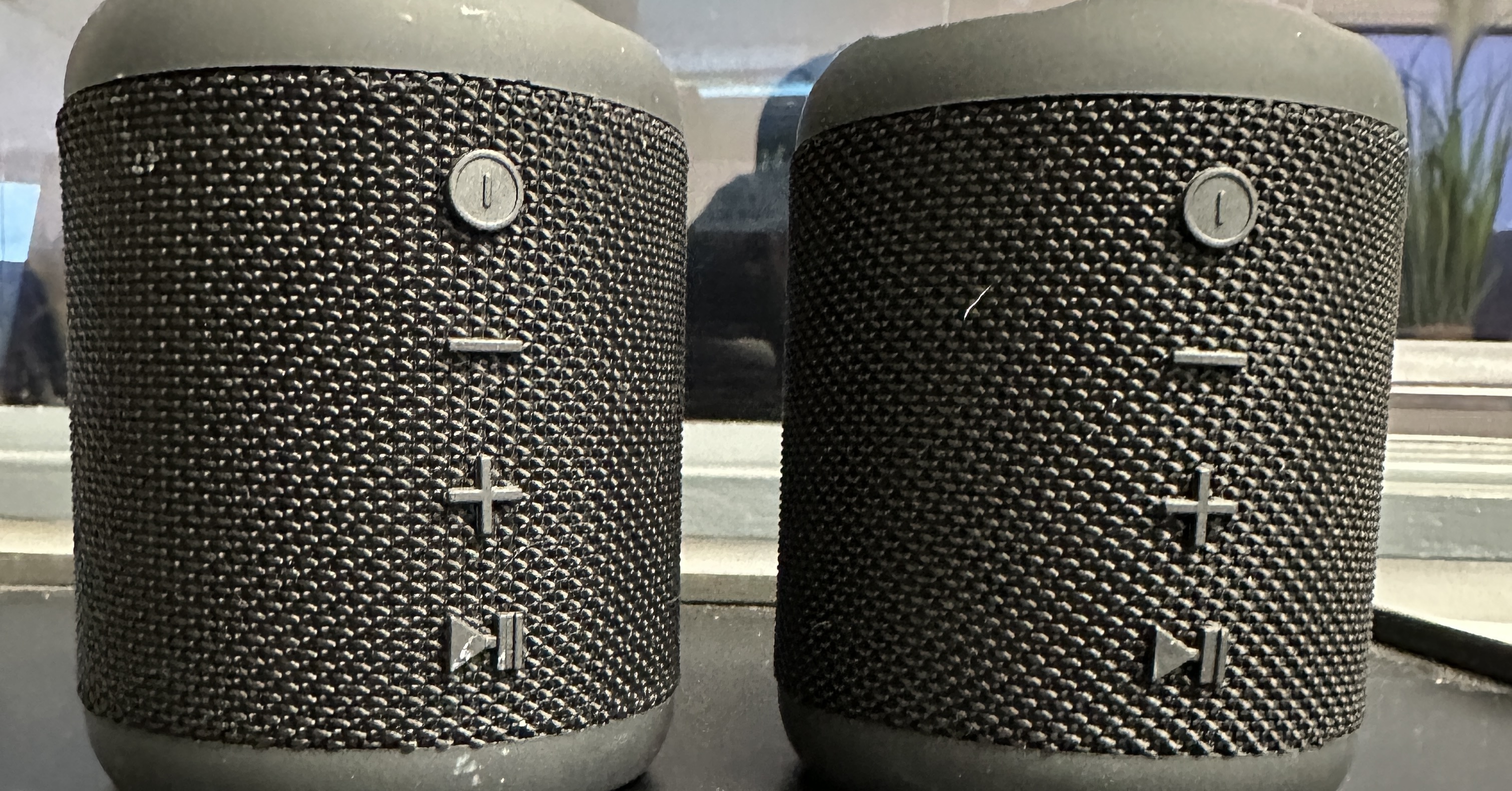 A pair of Daewoo True Wireless Fabric Bluetooth speakers. Each unit features a cylindrical design encased in a black woven fabric mesh with a rubberised exterior casing. The speakers are configured with integrated vertical controls including a power button, volume adjusters, and a play/pause function. Accompanying documentation includes a Daewoo Electricals guarantee sheet, specifying the items were produced and imported under licence by ESG Ltd, Manchester.