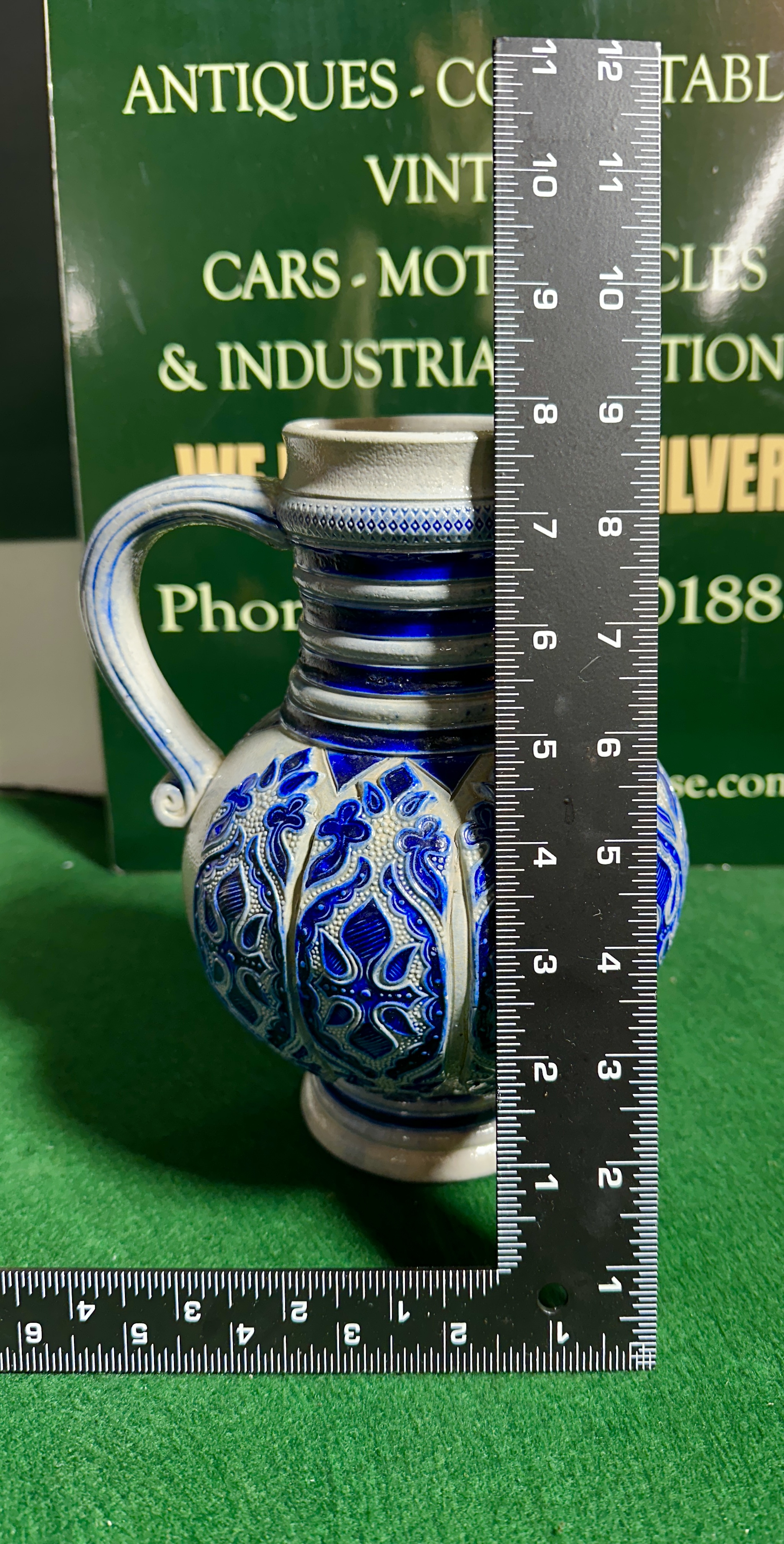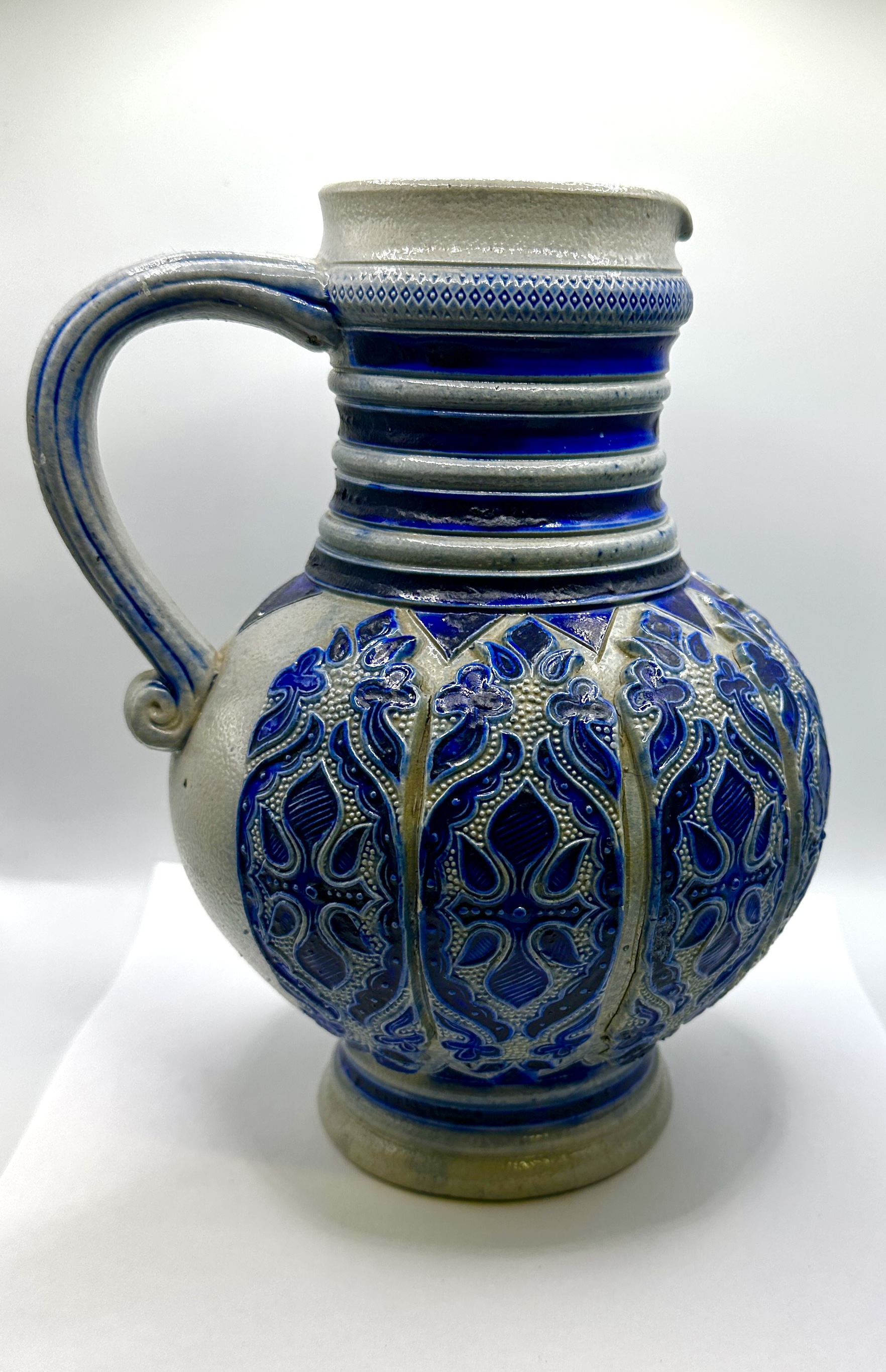 A salt-glazed stoneware jug of Westerwald origin. The vessel features a bulbous body decorated with relief-moulded floral and foliate motifs highlighted in cobalt blue slip. The light grey, pebbled surface is accented by horizontal ribbing around the neck and a geometric diamond-patterned band. The jug includes a single ribbed handle with a scrolled terminal and a small pinched spout at the rim. The underside shows an irregular unglazed foot and lacks maker’s marks.
