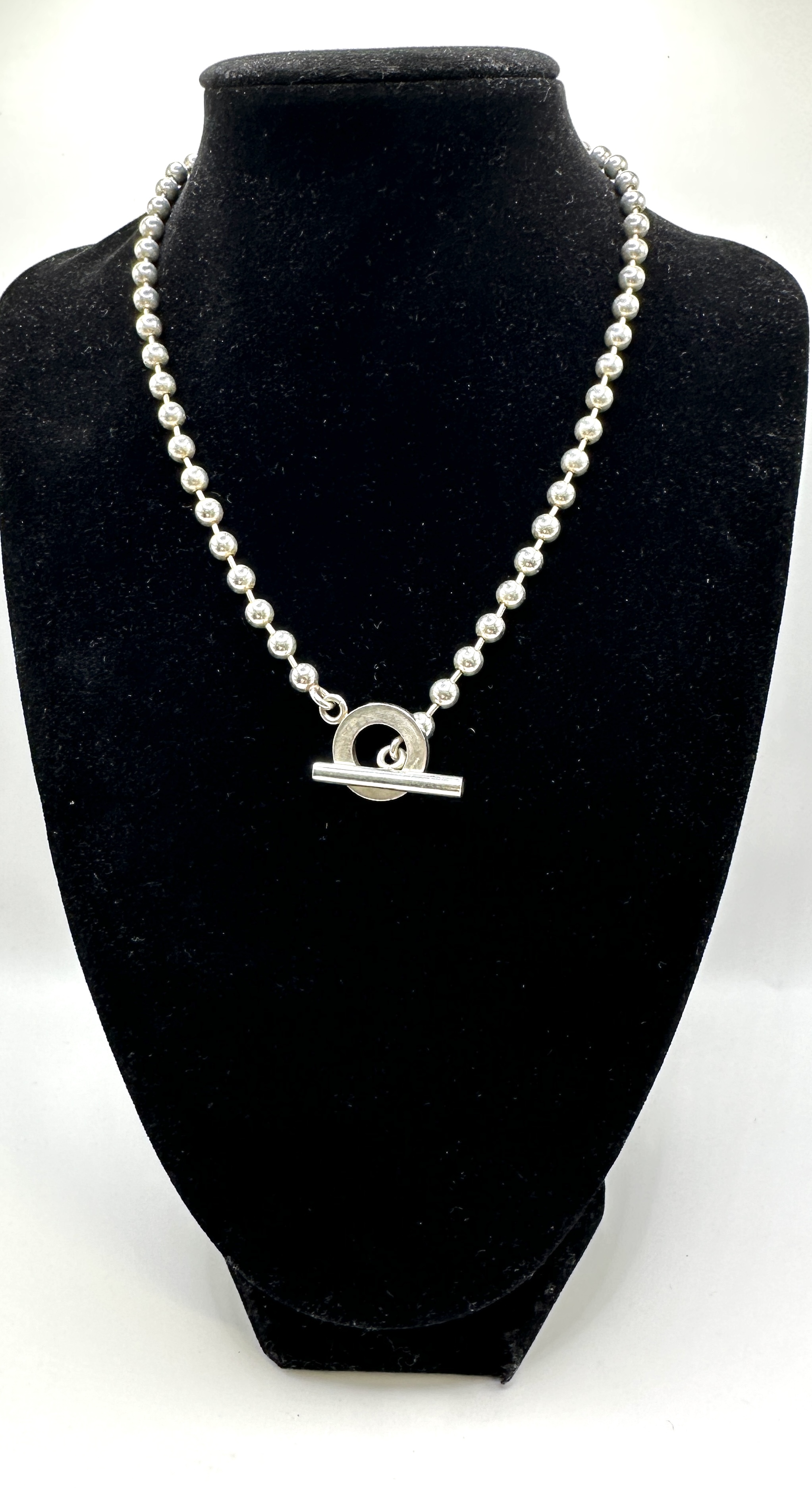A Gucci Boule beaded necklace constructed from 925 silver. The design features a spherical ball-chain and a toggle clasp closure. The circular component of the clasp is engraved with the Gucci brand name. This lot includes the original packaging consisting of a dark brown GG-monogrammed velvet dust bag, a Gucci brand card, and a branded presentation box.