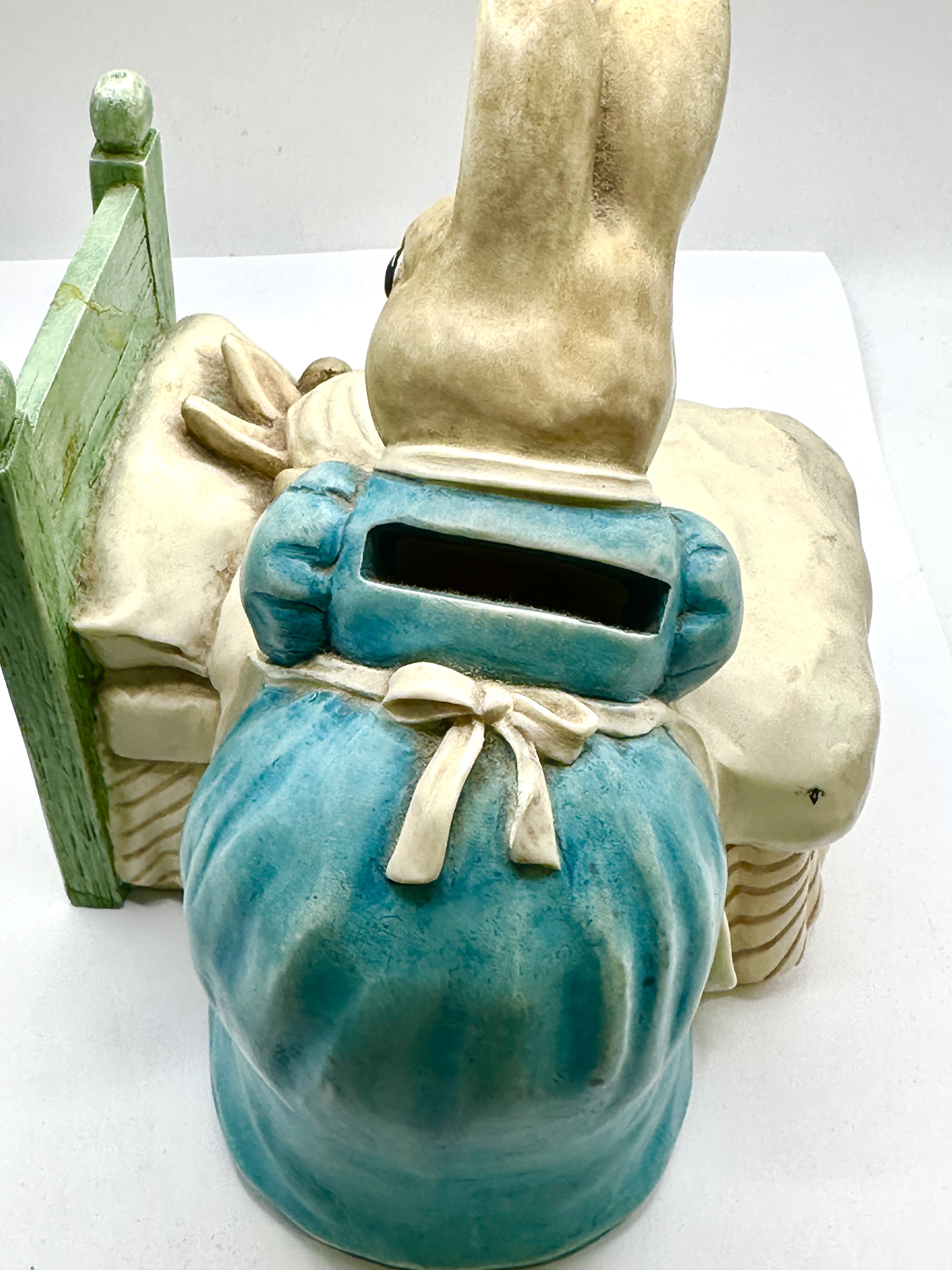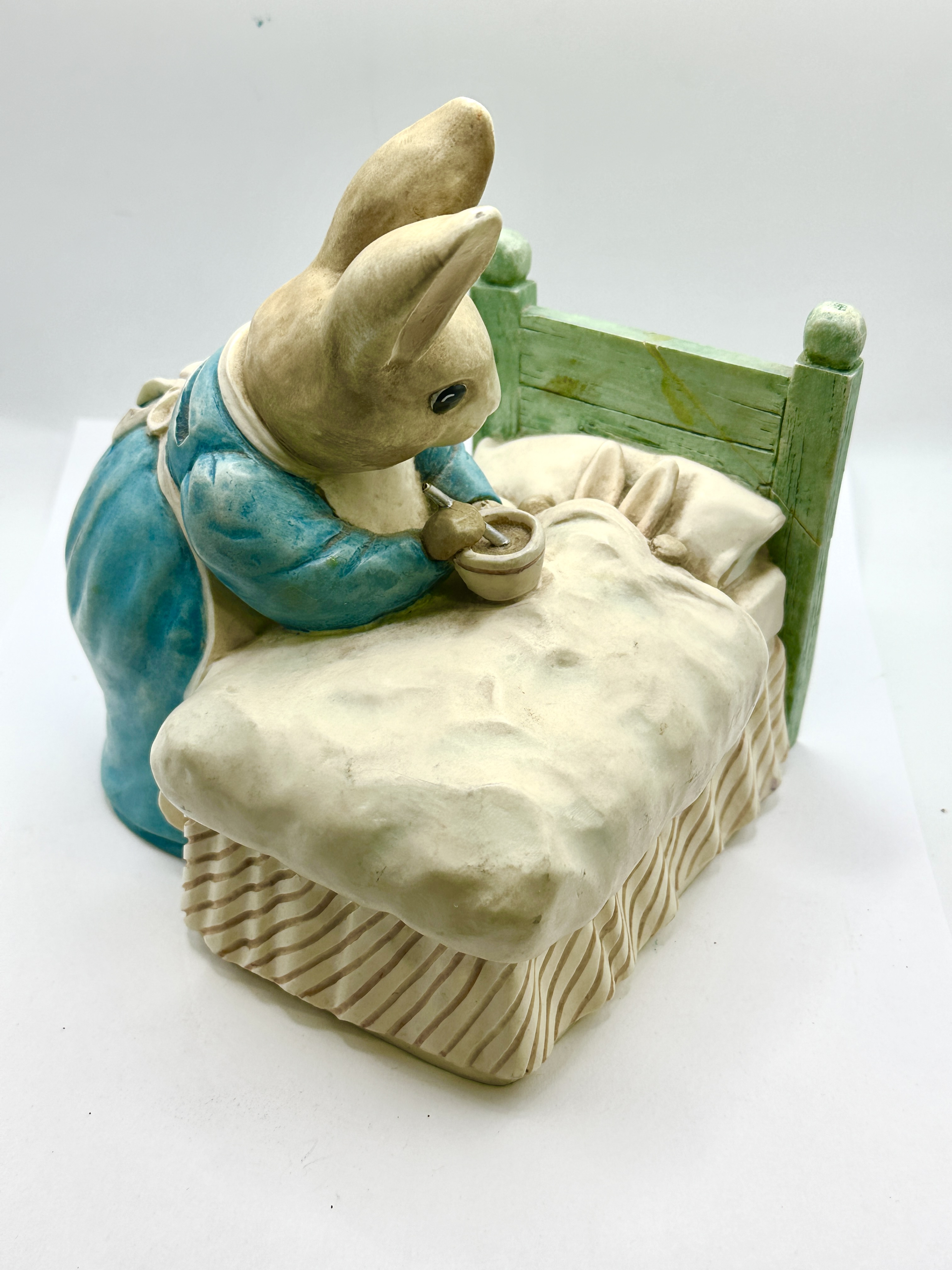A figural money box designed by The Border Fine Arts Studios and licensed by Frederick Warne and Co. based on the classic illustrations by Beatrix Potter. The piece is crafted from painted resin and depicts the character Mrs. Rabbit tending to Peter Rabbit in bed. Mrs. Rabbit is shown wearing a blue dress and white apron, holding a bowl and spoon while leaning over a small rabbit tucked under a white blanket. The bed features a green headboard and a striped bed skirt. A horizontal coin slot is located on the back of the standing figure. The base retains its original plastic stopper and bears printed copyright information for Frederick Warne and Co. 1994, the model number 282820, and a China origin mark.