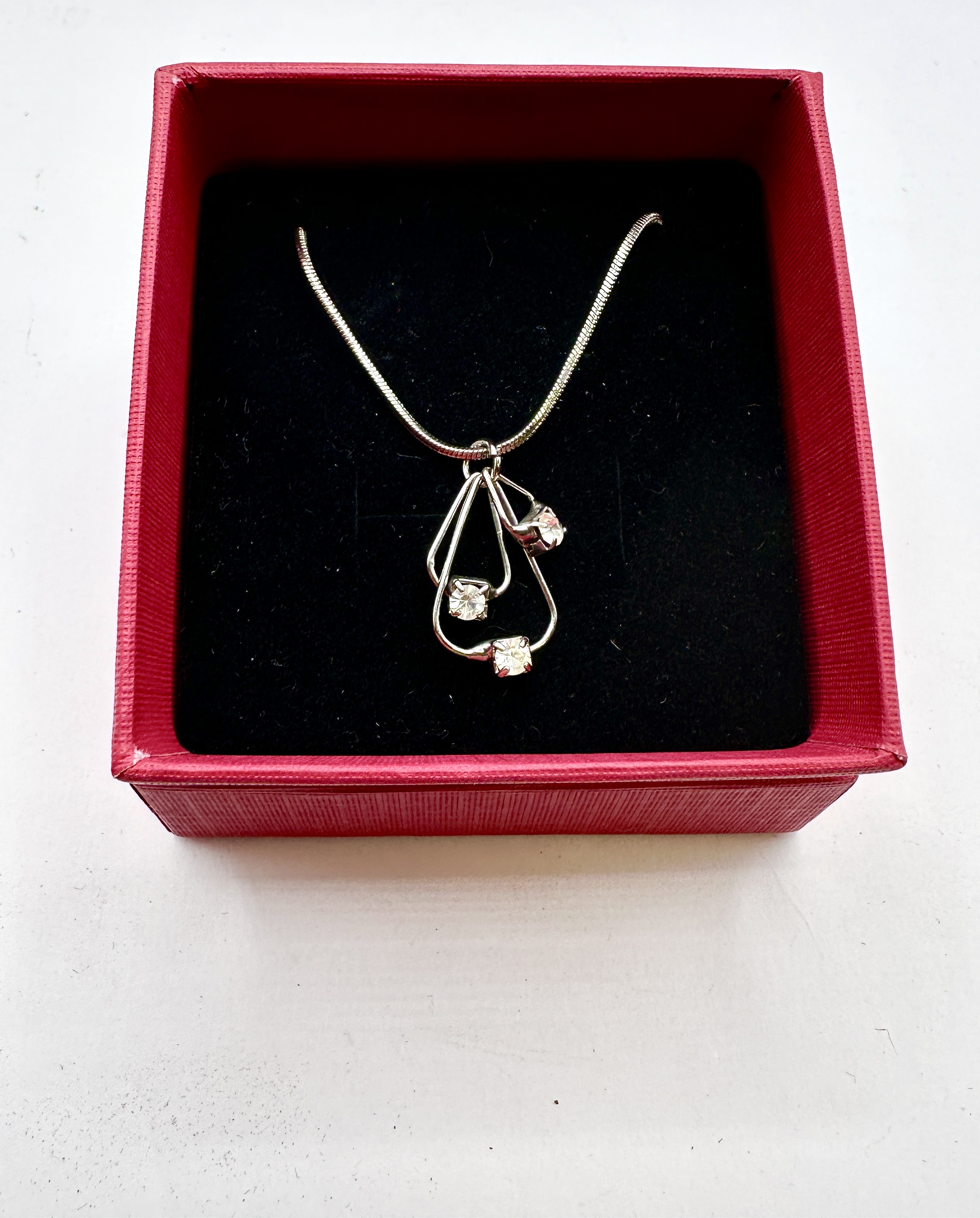 A contemporary sterling silver pendant necklace featuring an abstract openwork design. The pendant is constructed with overlapping stylised loops, housing three prong-set clear faceted stones of varying sizes. The pendant is suspended from a fine silver snake chain. The piece is presented in a red textured presentation box with a black flocked interior. No hallmarks or maker’s marks are visible.