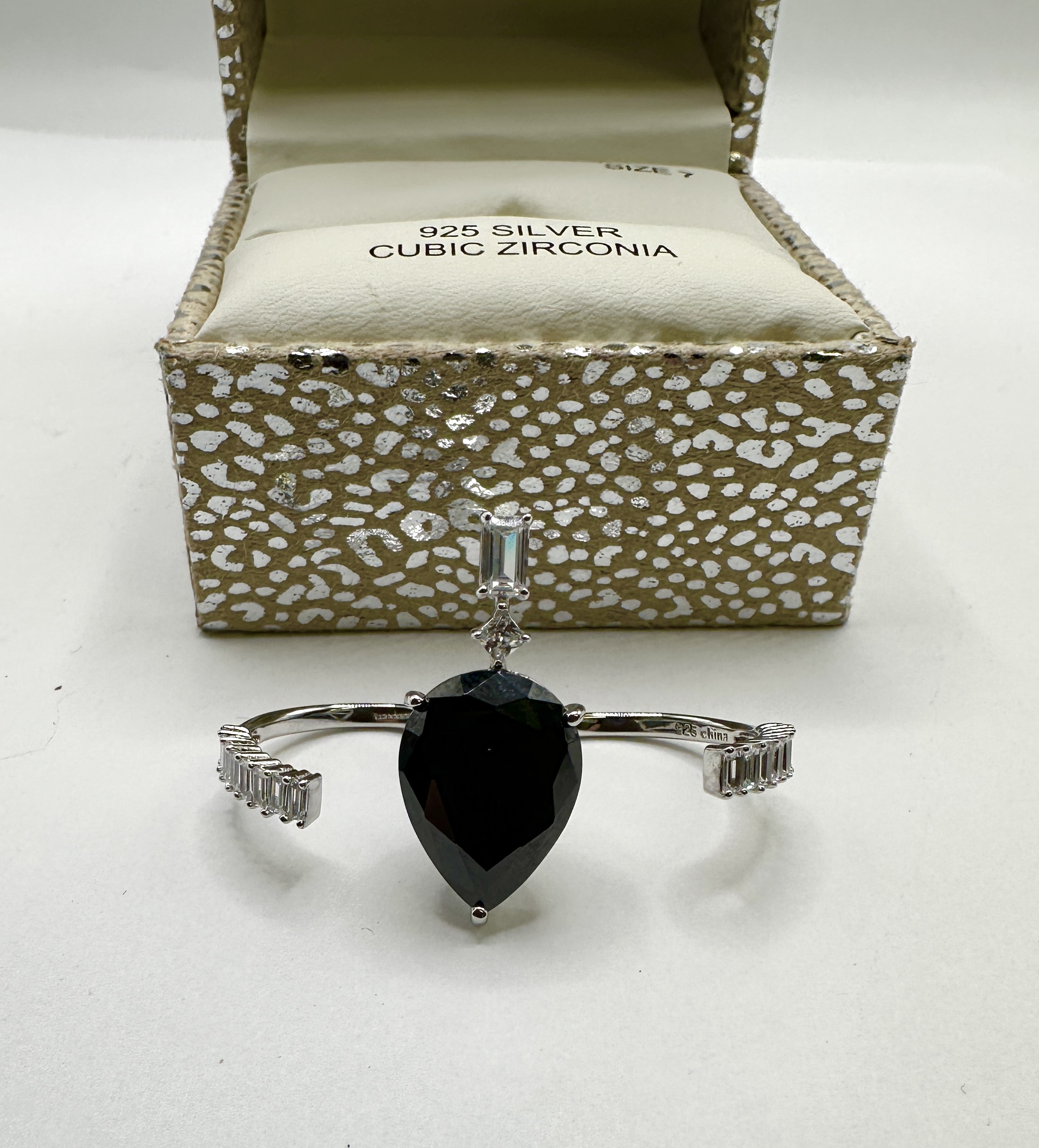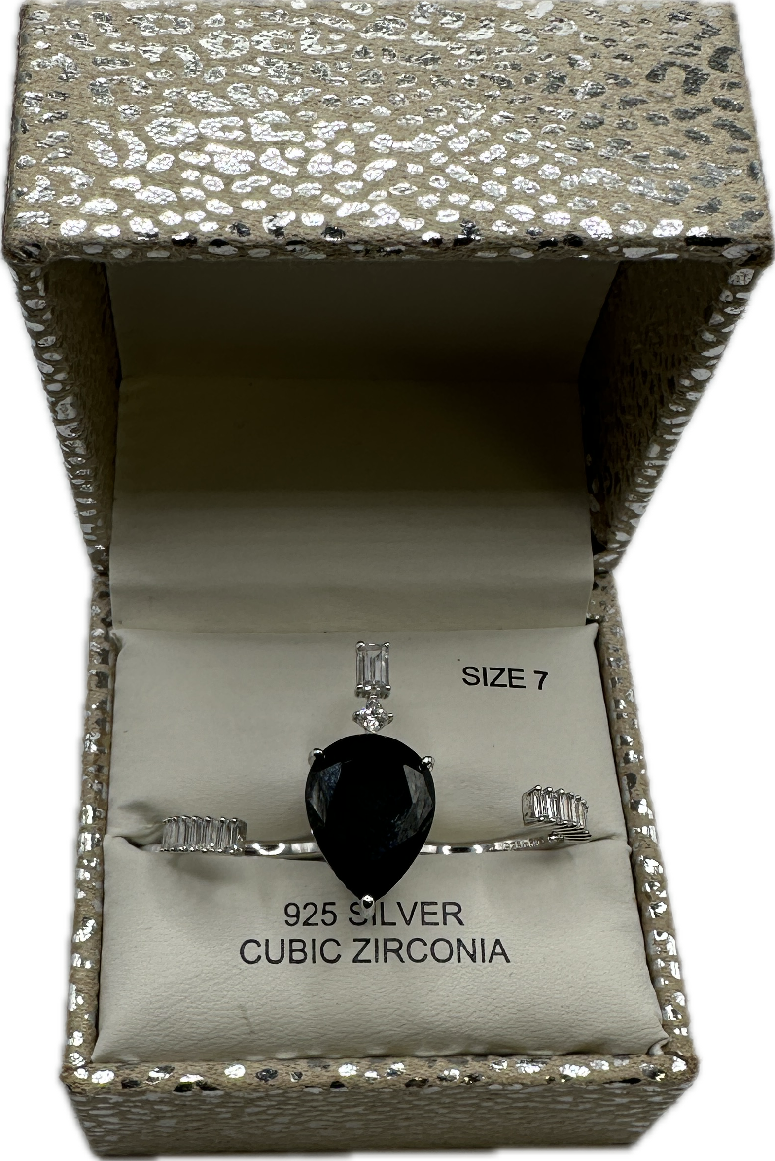 A 925 silver fashion ring featuring a prominent pear-shaped faceted black cubic zirconia centre stone. The piece is designed with an open-shank two finger band, accented with clear baguette-cut cubic zirconia at each terminal. An additional vertical baguette and small round stone setting are positioned above the primary stone. The interior of the band is stamped 925 China. The item is accompanied by a metallic silver leopard-print hinged box labelled 925 SILVER, CUBIC ZIRCONIA, and SIZE 7.