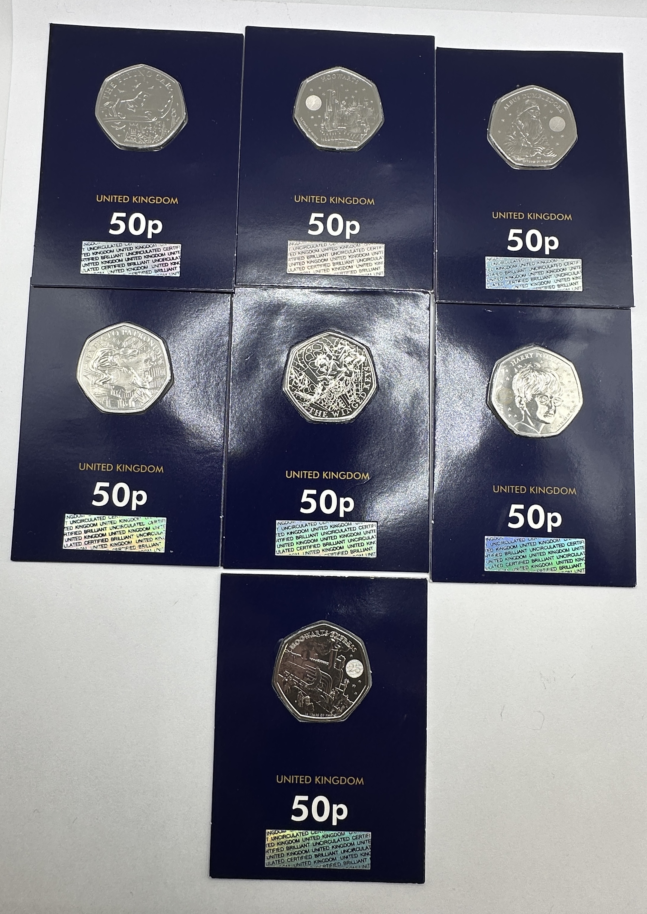 A collection of United Kingdom 50p coins produced by the Royal Mint to commemorate the Harry Potter series. Each cupro-nickel coin is mounted on a navy blue card issued by The Westminster Collection, featuring the inscription UNITED KINGDOM 50p. The designs include Harry Potter, Albus Dumbledore, Hogwarts School of Witchcraft and Wizardry, the Hogwarts Express, the Flying Car, the Winged Keys, and the Patronus. Each pack is fitted with a holographic security label certifying the coin as a Brilliant Uncirculated specimen.