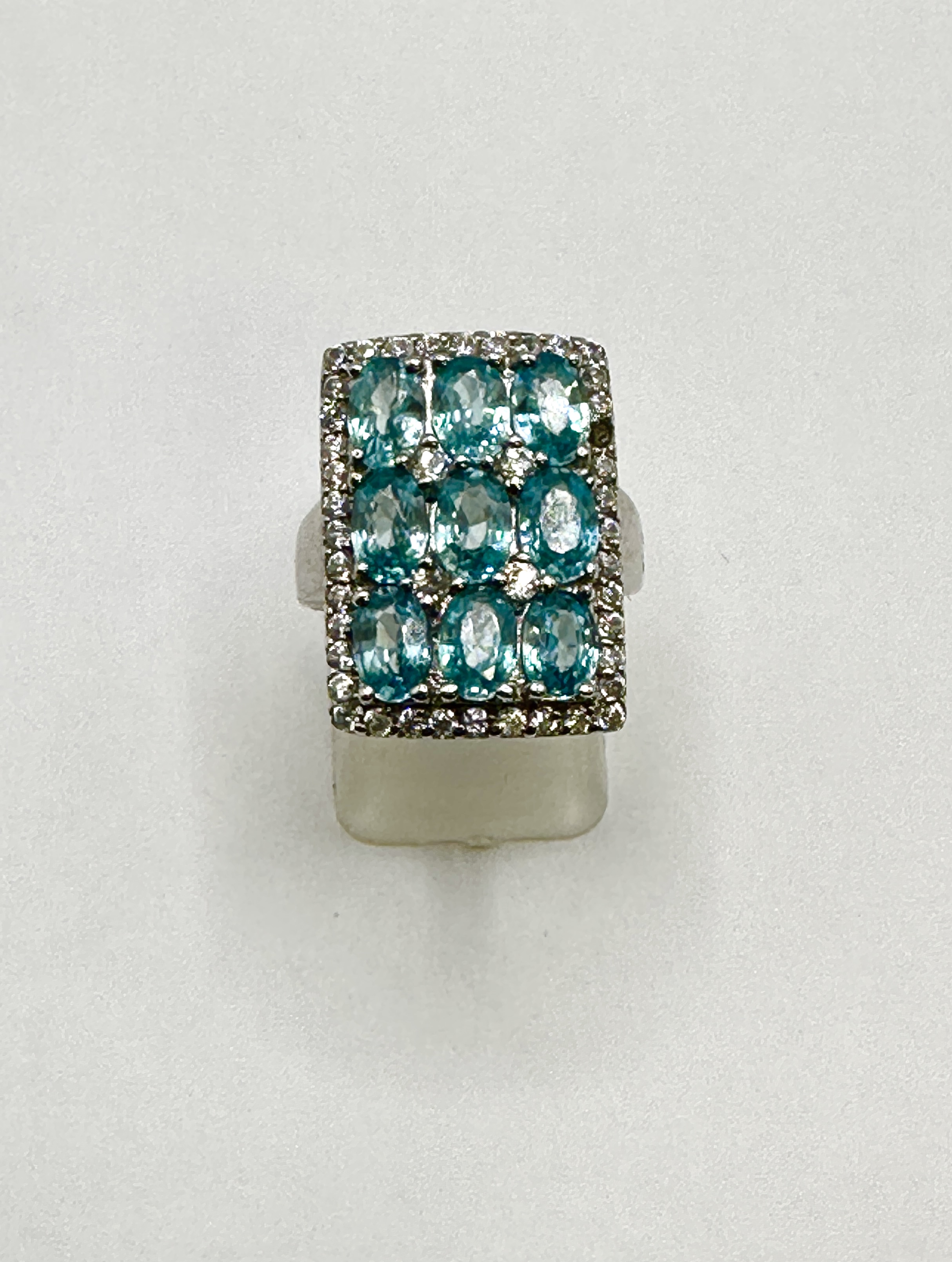 A contemporary cocktail ring featuring a rectangular head set with a cluster of nine oval-cut Cambodian blue zircons. The central stones are bordered by a halo of small, round-cut white zircons. The piece is constructed from 925 silver with the gemstones held in multi-prong settings atop a tapered band.