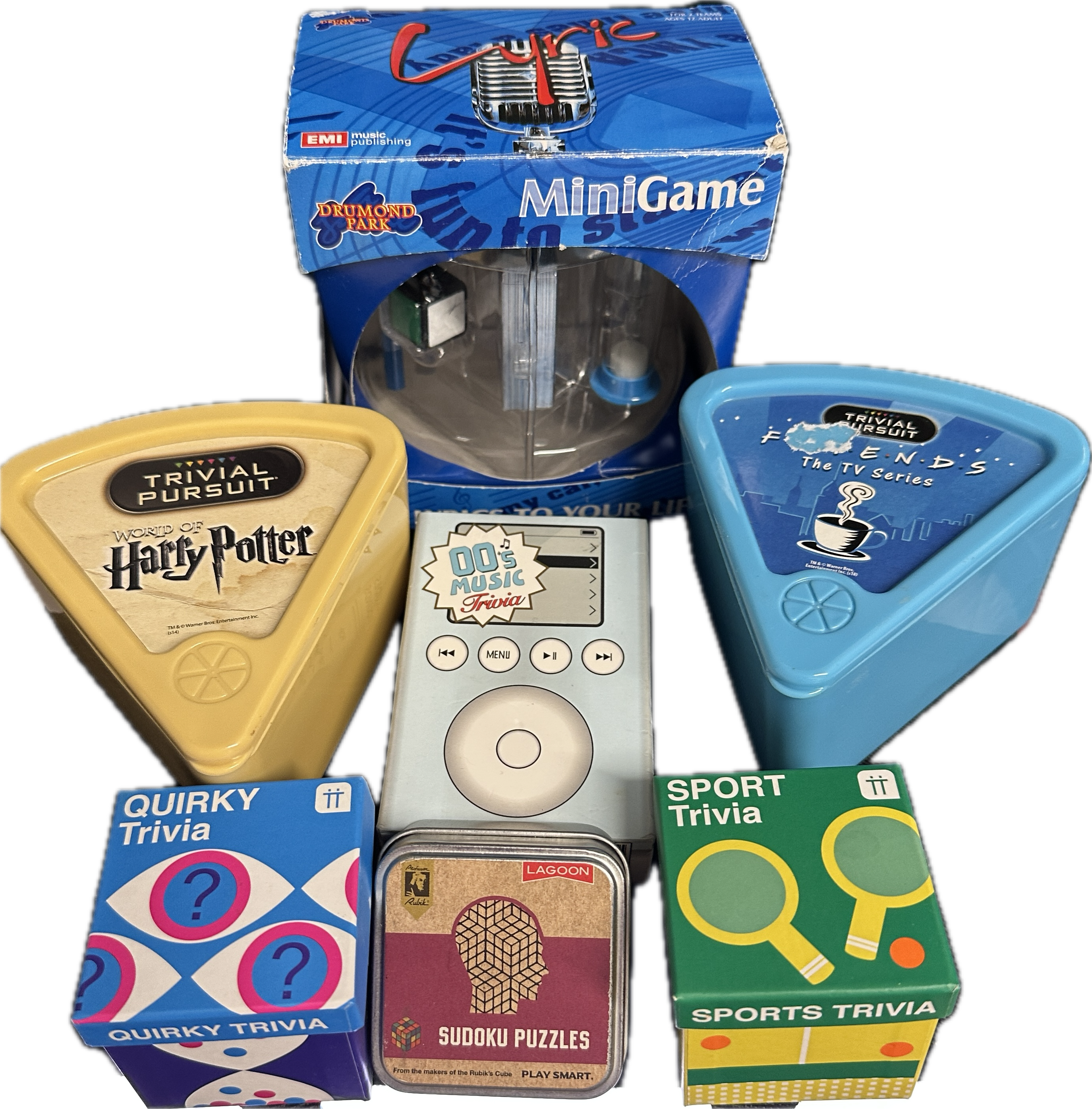 A group of contemporary trivia games and puzzles featuring various titles and formats. The collection includes Trivial Pursuit travel editions such as World of Harry Potter in a yellow wedge-shaped plastic container and Friends The TV Series in a blue wedge-shaped plastic container. Also included is a Drummond Park Lyric MiniGame housed in its original blue cardboard and plastic retail packaging, featuring EMI Music Publishing branding. The lot further contains small boxed trivia sets, including 00’s Music Trivia designed in the style of a portable media player, Quirky Trivia, and Sports Trivia. A Sudoku Puzzles set by Lagoon is contained within a metal tin. Materials primarily consist of cardboard, plastic, and metal.