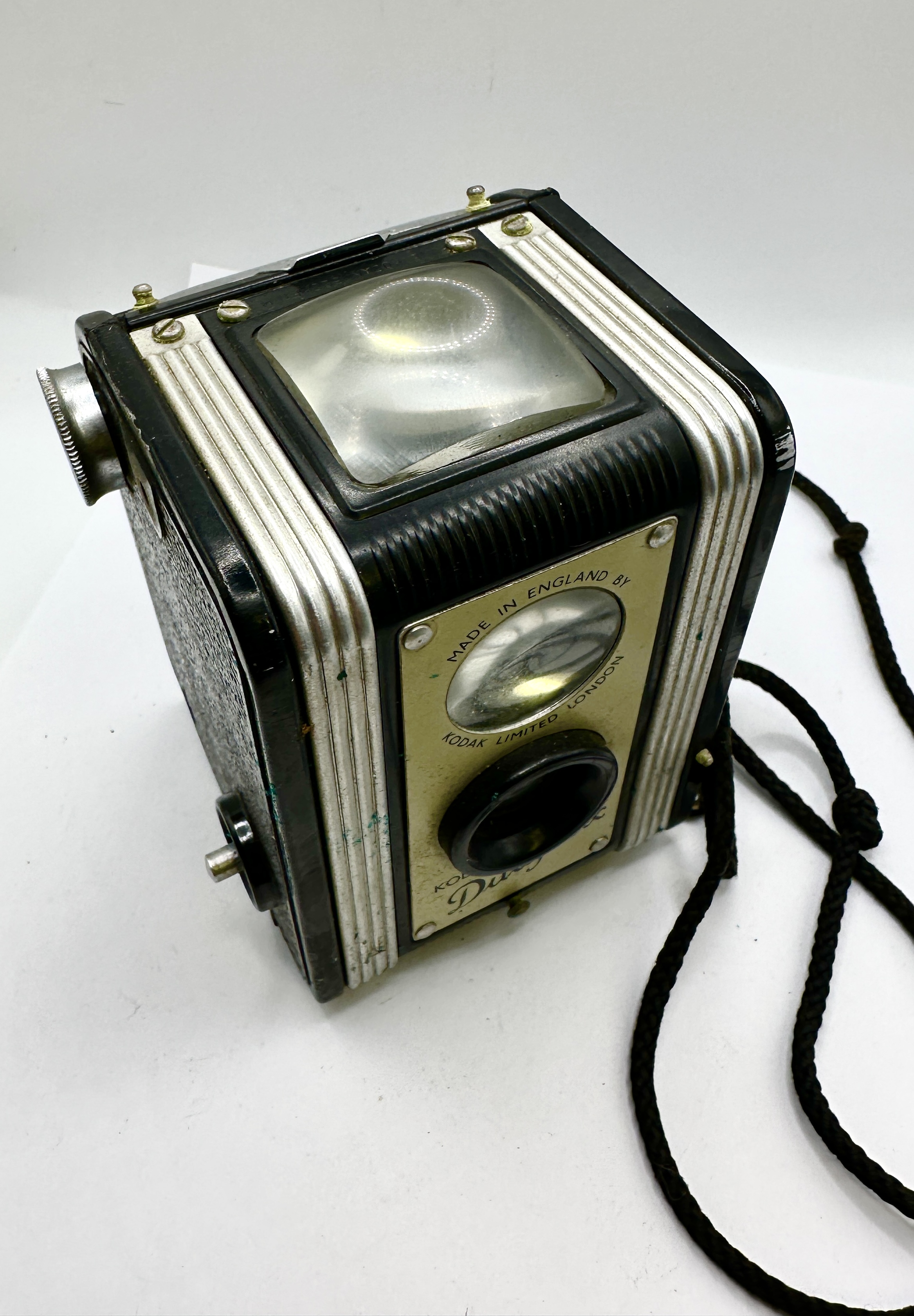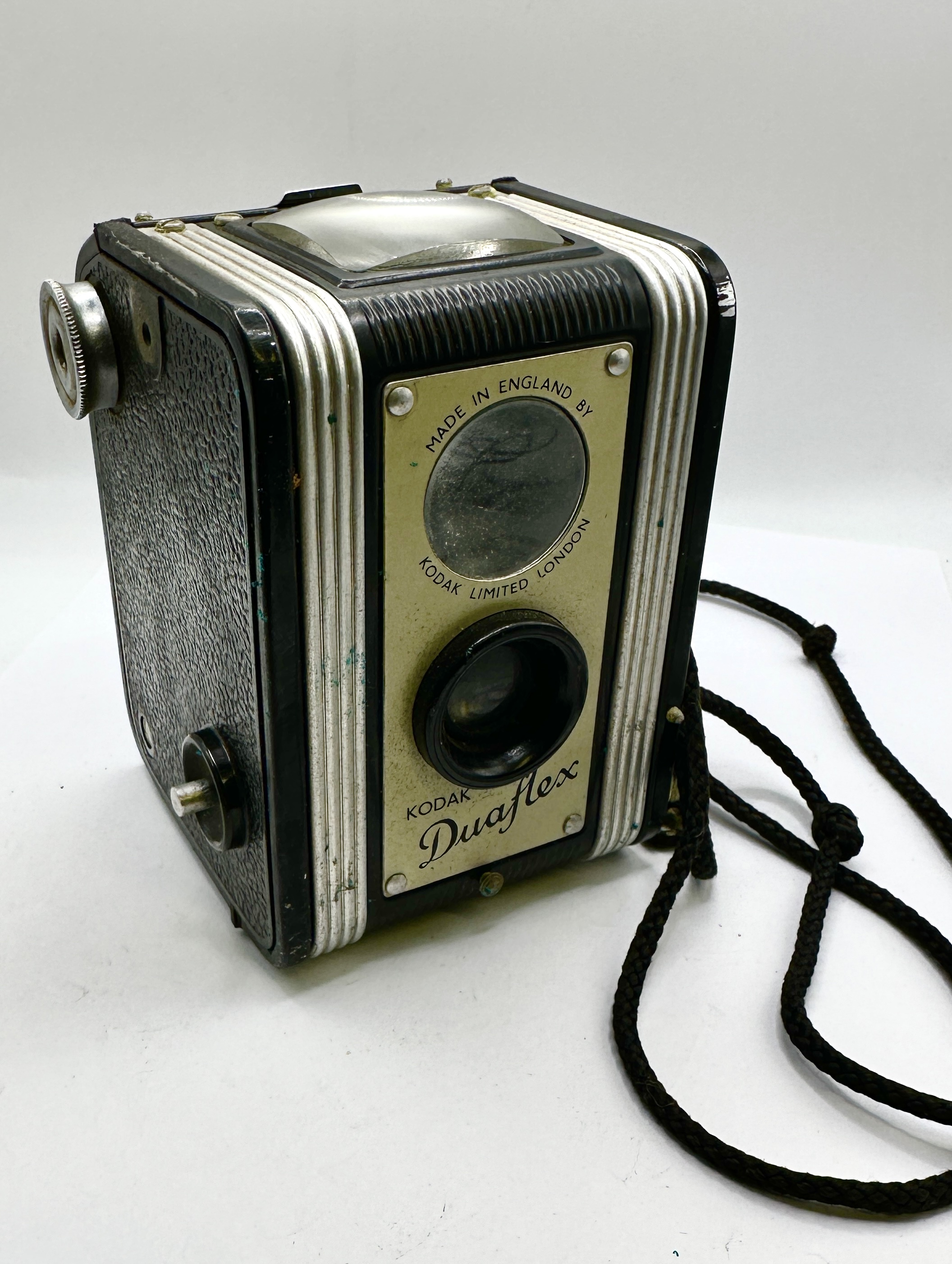A mid-20th-century Kodak Duaflex pseudo-TLR camera manufactured by Kodak Limited in London. The camera features a black textured body with distinctive vertical silver-toned ribbing and a large top-down brilliant viewfinder. A gold-toned front plate bears the inscription MADE IN ENGLAND BY KODAK LIMITED LONDON positioned above the Kodak Duaflex model name in script. The unit is fitted with a black braided cord neck strap and is accompanied by a fitted brown leatherette carrying case and a larger brown canvas protective bag with a green fabric interior.