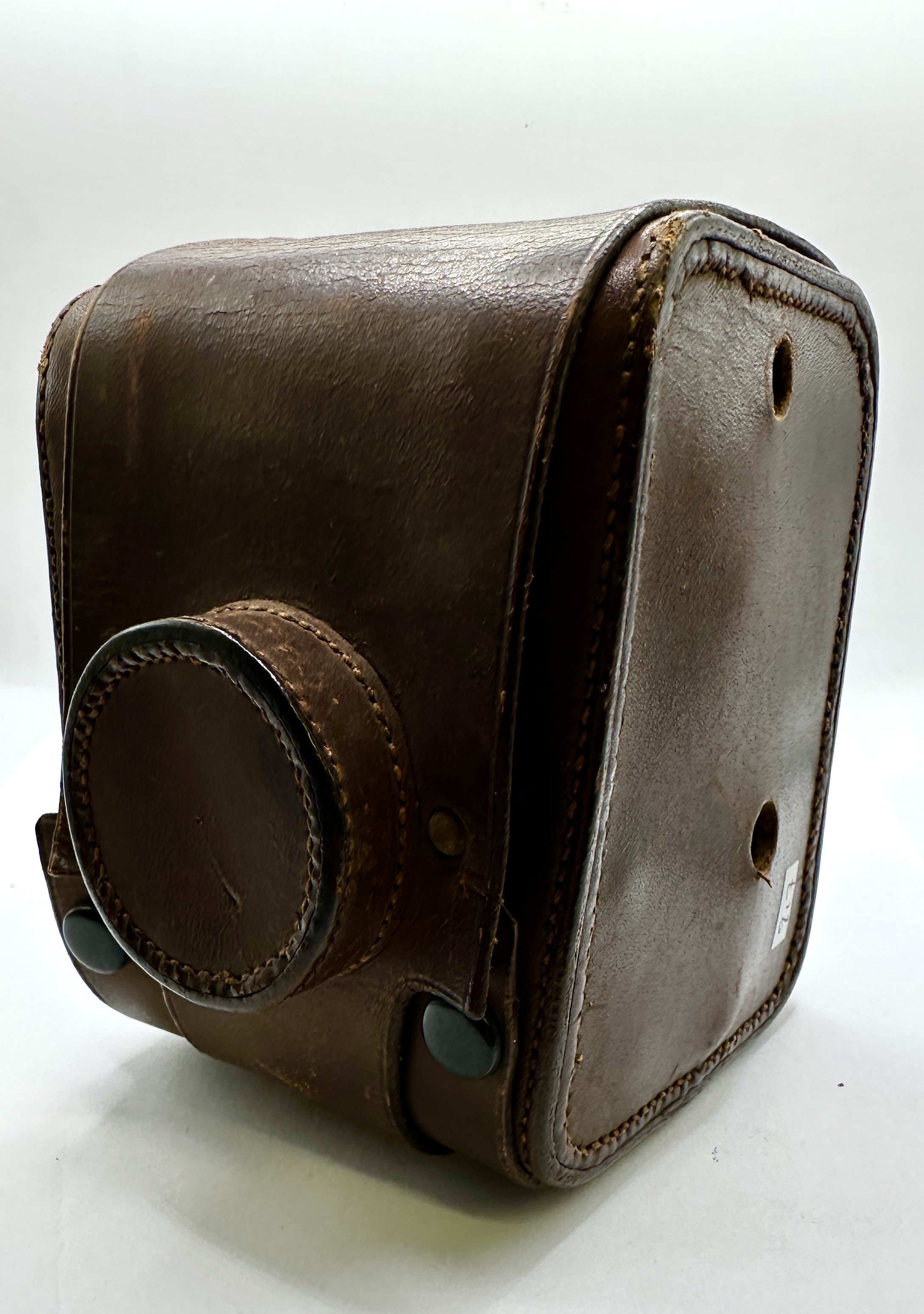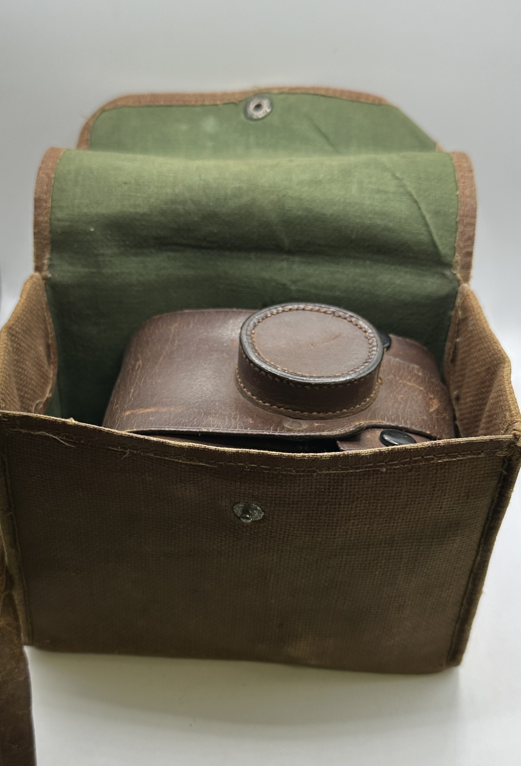 The camera exhibits signs of age-appropriate wear including surface abrasions and oxidation to various metal components. Both the leatherette carrying case and the canvas protective bag show scuffing and wear to the exterior surfaces.