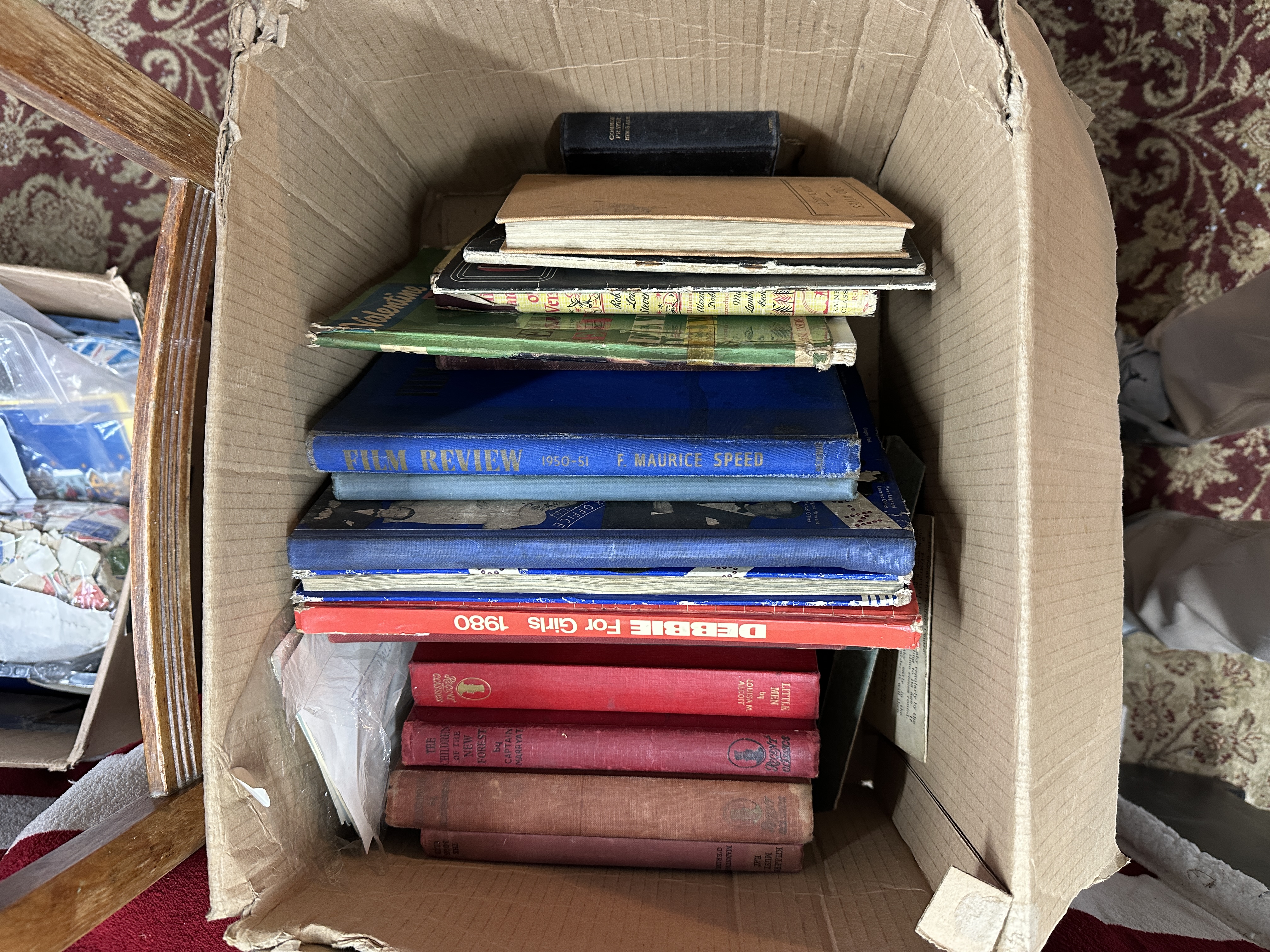 A collection of vintage books and annuals primarily dating from the mid-to-late 20th century. The assortment includes various hardback and softback publications in a range of colours and sizes. Notable titles include Film Review 1950-51 by F. Maurice Speed, Debbie For Girls 1980, and classic literature from the Regent Classics series including Little Men by Louisa M. Alcott and The Children of the New Forest by Captain Marryat. The items are housed in a cardboard box.