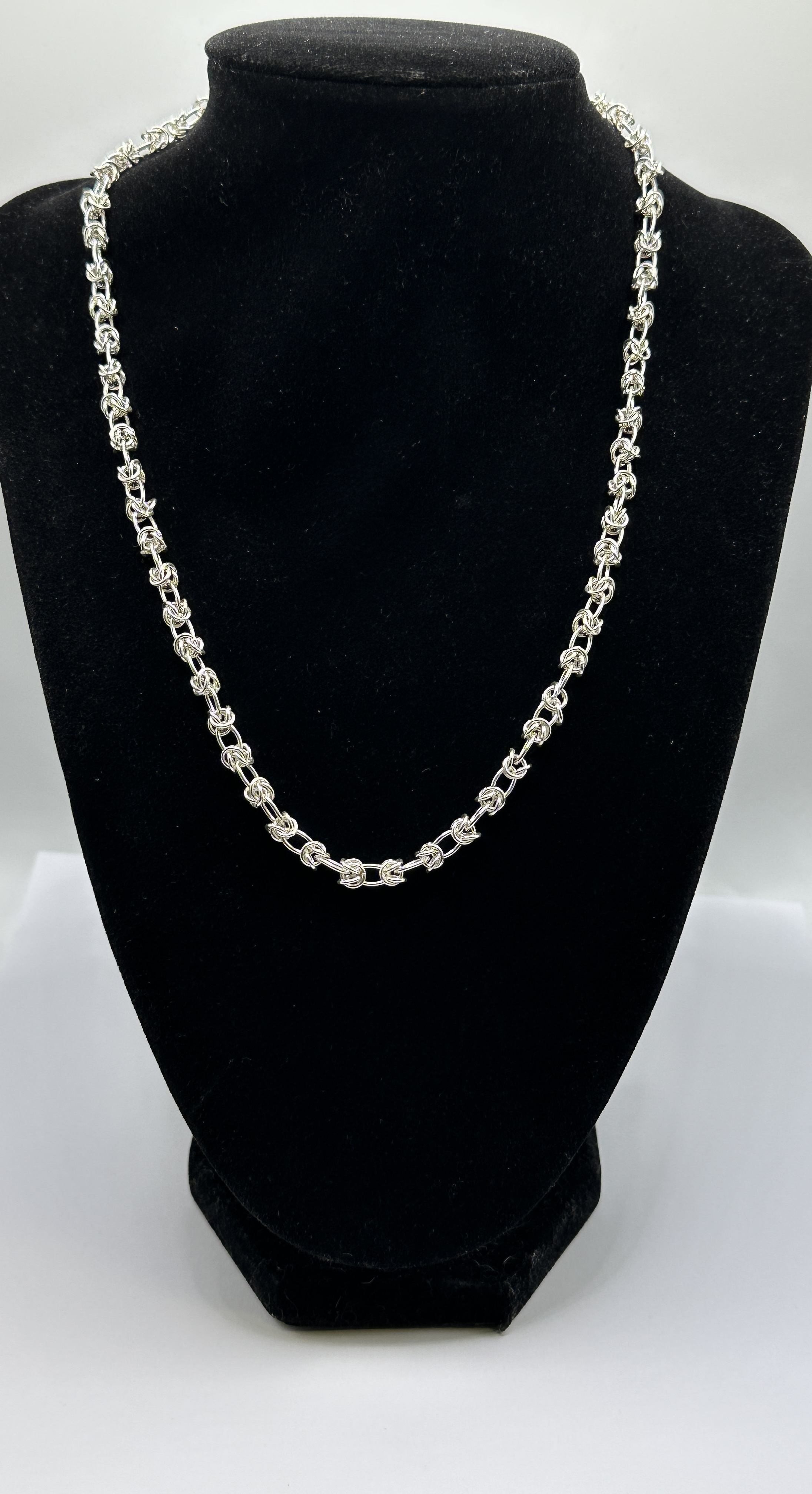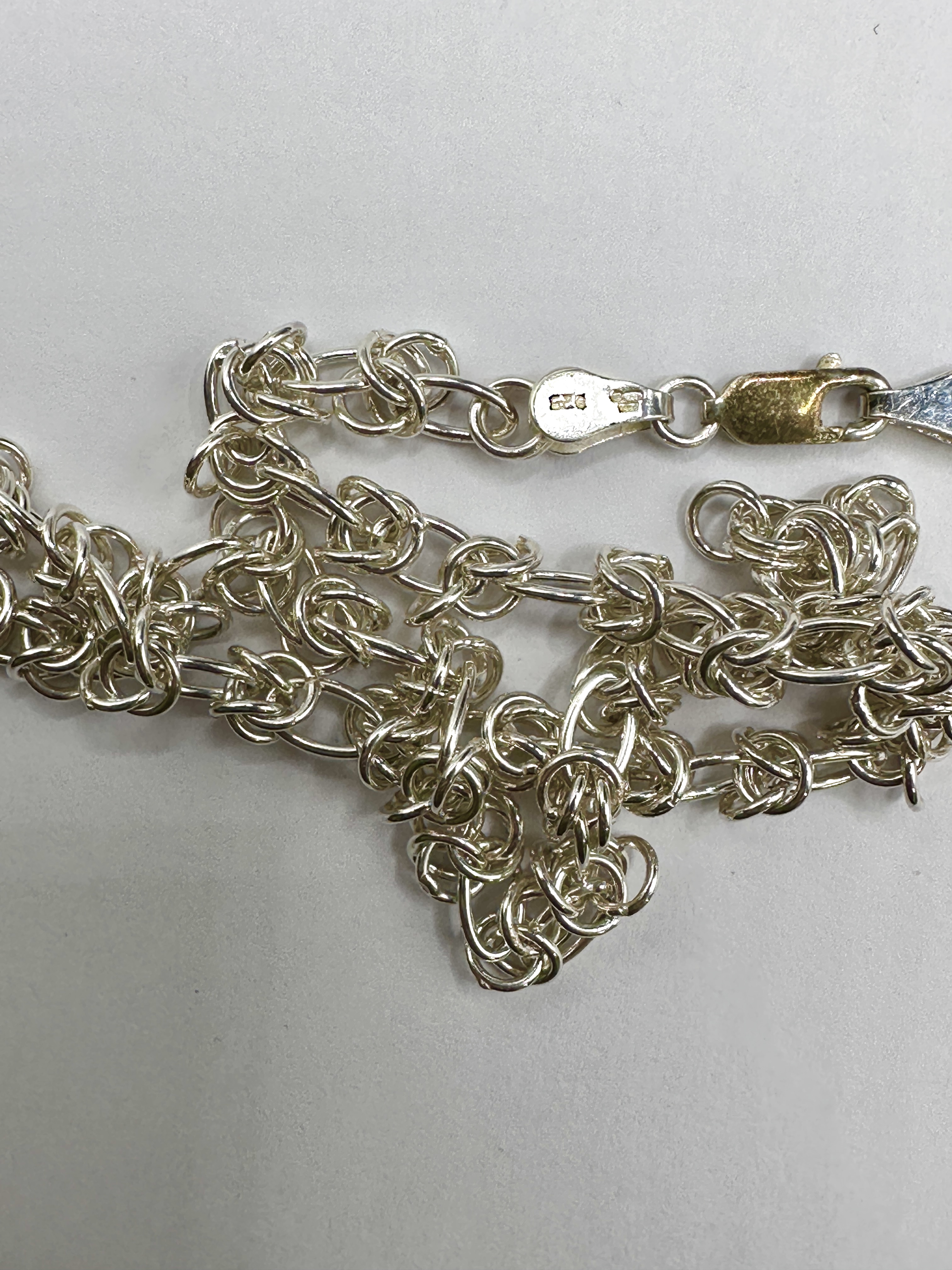 A 925 silver necklace featuring a Byzantine link construction, also referred to as a birdcage or King’s braid weave. The piece is composed of multiple interconnected circular links forming a continuous decorative chain. The necklace is fitted with a lobster claw clasp and an integrated end cap. A 925 hallmark is stamped on the end cap, denoting the silver purity.