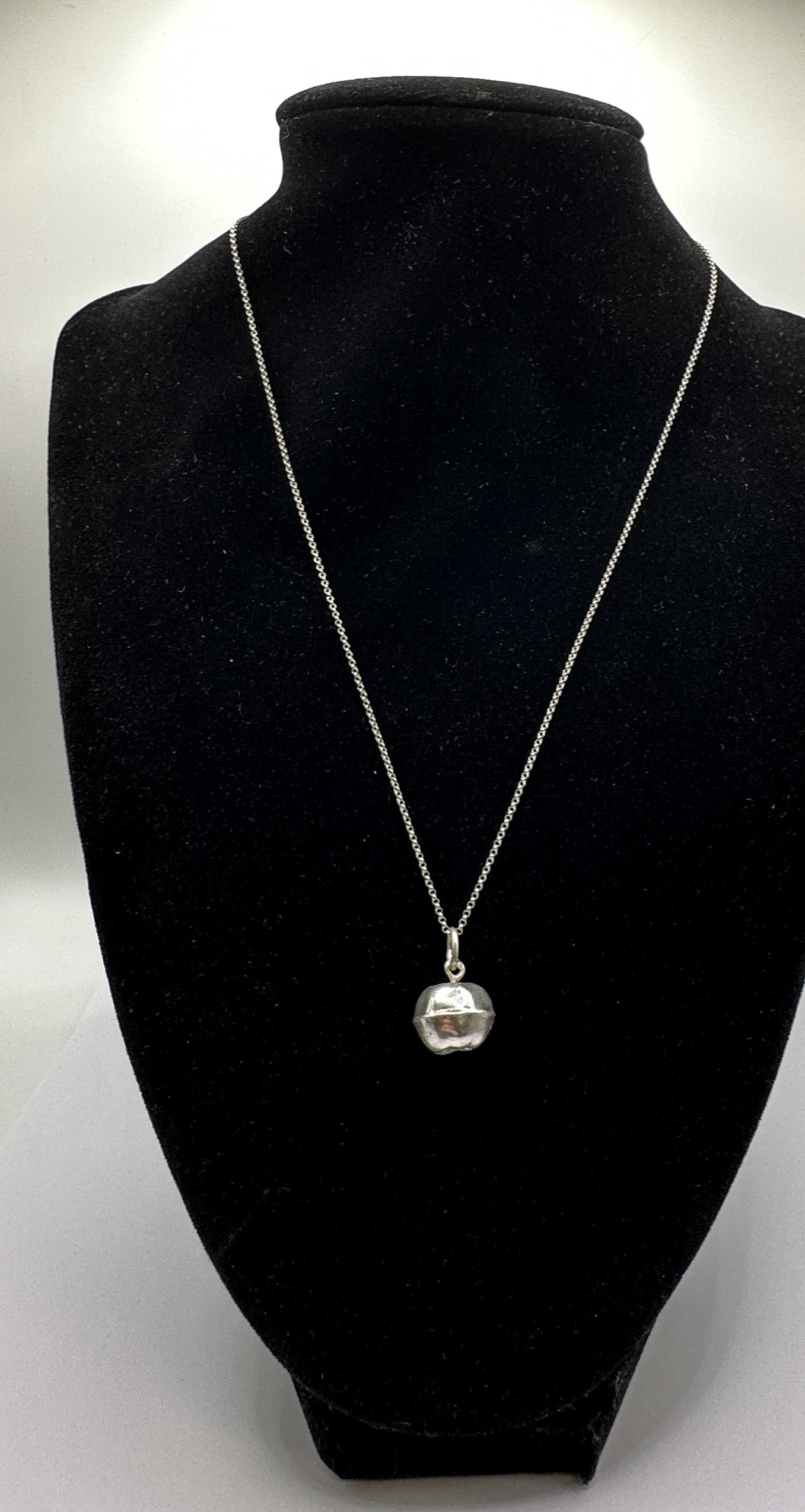 A 925 silver necklace featuring a fine link chain and a three-dimensional apple-shaped pendant. The piece is constructed from 925 silver and features a polished finish. The pendant is suspended from a fine link chain which is secured by a spring ring clasp. An integrated metal tag adjacent to the clasp is stamped with 925 and ITALY, denoting the material composition and origin.