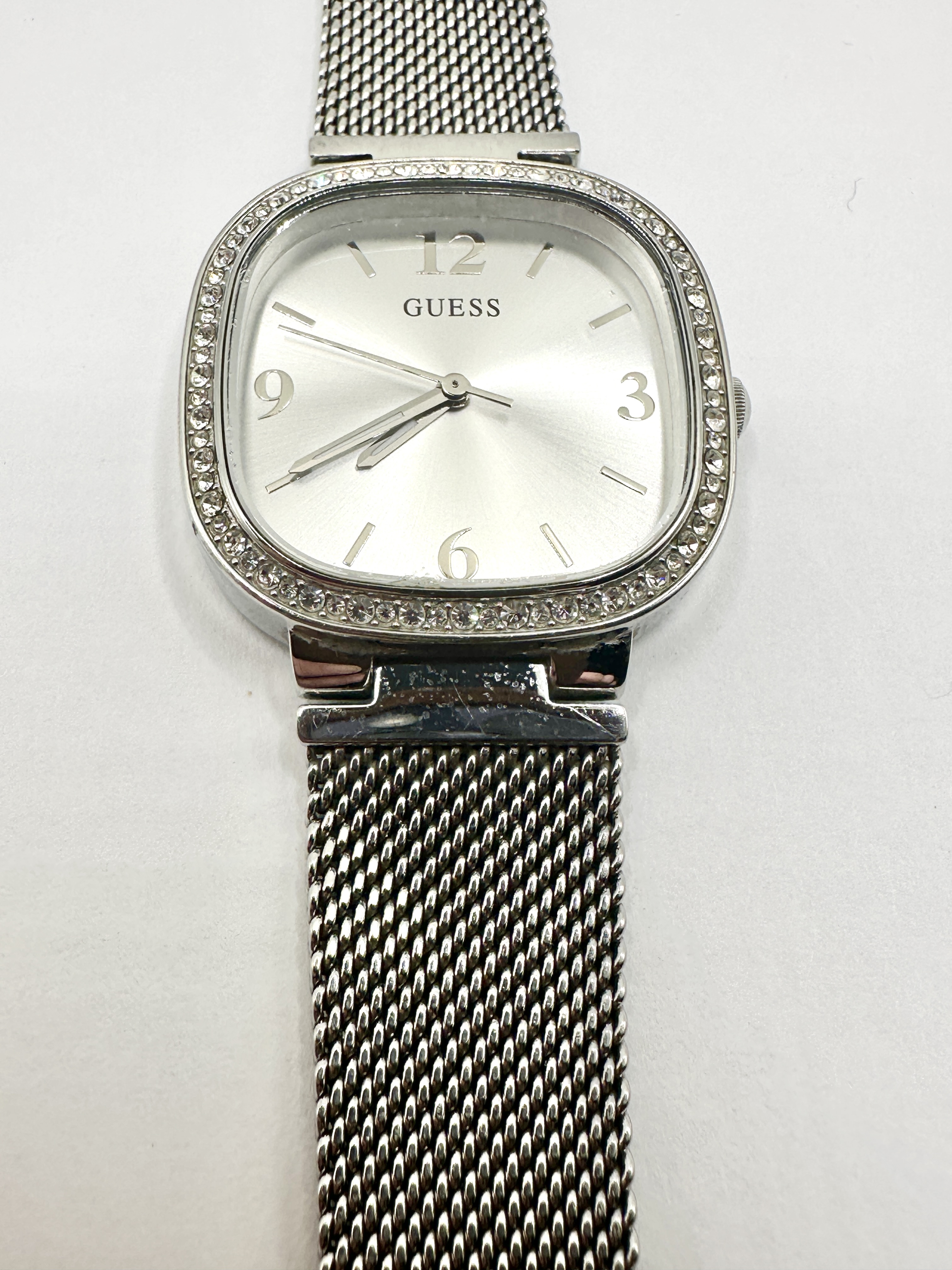 A Guess Tapestry ladies wristwatch model GW0354L1 featuring a polished silver-tone cushion-shaped case and a crystal-set bezel. The silver-toned sunray dial is marked GUESS and features three hands with Arabic numerals at the 12, 3, 6, and 9 o’clock positions and baton indices for the remaining hours. The timepiece is fitted with a matching silver-tone metal mesh strap.