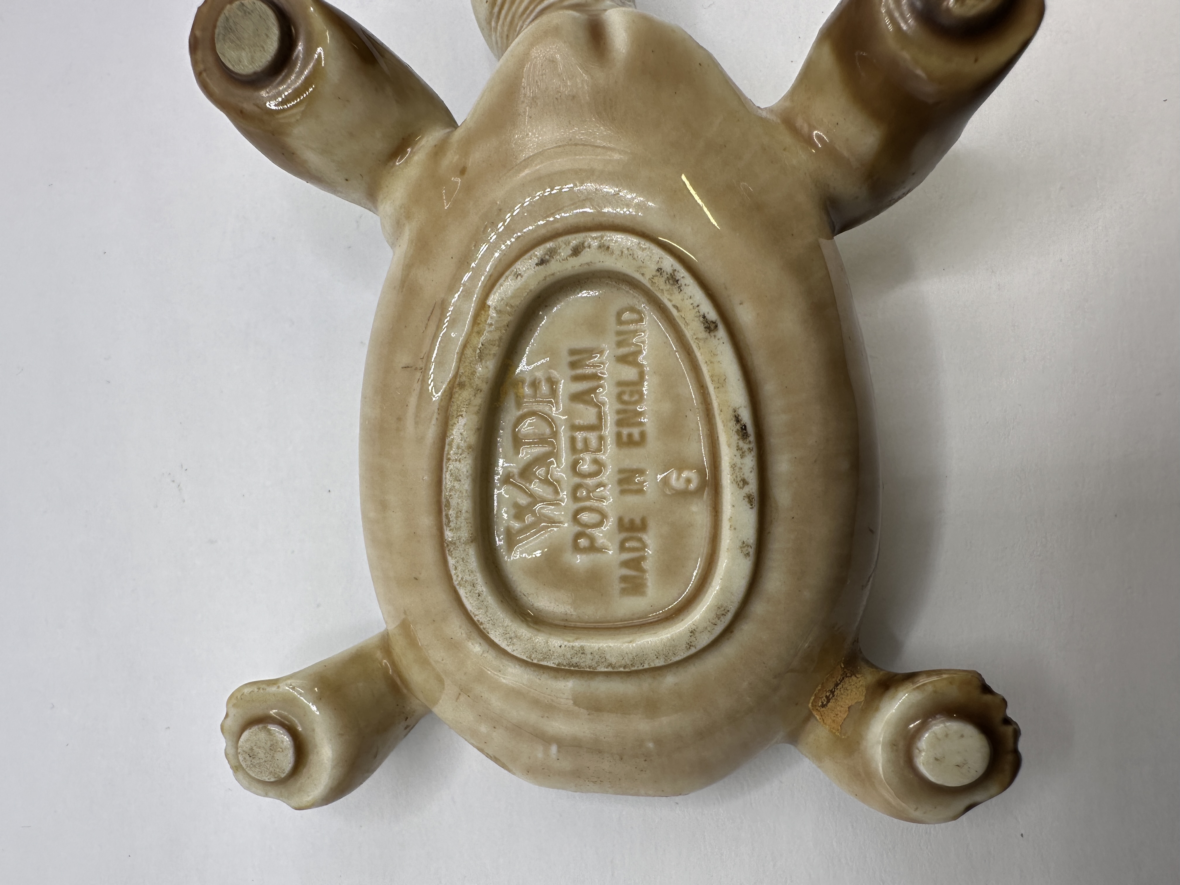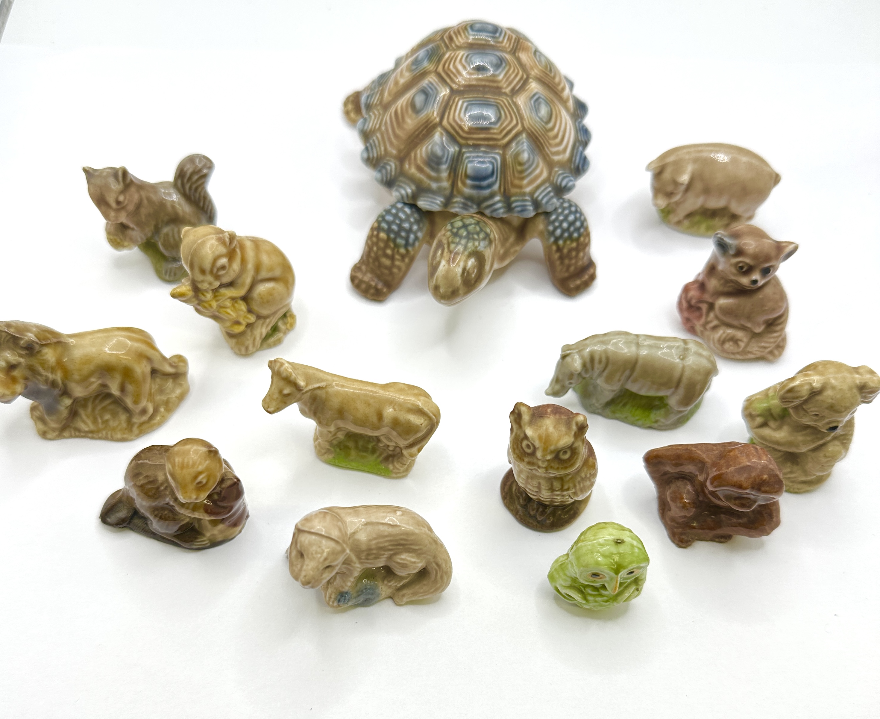 A collection of Wade porcelain animal figurines, including a larger tortoise trinket box. The group features various subjects such as a lion, koala, rhinoceros, monkey, squirrels, and owls. Each piece is constructed from moulded porcelain with a high-gloss glaze. The colour palette primarily consists of earthy brown and tan tones, with one small owl finished in a contrasting green glaze. The tortoise figurine features a removable shell and is marked on the underside of the base with WADE PORCELAIN MADE IN ENGLAND.
