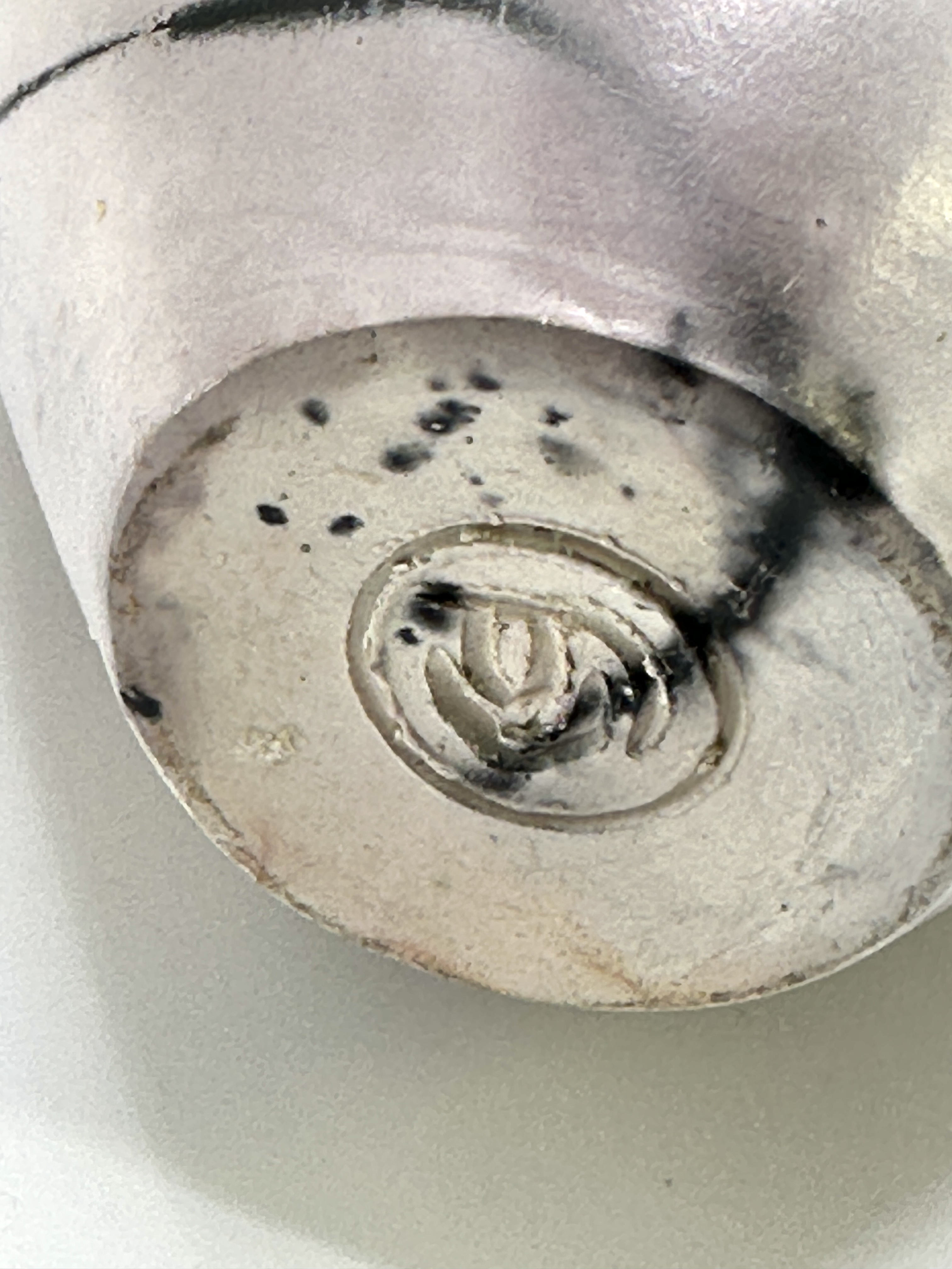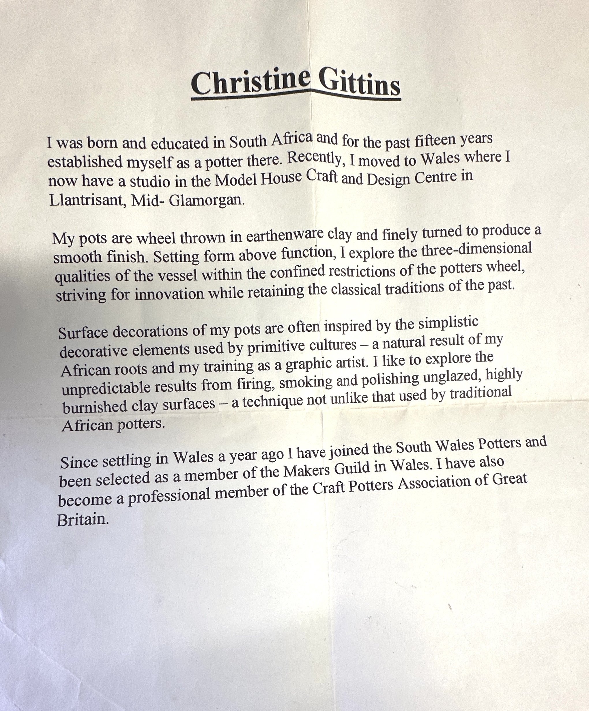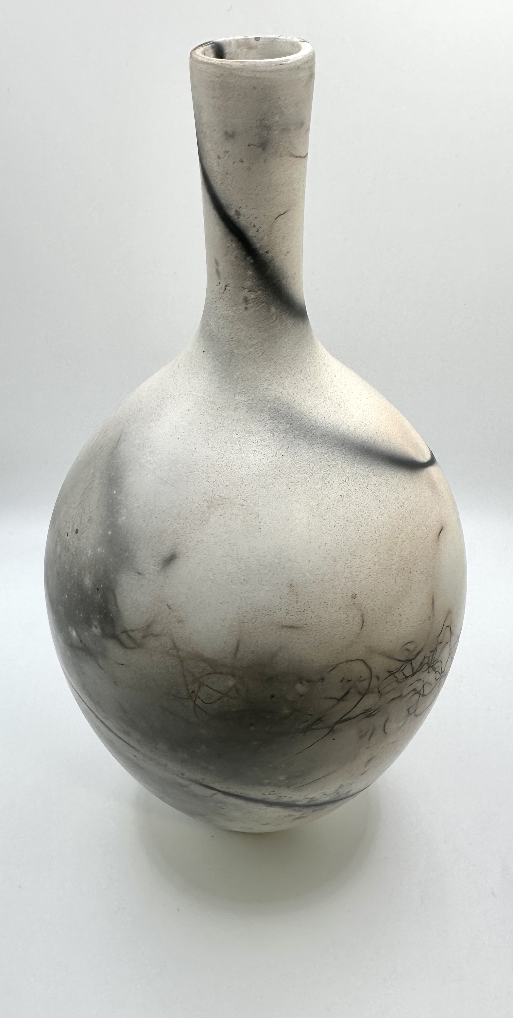 A contemporary wheel-thrown earthenware vessel by artist Christine Gittins. The piece features a bulbous body tapering to a tall, slender neck. The unglazed surface is highly burnished and decorated using smoke-firing techniques, resulting in a mottled grey and white finish. The exterior is further accented with fine, wandering black carbon lines characteristic of horsehair raku. An impressed monogram maker’s mark is present on the underside of the base. This lot includes a printed artist biography detailing Gittins’ career, including her move from South Africa to her studio in Llantrisant, Wales, and her professional memberships with the South Wales Potters, the Makers Guild in Wales, and the Craft Potters Association of Great Britain.