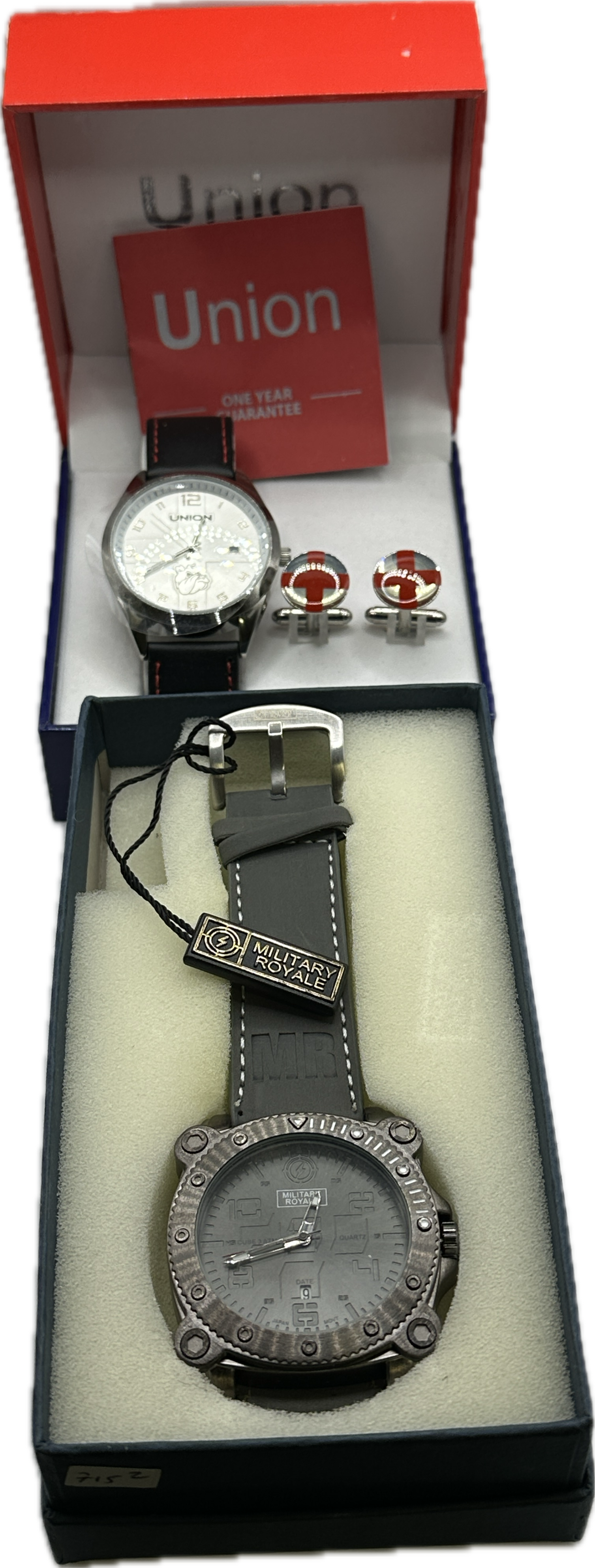 A collection of two contemporary men’s wristwatch sets in their original presentation boxes. The first set comprises a Union brand wristwatch featuring a white dial with an Arabic numeral at the twelve o’clock position, a silver-tone case, and a black strap with red contrast stitching. This set is accompanied by a pair of silver-tone cufflinks decorated with a red cross motif and a brand guarantee card. The second set contains a Military Royale brand wristwatch with an industrial-style gunmetal-tone case, a grey dial featuring a date window at the six o’clock position, and a matching grey strap with white contrast stitching. The Military Royale watch retains its original brand tag and the strap is embossed with the letters MR. Both timepieces are housed in their respective branded packaging.