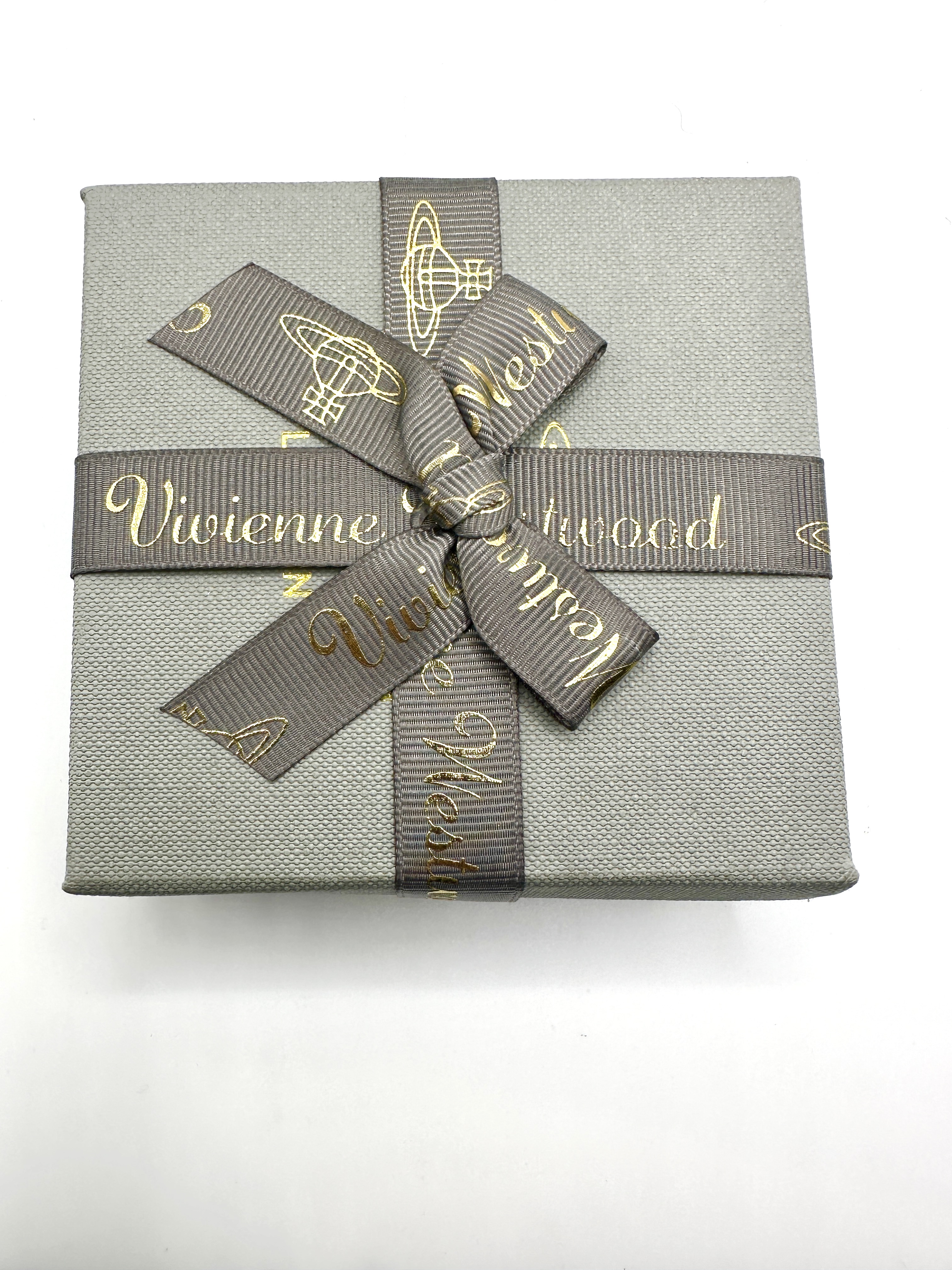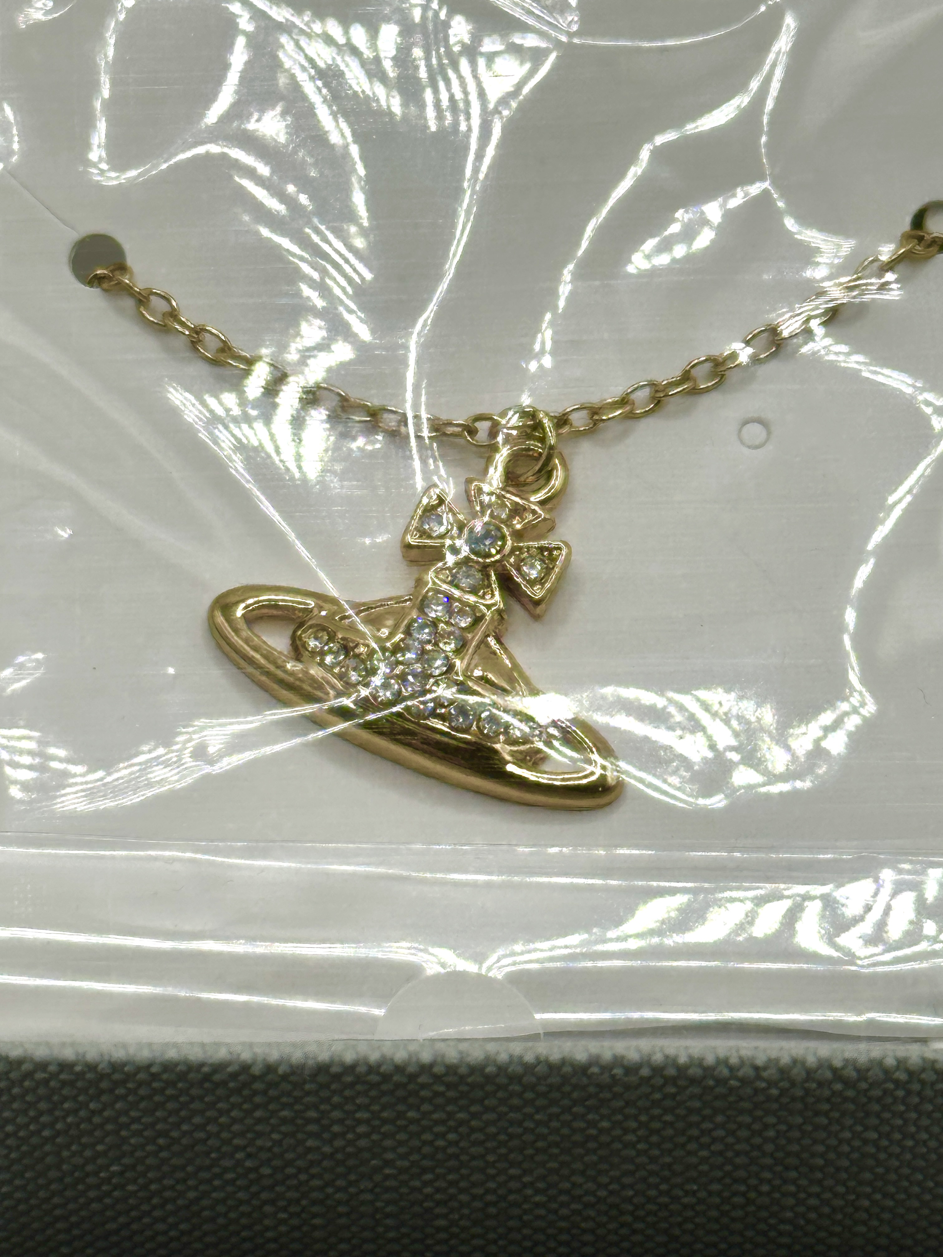 A Vivienne Westwood New Tiny Orb Pendant Necklace in a gold-tone finish. The pendant is designed as a three-dimensional orb with a Saturn ring and a cross finial, set with multiple clear faceted crystals. It is suspended from a matching gold-tone chain. The lot includes the original grey textured presentation box with gold-foil lettering and branded ribbon, alongside a brown suede-effect jewellery pouch featuring a gold-tone snap button embossed with the orb motif.