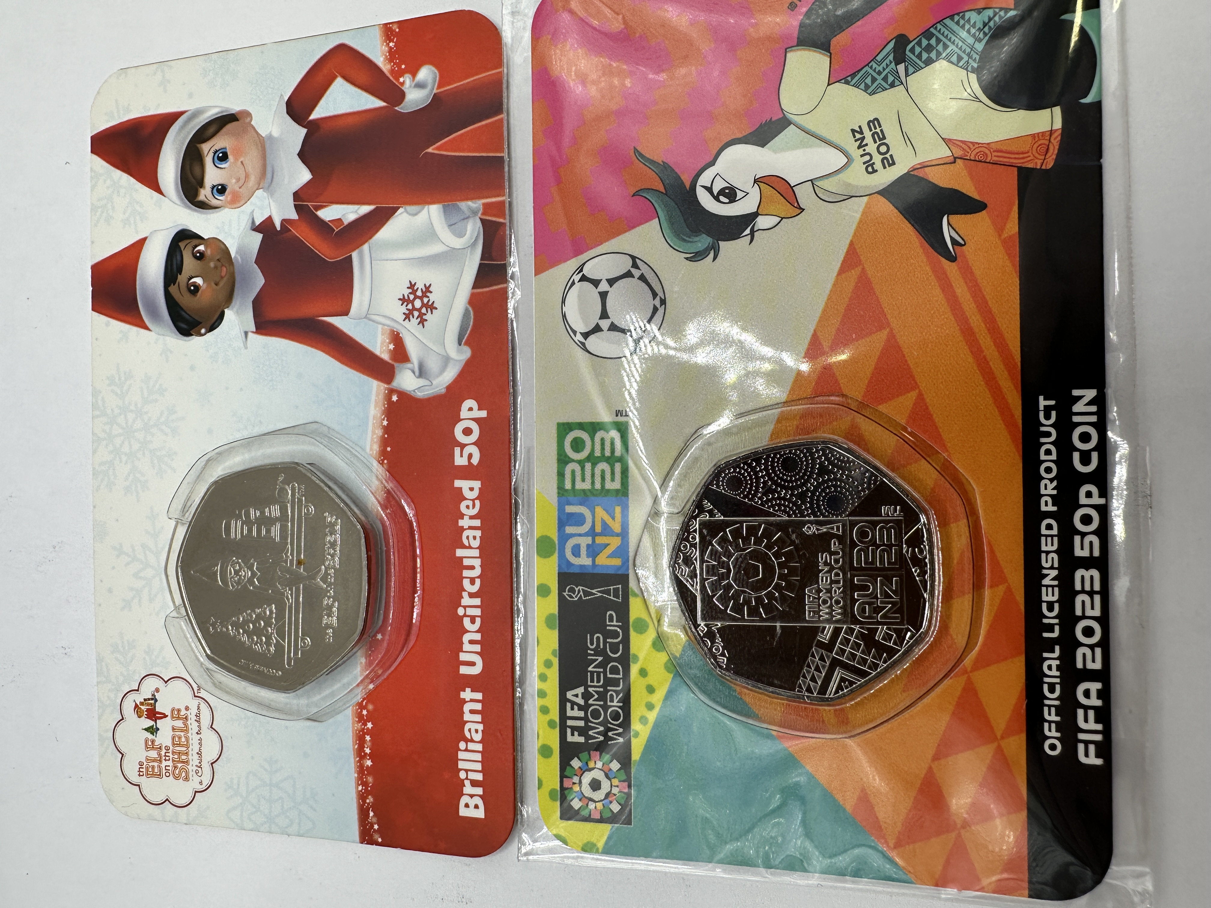 A pair of contemporary commemorative 50 pence coins, each housed in original illustrated card packaging. The lot comprises a Pitcairn Islands 50 pence coin struck to commemorate the FIFA Women’s World Cup Australia & New Zealand 2023, featuring the effigy of King Charles III on the obverse and the official tournament mascot on the reverse. Accompanying this is a 50 pence coin featuring The Elf on the Shelf holiday tradition, depicting an elf beside a decorated Christmas tree. Both specimens are heptagonal and struck with a Brilliant Uncirculated finish. The coins are held within clear plastic blisters mounted to the presentation cards.