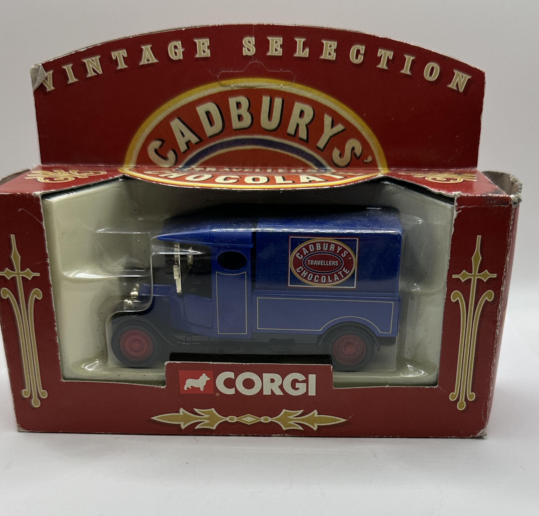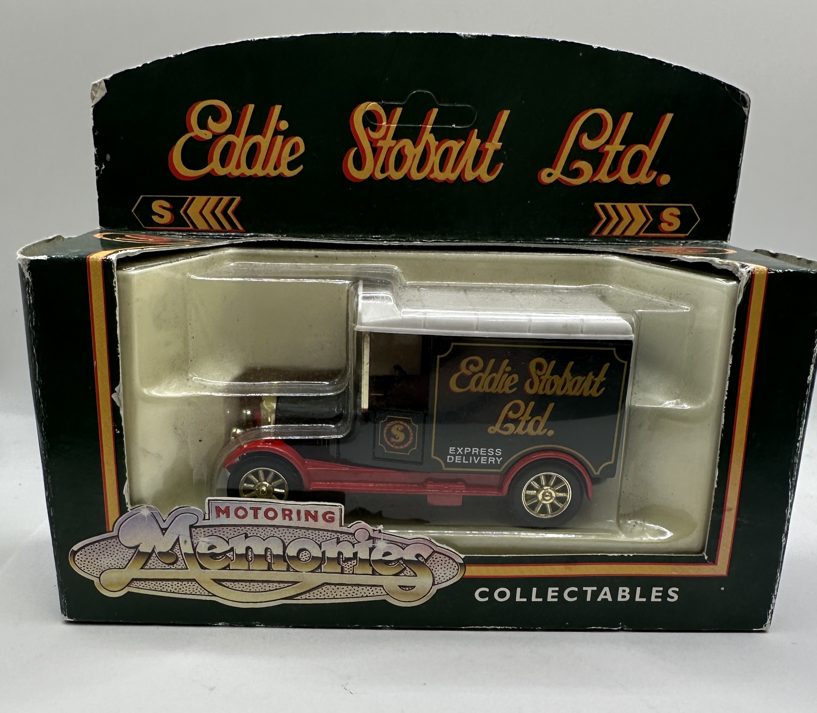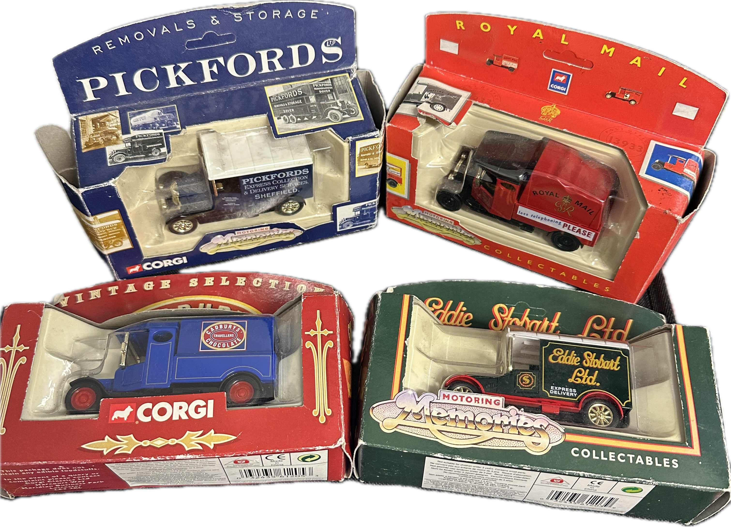 A collection of Corgi die-cast model delivery vans from the Motoring Memories and Vintage Selection series. The group includes vintage-style vehicles featuring liveries for Pickfords Removals & Storage, Royal Mail, Cadbury’s Travellers Chocolate, and Eddie Stobart Ltd. The models are constructed from die-cast metal with plastic detailing and are presented in their original window box packaging with internal plastic inserts. The Royal Mail van corresponds to Corgi model number 61201. The Eddie Stobart Ltd. and Pickfords models are part of the Motoring Memories collectables range, while the Cadbury’s vehicle is from the Vintage Selection.