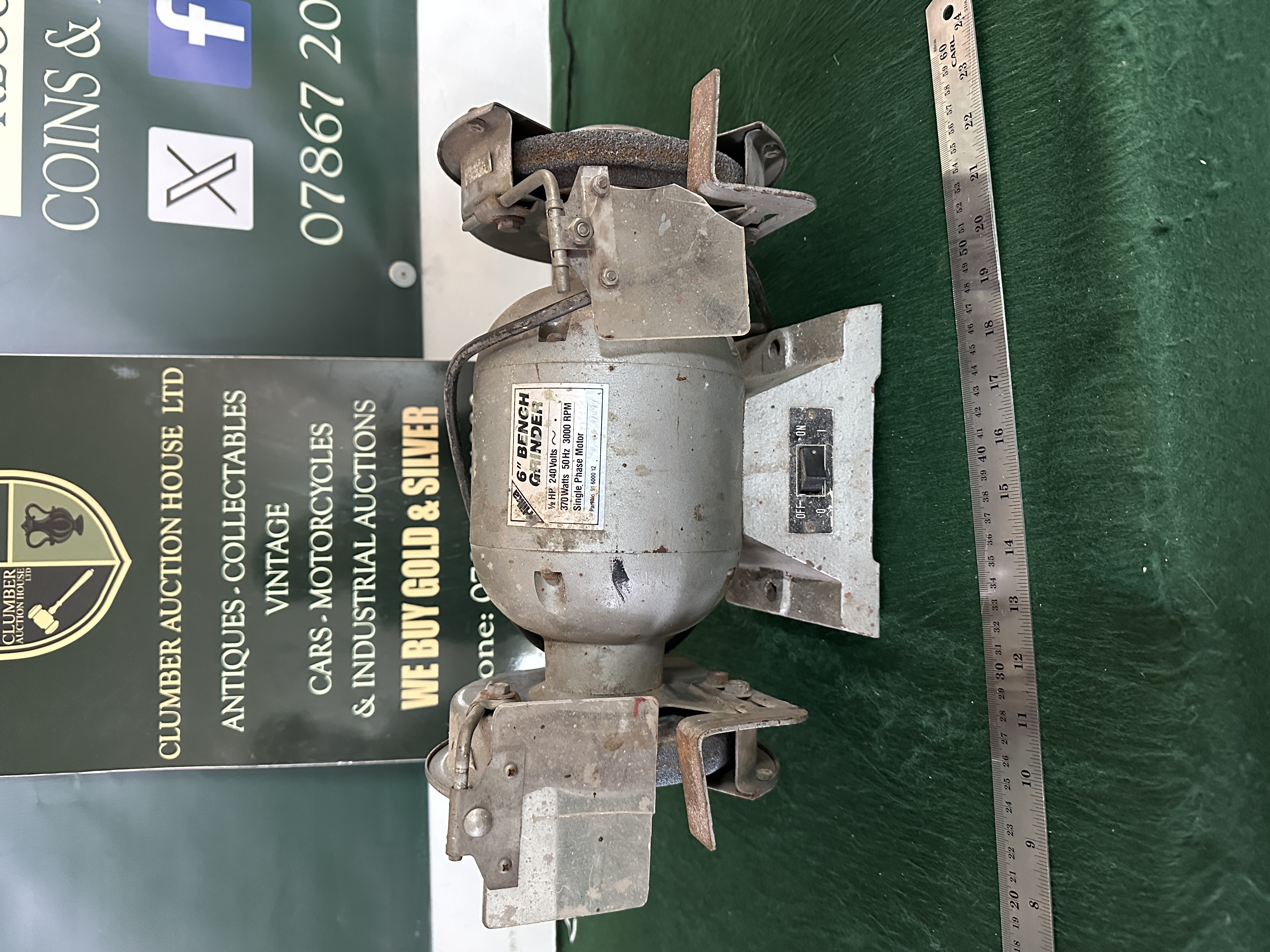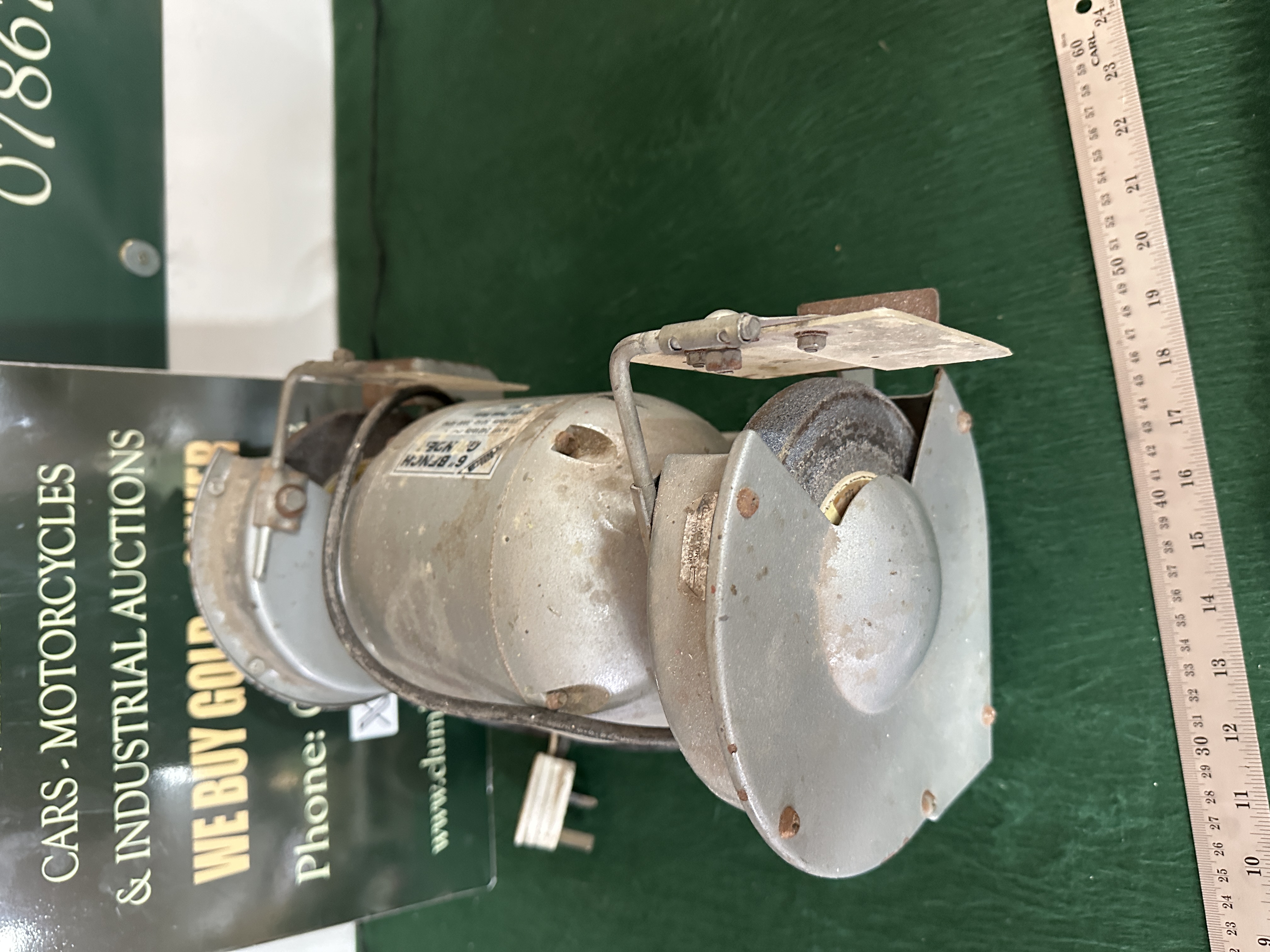 The item is in used condition, showing signs of surface oxidation on the tool rests, guards, and various metal components. There is general dust and grime throughout, consistent with service in a workshop environment.