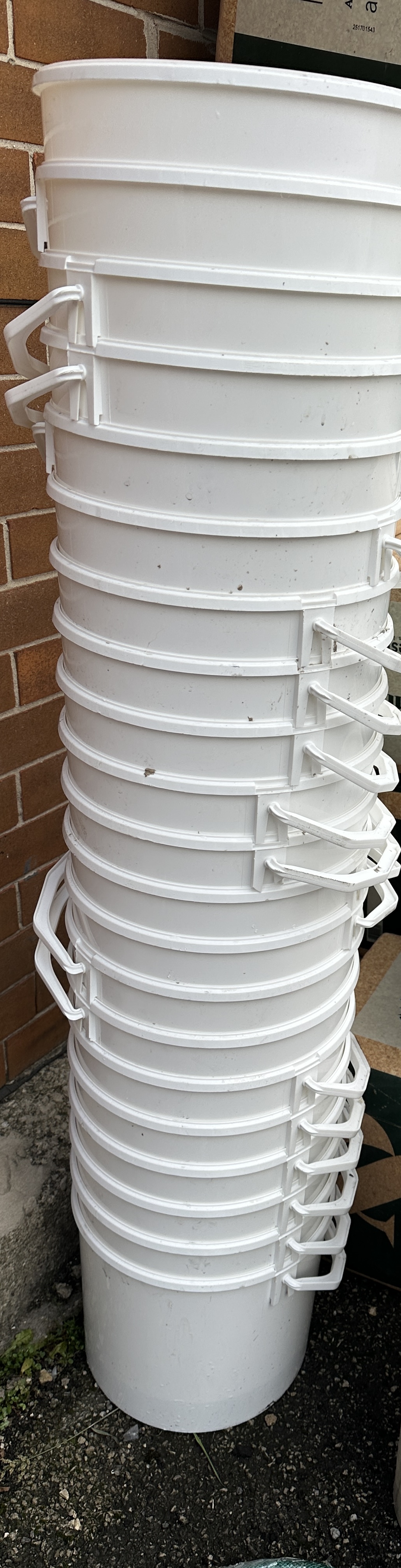 A collection of modern industrial pails constructed from a white polymer material. Each vessel features a tapered cylindrical body with a reinforced upper rim and integrated side handles. The design is consistent with utility storage containers used in commercial and industrial environments. The items are presented in a nested, stacked configuration.