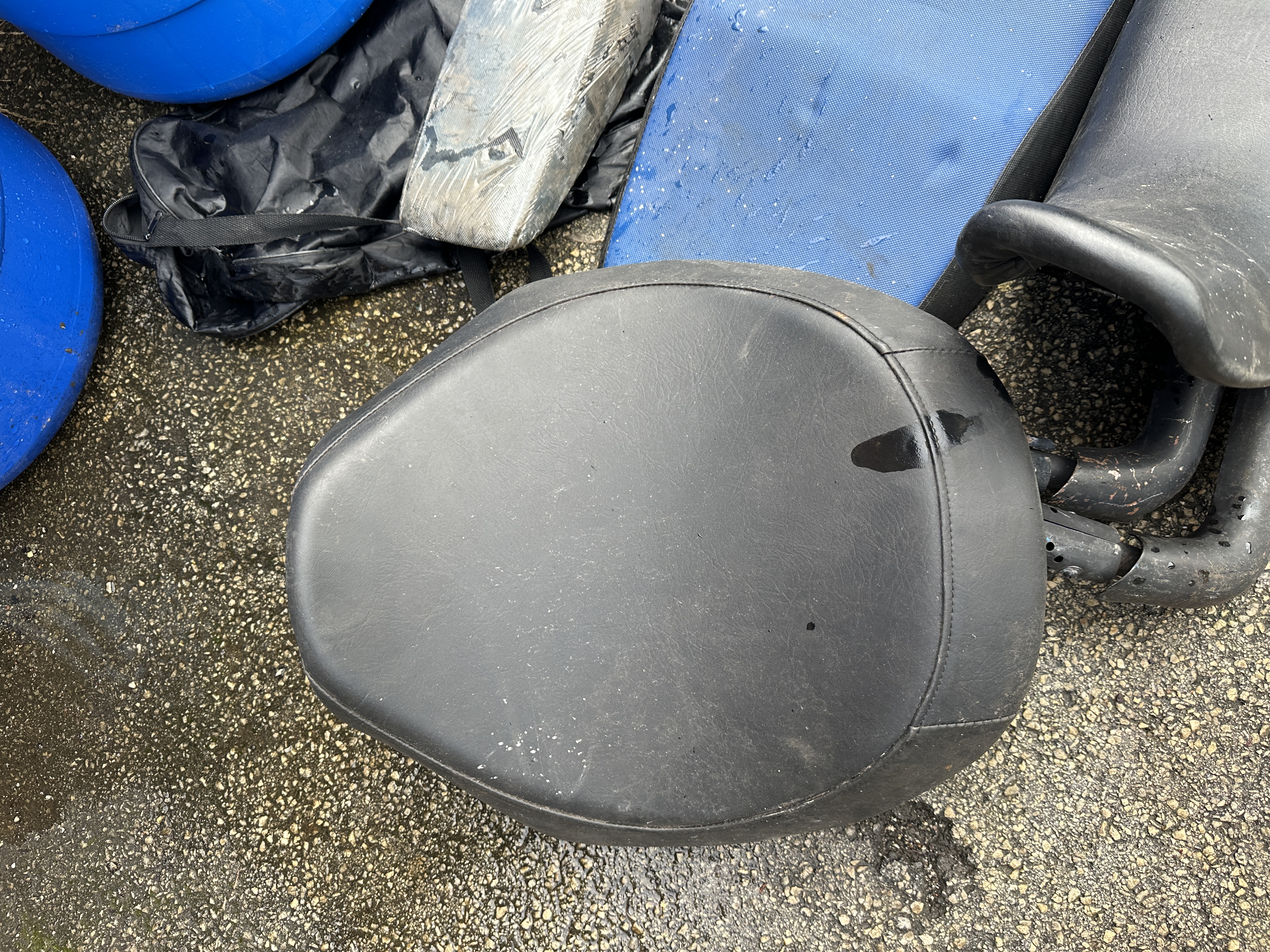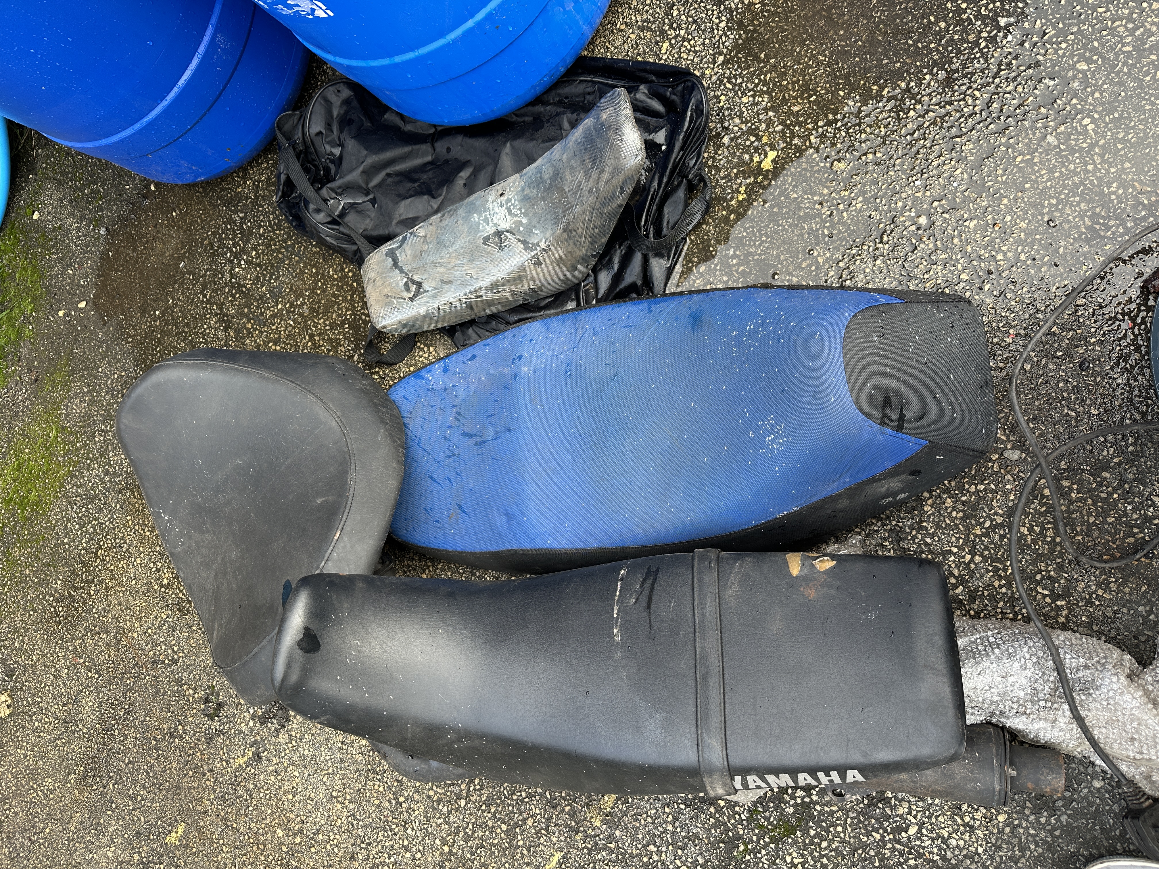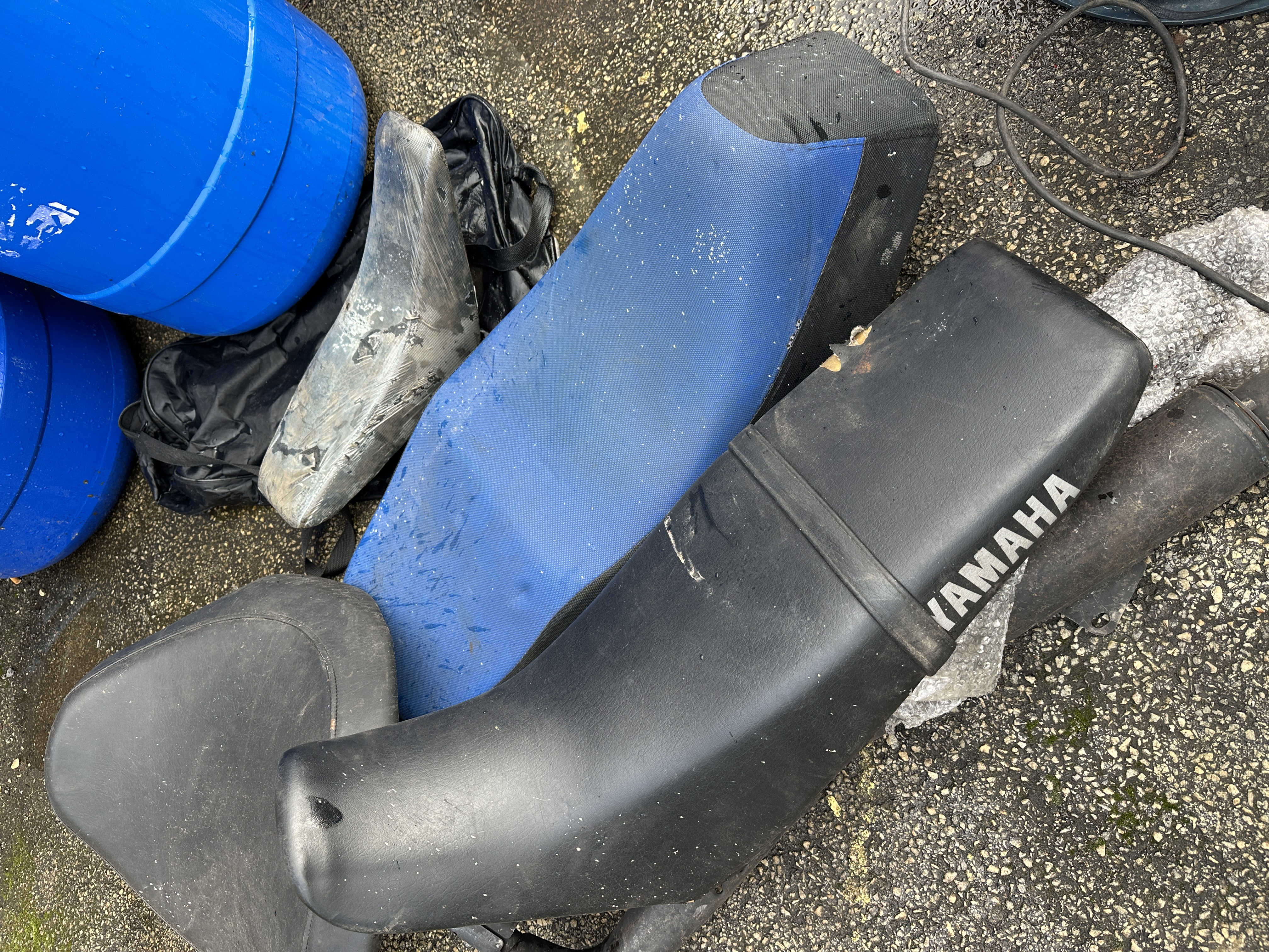 The collection is in used condition throughout. Visible surface dirt, scuffs, and abrasions are present on all components. There is a notable tear on the upper edge of the black Yamaha-branded seat. The metallic exhaust part shows surface oxidation and wear consistent with previous use. All items show evidence of exposure to the elements, including moisture and environmental residue.