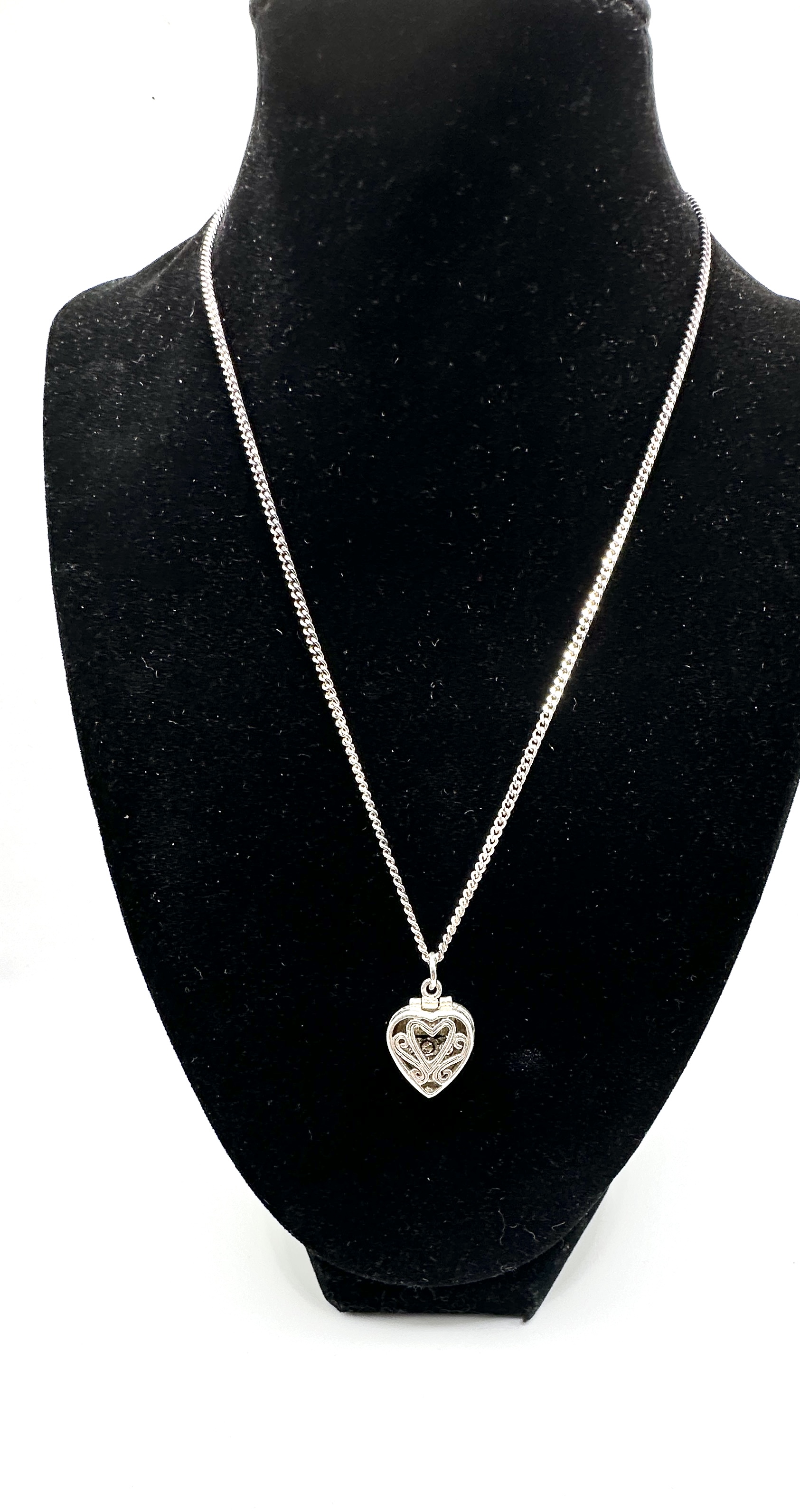 A 925 silver necklace featuring a heart-shaped locket pendant suspended from a fine curb link chain. The locket is designed with an intricate openwork filigree heart motif to the front face and engraved leaf patterns to the sides. The hinged interior reveals a fixed miniature three-stone ring set with clear, round-cut faceted crystals. The piece is constructed from 925 silver as confirmed by provided specifications.