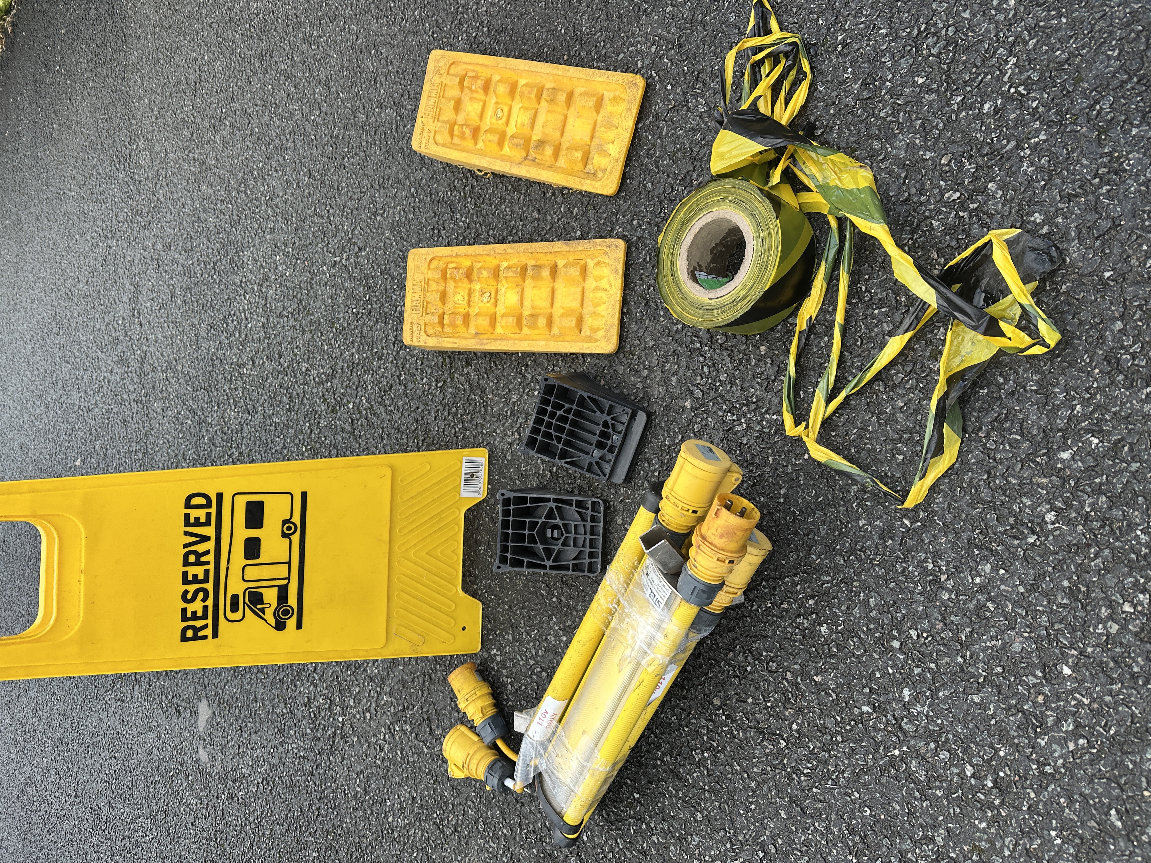 An assortment of utilitarian items for motorhome use and industrial site management. The collection includes yellow plastic levelling ramps by Fiamma, marked Made in Italy, and a yellow plastic A-frame sign featuring a motorhome icon and the text RESERVED. Also present are black plastic grid-style chocks and a roll of yellow and black hazard warning tape. The lot further comprises bundled 110V industrial site lights or extension units, identified by labels as STEL SLINKLITE, featuring heavy-duty yellow plugs and clear protective casings.