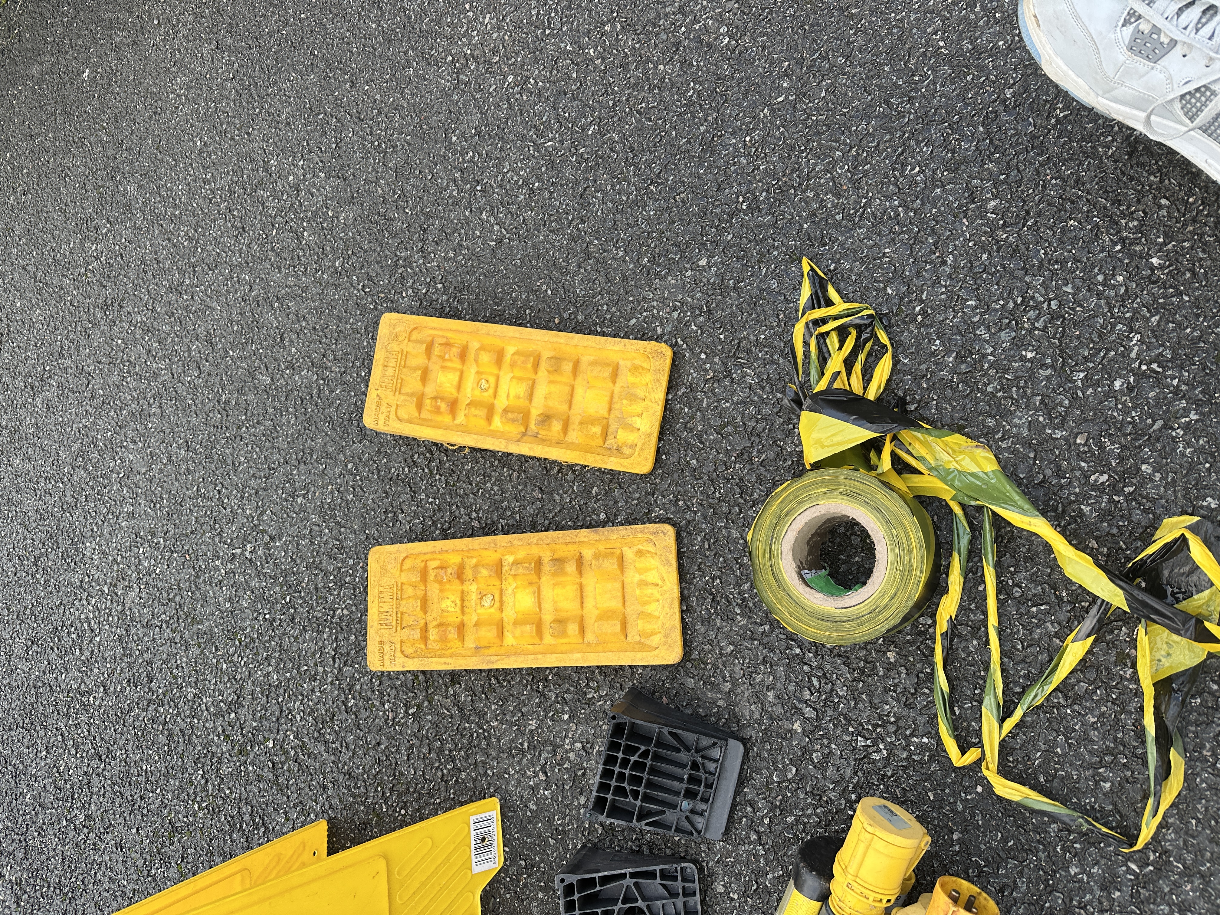 Items show visible signs of use, including surface dirt, scuffs, and wear consistent with outdoor and industrial operation. The hazard tape is partially unrolled. Electrical items are untested.