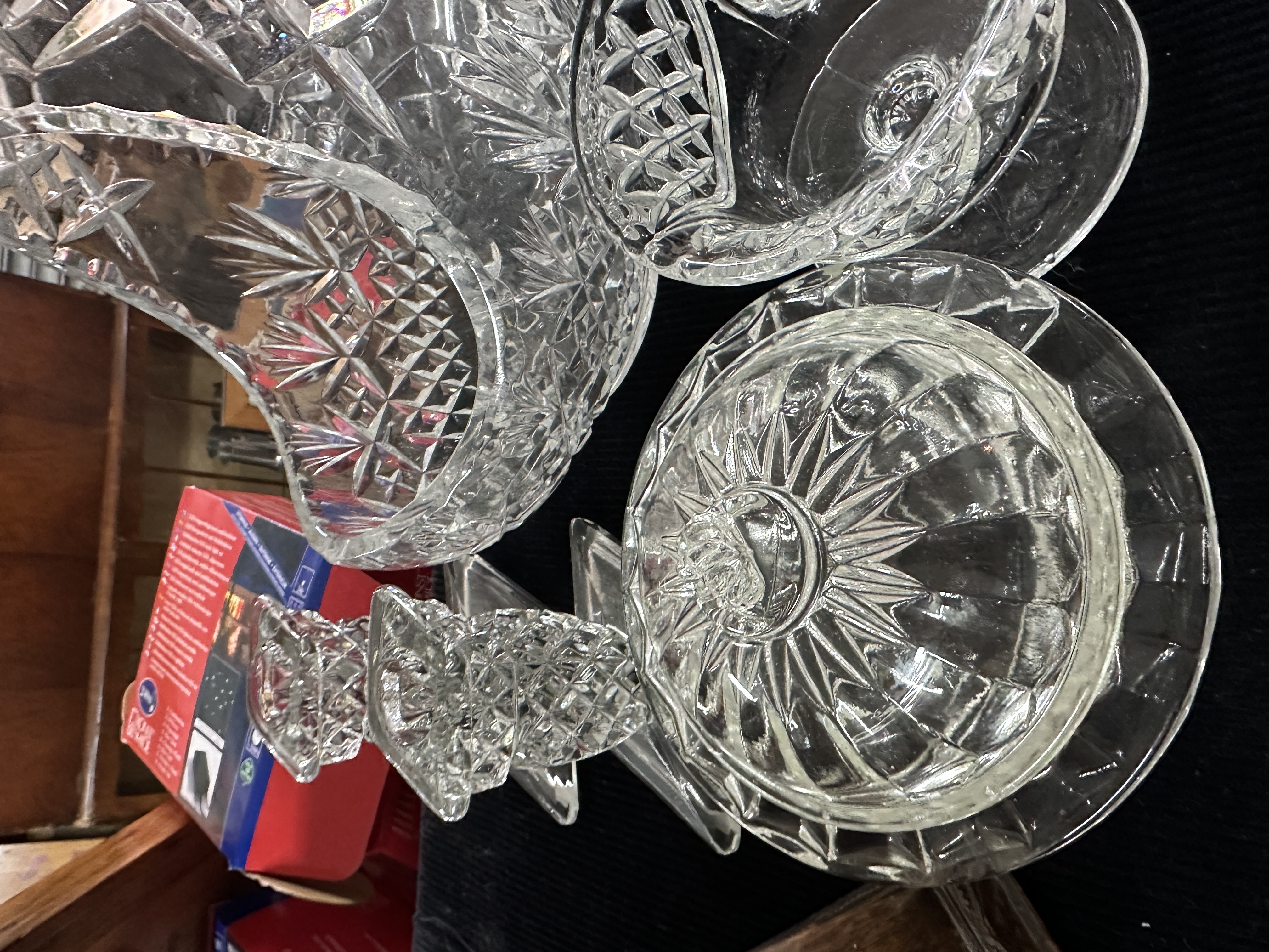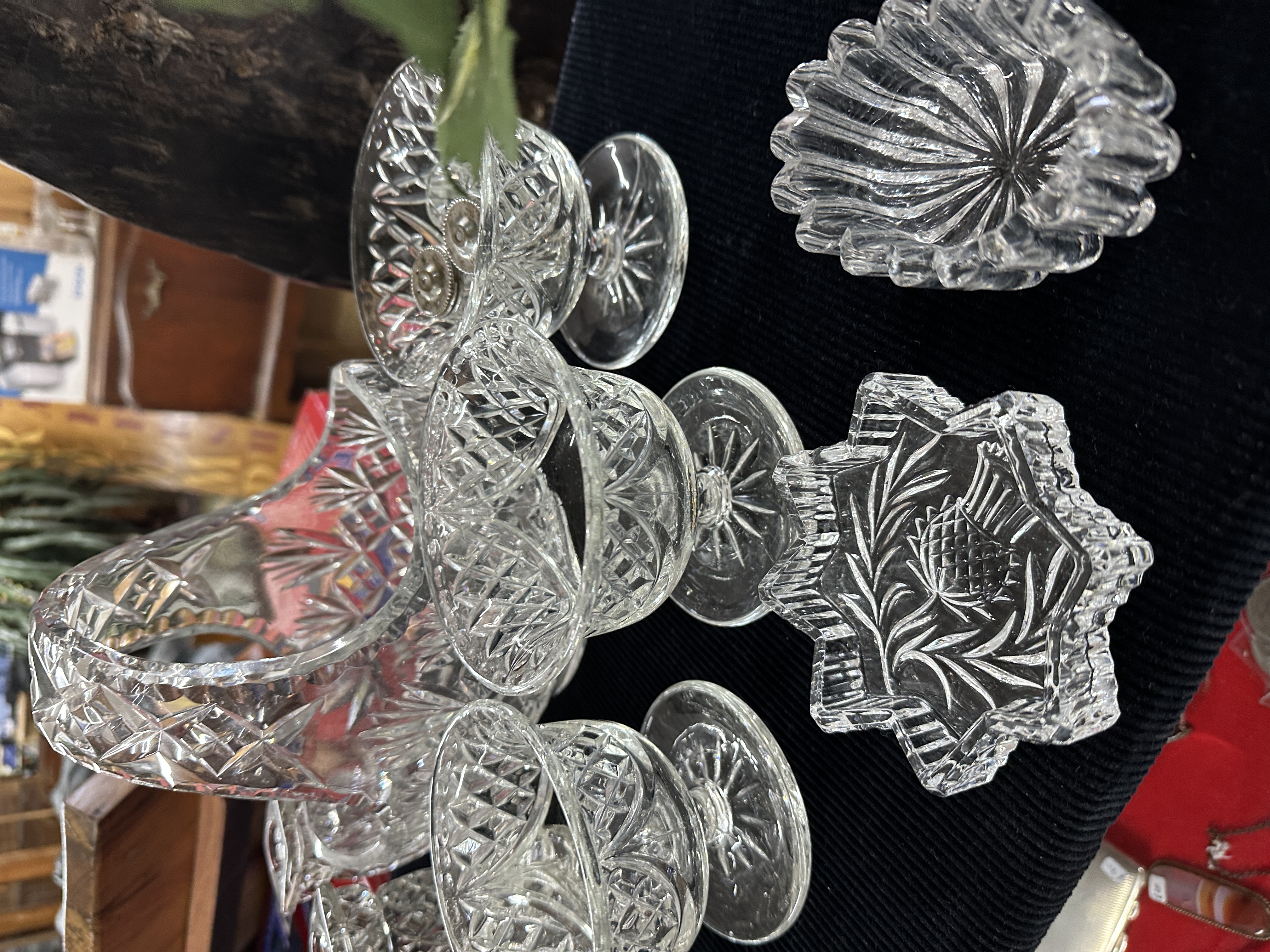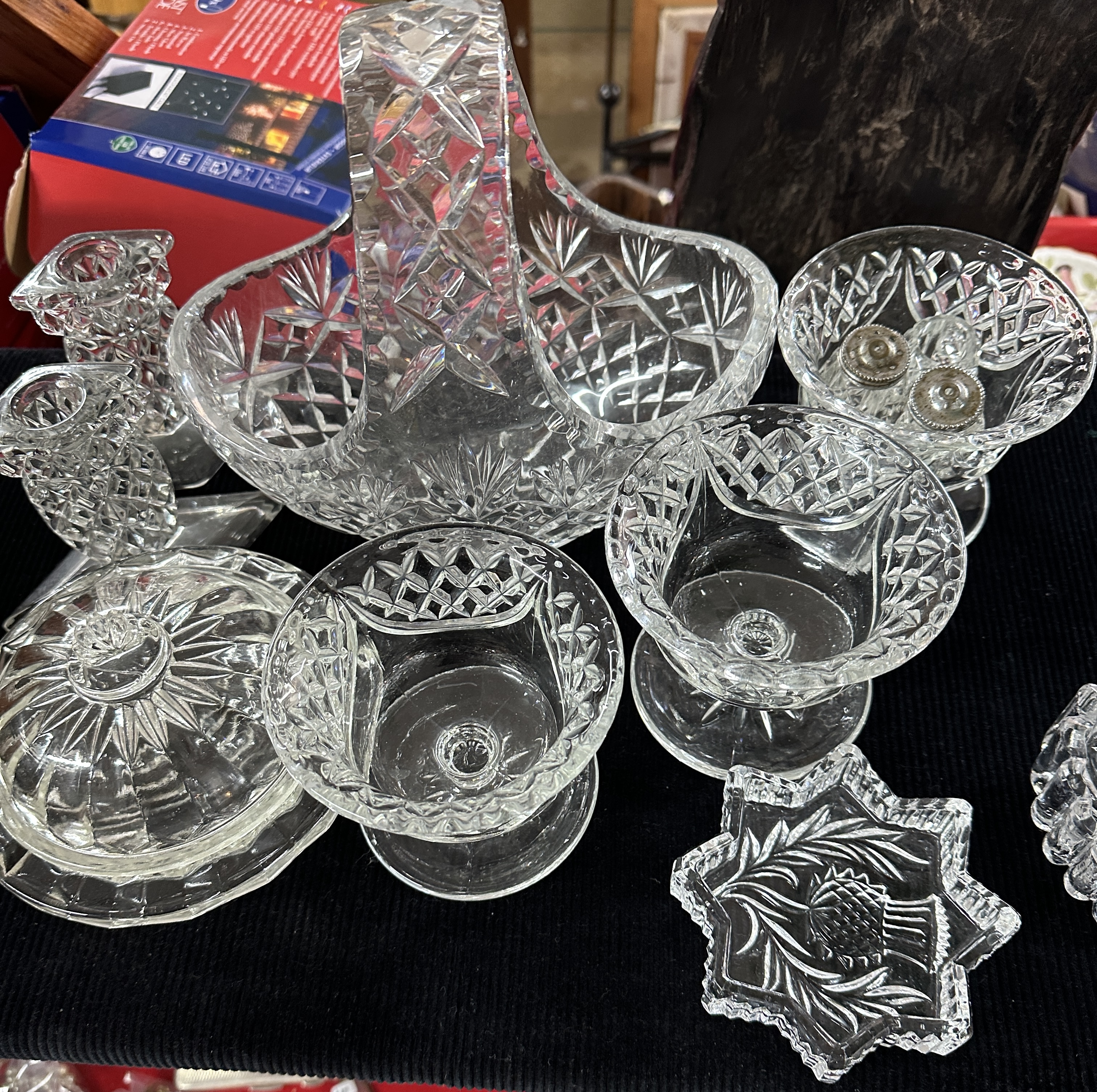 An assortment of clear cut glass and crystal decorative and functional tableware. The collection features a large handled basket with diamond and starburst patterns, matching pedestal comports, and a circular covered dish with a domed lid and a radiating sunburst design. The group also contains a pair of textured bud vases, a star-shaped dish with a thistle motif etched in the centre, and a shell-shaped dish. The pieces exhibit traditional geometric faceting and etched details throughout.