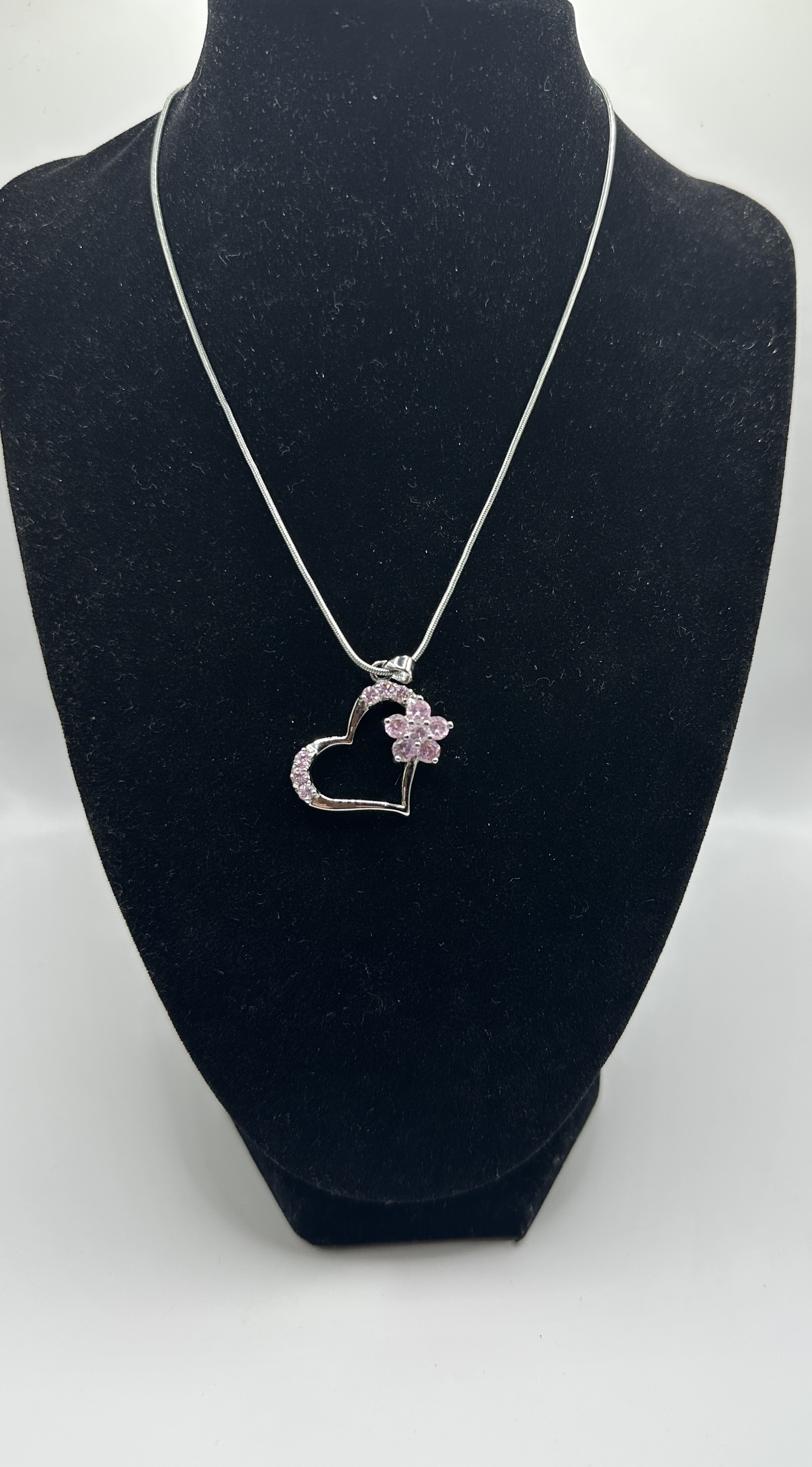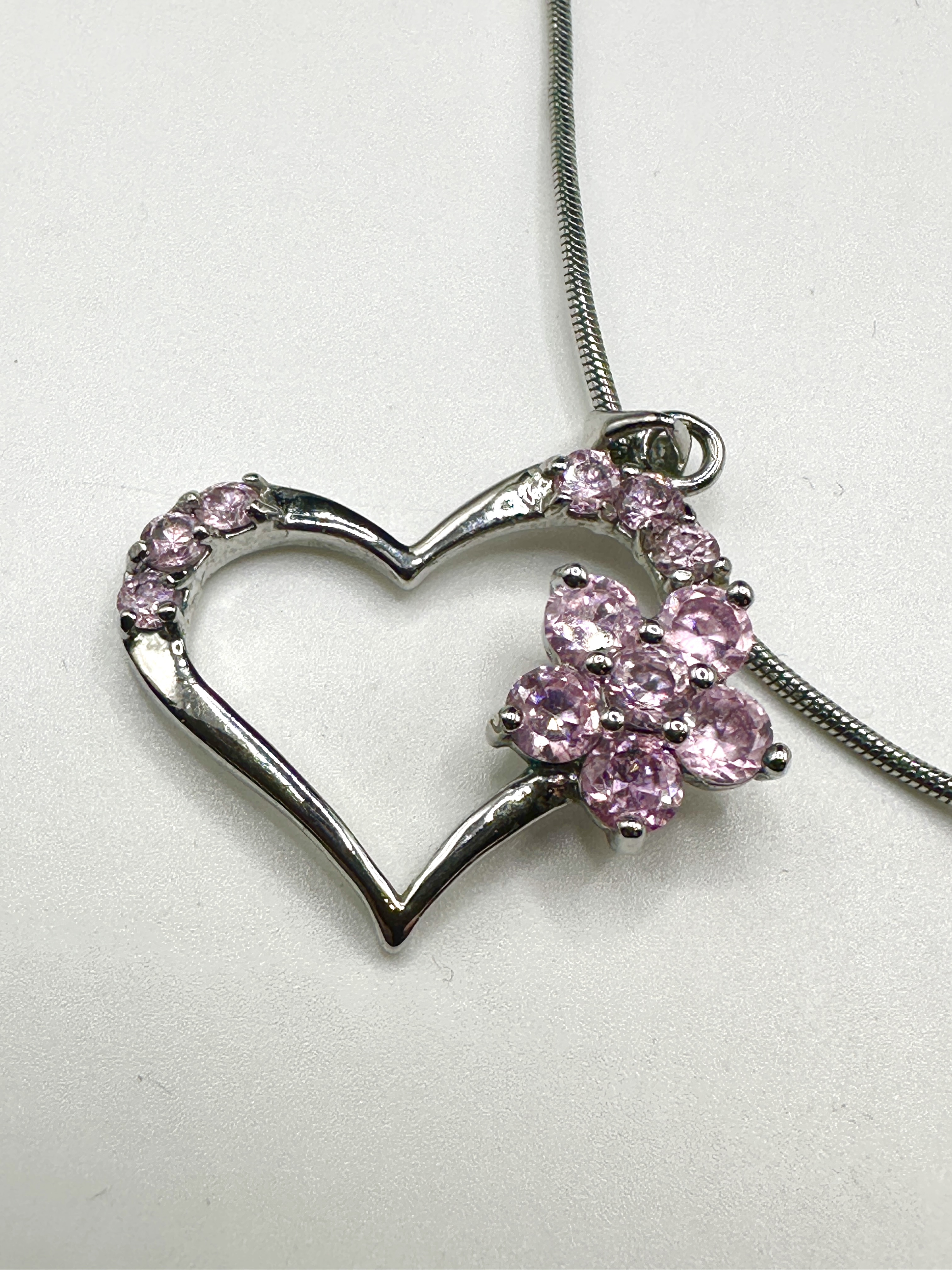 A contemporary sterling silver necklace featuring an open-heart pendant suspended from a fine snake chain. The pendant is accented with faceted round pink cubic zirconia stones, pavé-set along the upper curves of the heart. Integrated into the right side of the heart is a five-petal floral motif, similarly set with round pink stones. The metal features a high-polish rhodium-plated finish. No visible hallmarks are present.