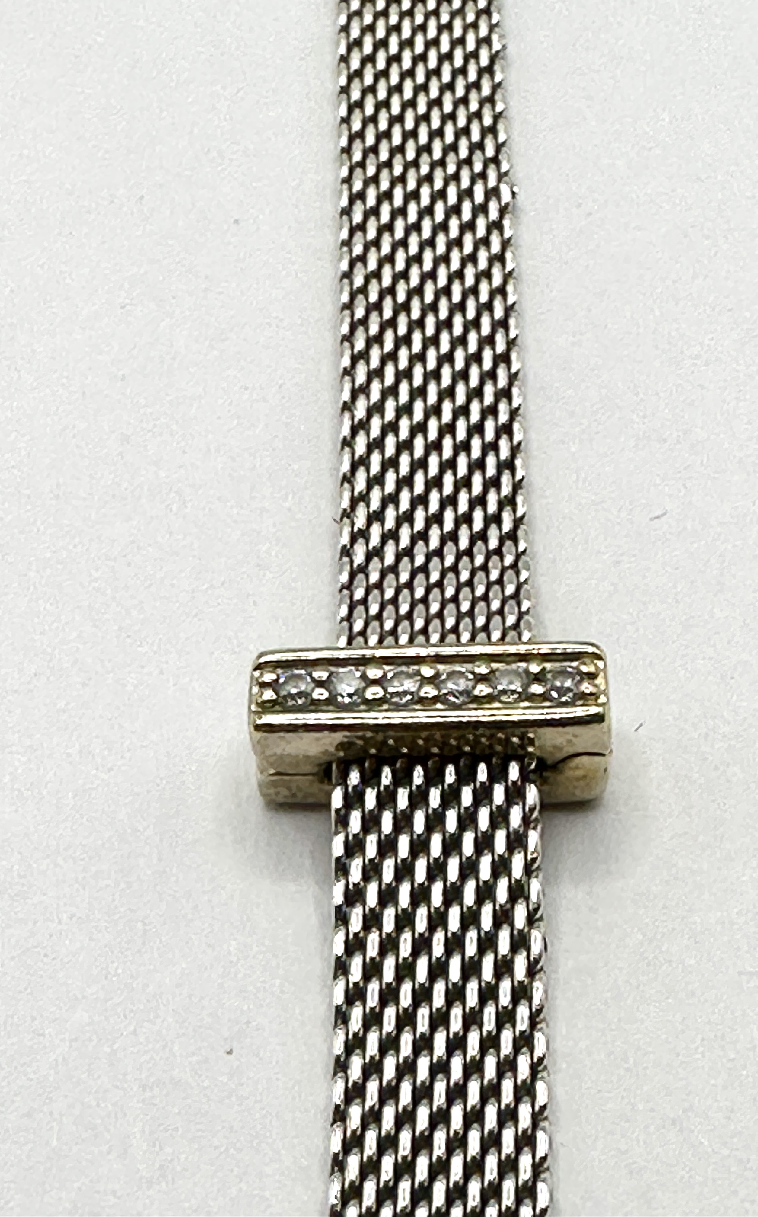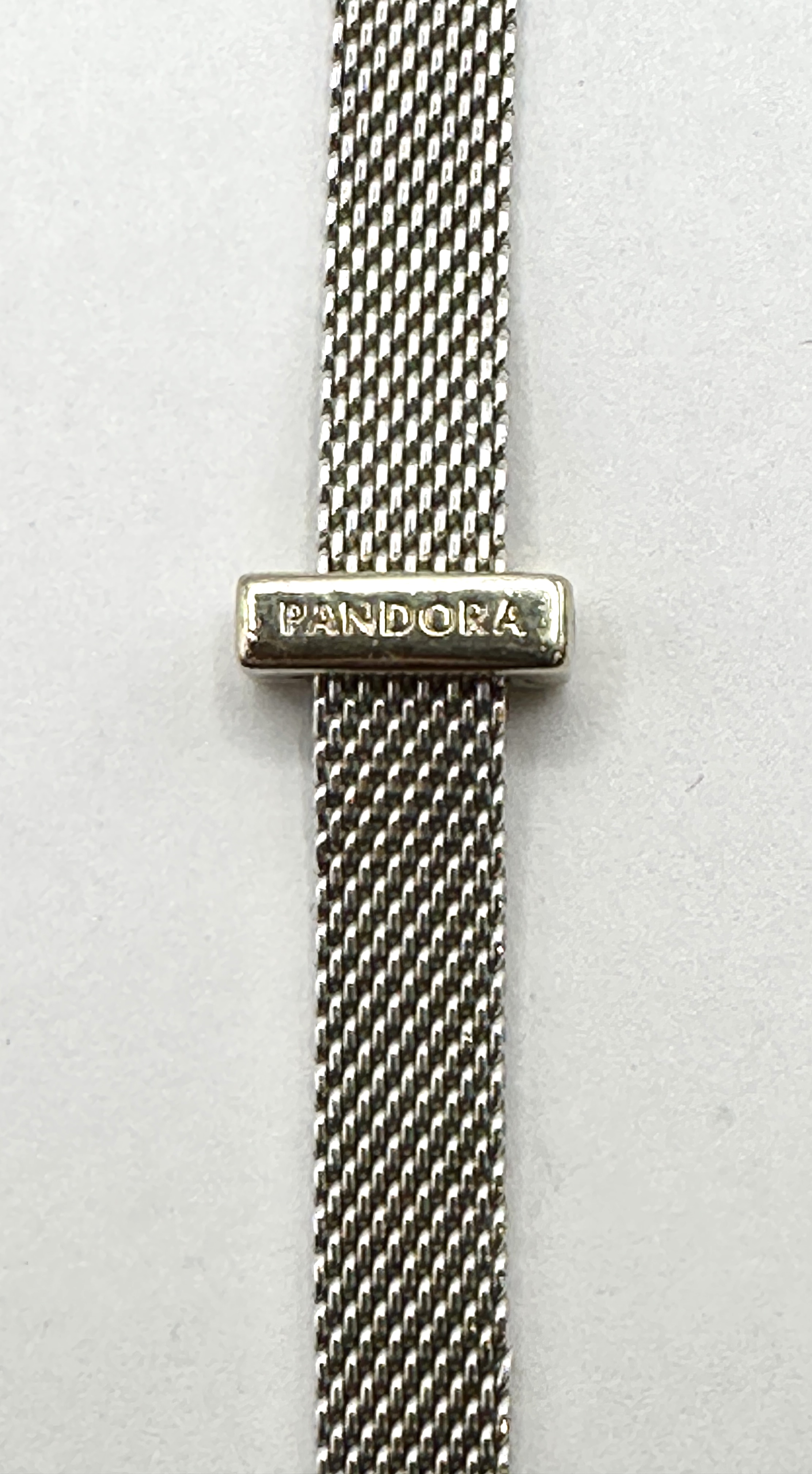 A Pandora Reflexions sterling silver bracelet featuring a flexible Milanese mesh band. The bracelet is fitted with a rectangular sliding clip charm from the Timeless Sparkling Pave series, which is set with a row of clear round-cut stones. The reverse of the charm is embossed with the PANDORA manufacturer mark. The bracelet is completed with a flat bar clasp.