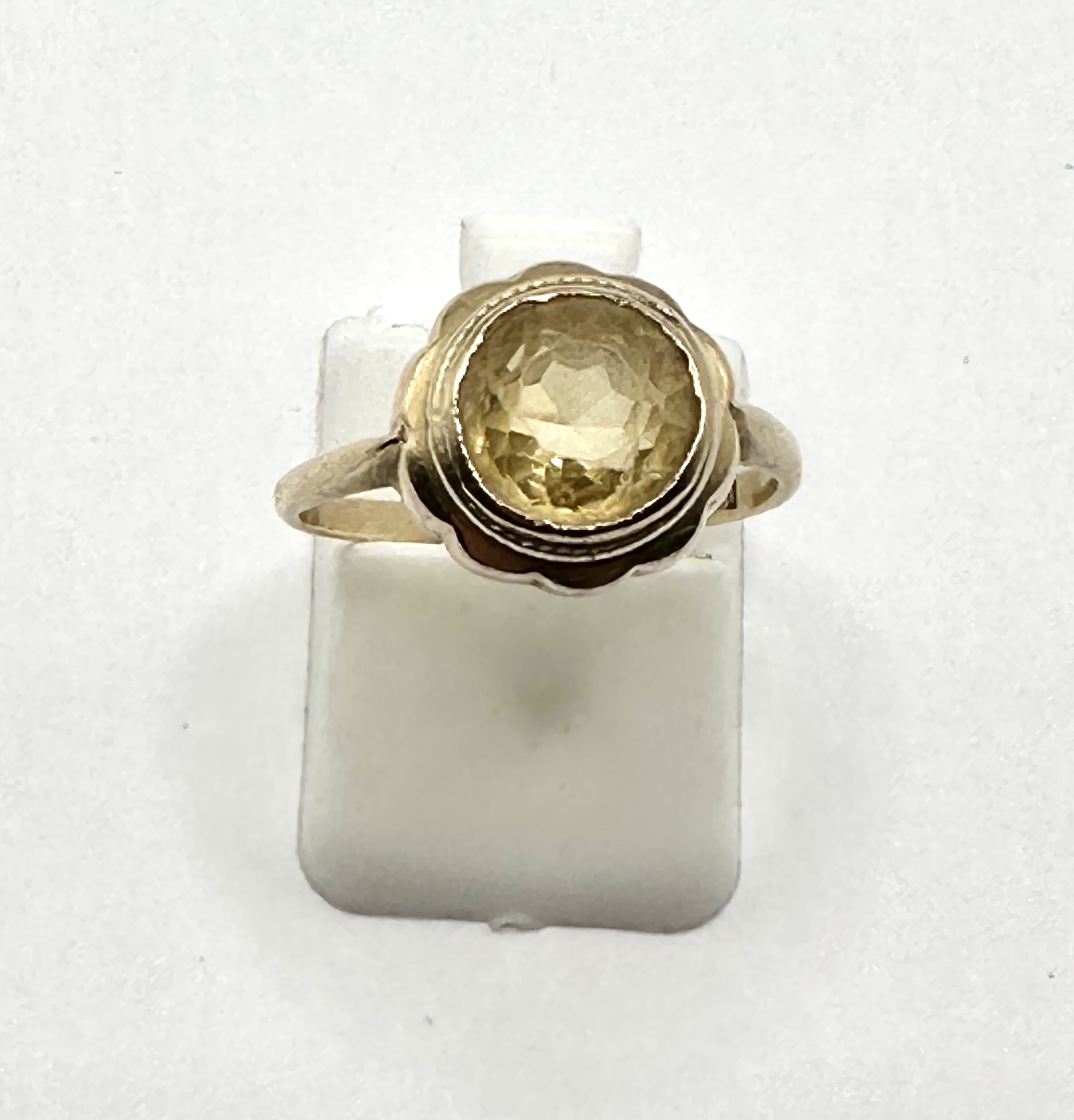 A 9k gold ring featuring a faceted round-cut citrine. The gemstone is housed within a decorative scalloped bezel setting, further embellished with a textured beaded border. The ring is constructed with a slender, polished shank and slightly tapered shoulders. Indiscernible hallmarks or markings are present on the interior of the band.
