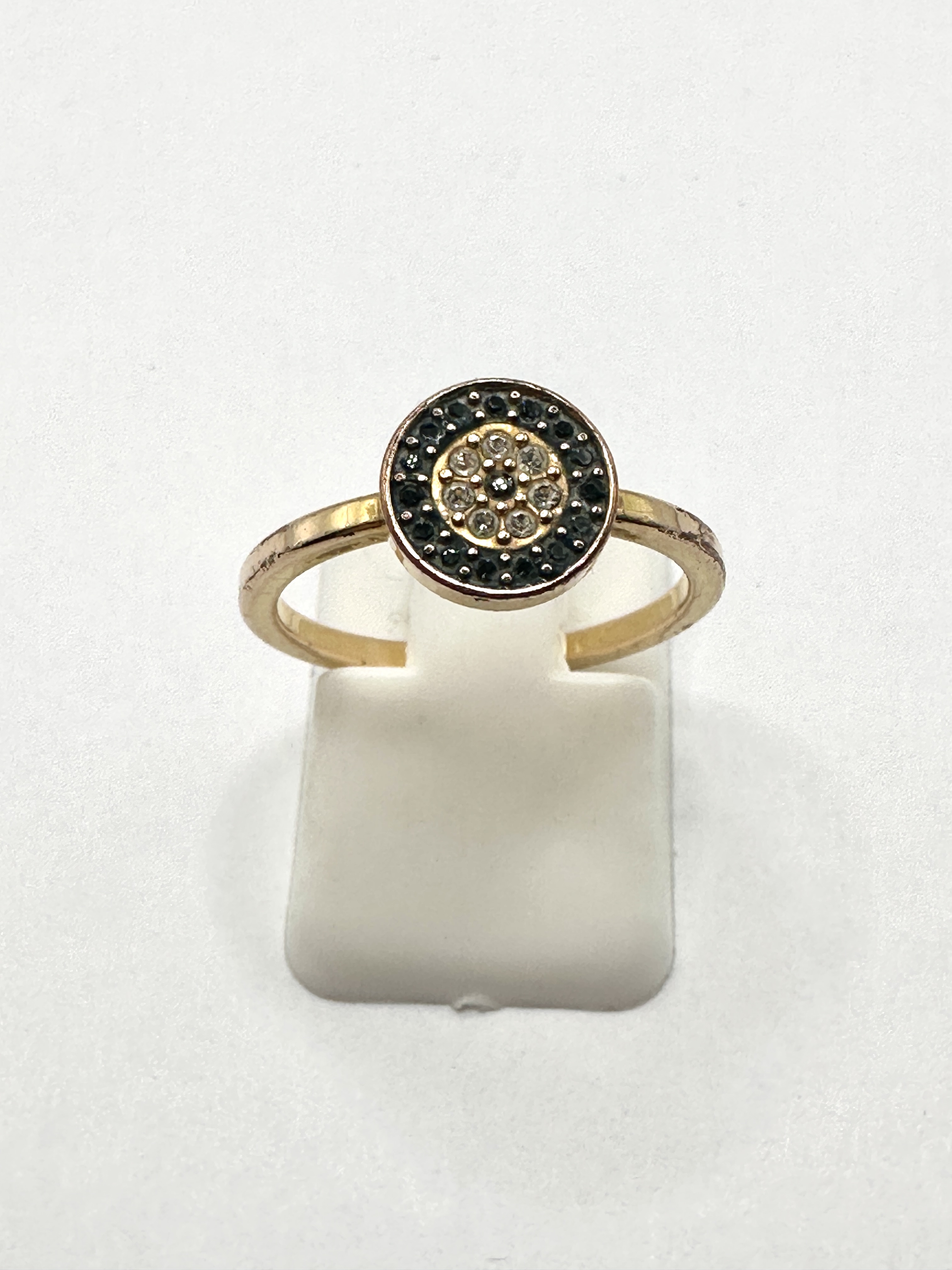 A contemporary yellow gold-toned metal ring featuring a circular target-style cluster head. The central design consists of a small cluster of colourless stones surrounded by an outer halo of pavé-set dark stones. The head is mounted on a thin, plain band. No hallmarks or maker’s marks are visible.
