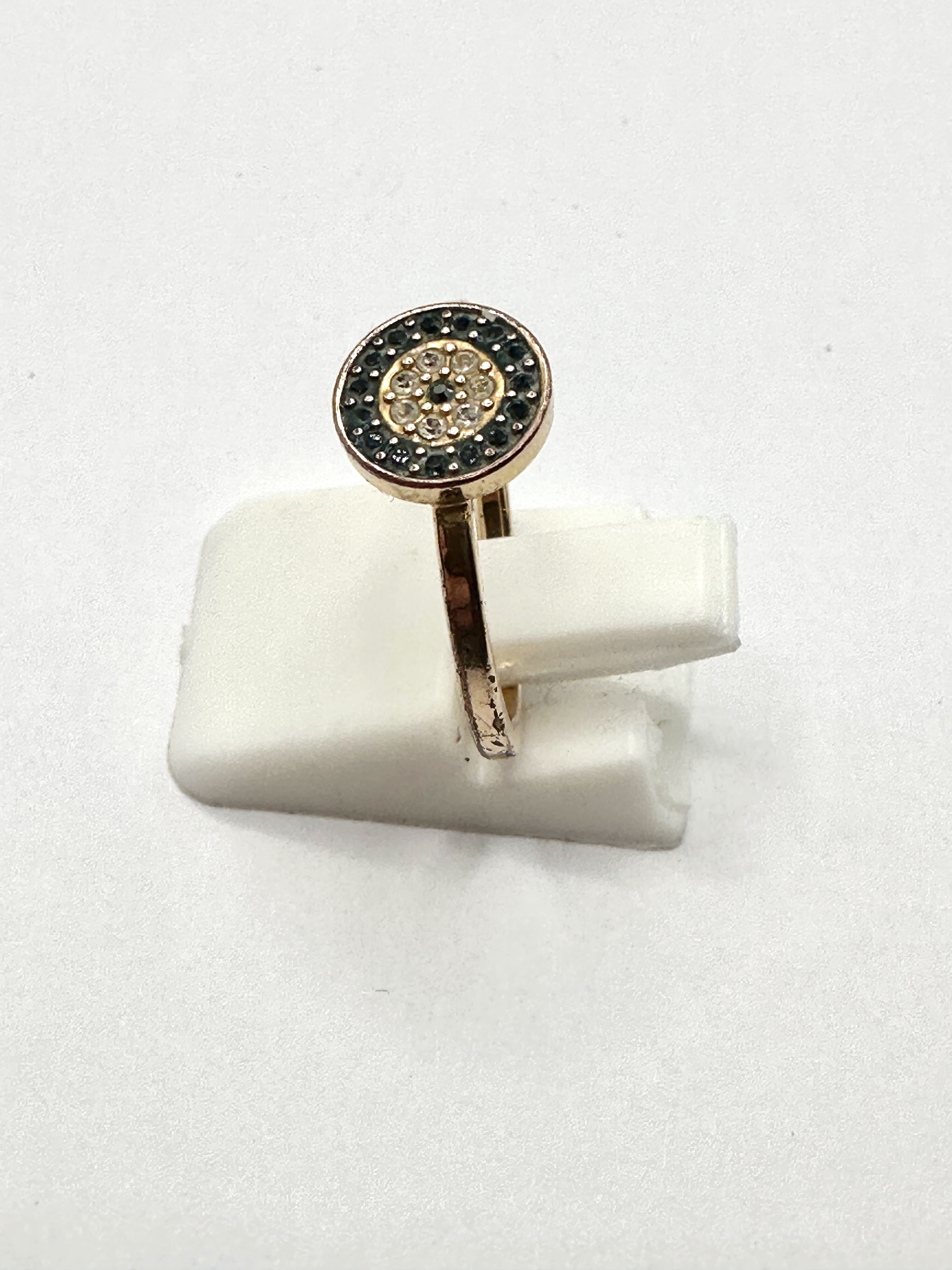 The ring is in fair condition with visible signs of surface wear. There is noticeable pitting and apparent loss of plating on the exterior of the band, revealing the base metal. The stones appear to be intact.