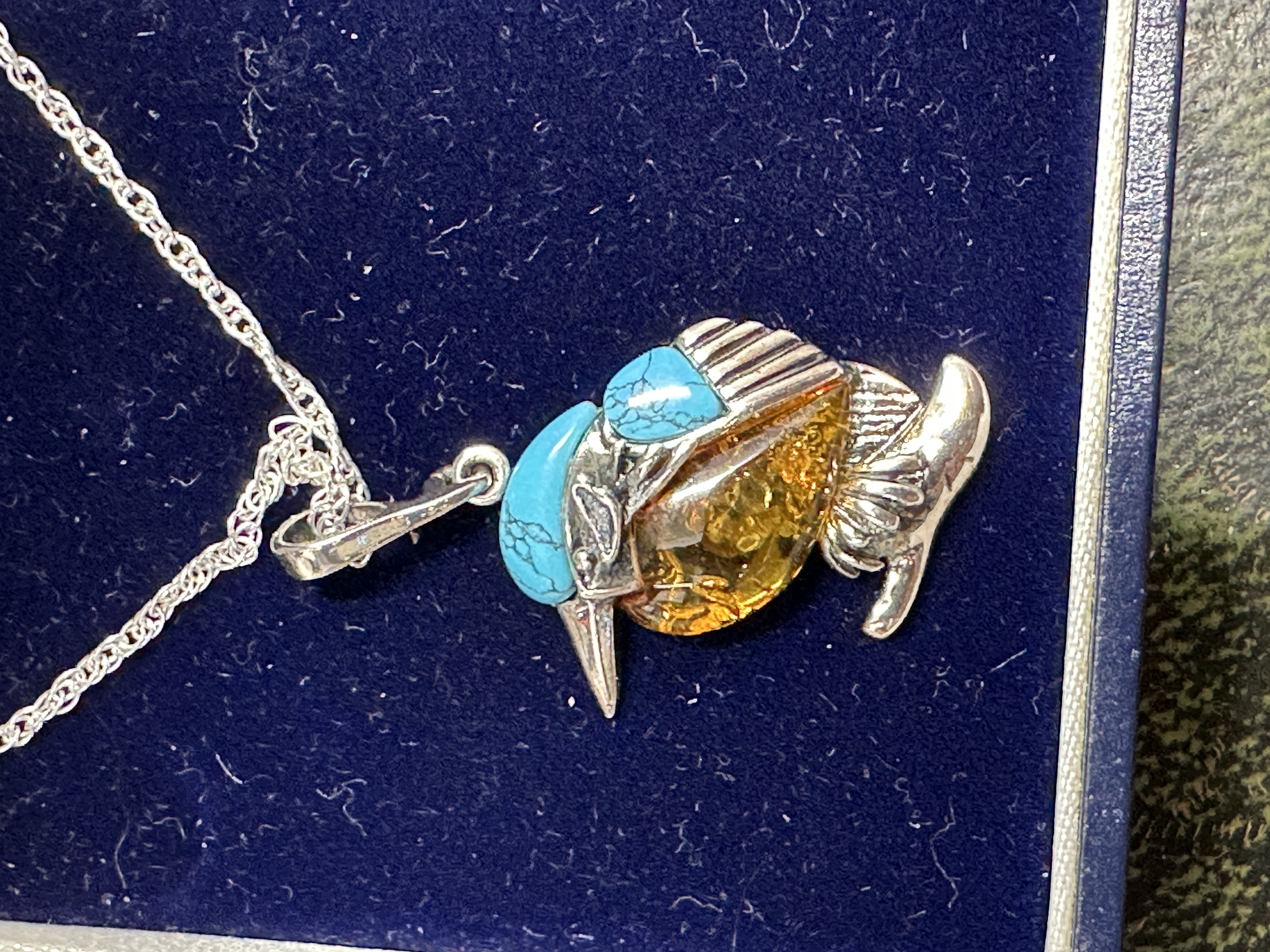 The necklace is in good condition. The amber and turquoise stones are secure within their settings and show no visible chips or fractures. The 925 silver metalwork and chain show no significant signs of wear, damage, or heavy oxidation.