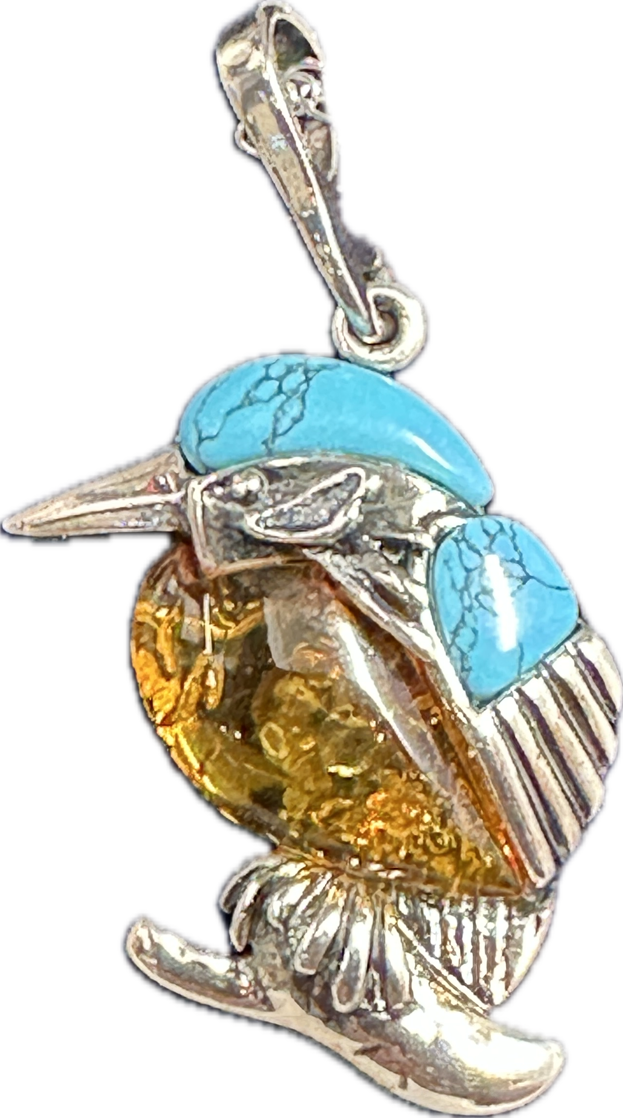 A 925 silver pendant necklace by Henryka, featuring a figural kingfisher perched upon a branch. The bird is designed with a large pear-shaped honey-coloured Baltic amber cabochon forming the body, which displays characteristic internal inclusions. The head and wing are set with two blue-matrix turquoise cabochons. The pendant is suspended from a fine-link 925 silver chain. The piece is presented in a navy blue jewellery box with a white satin lining featuring a circular RH logo.