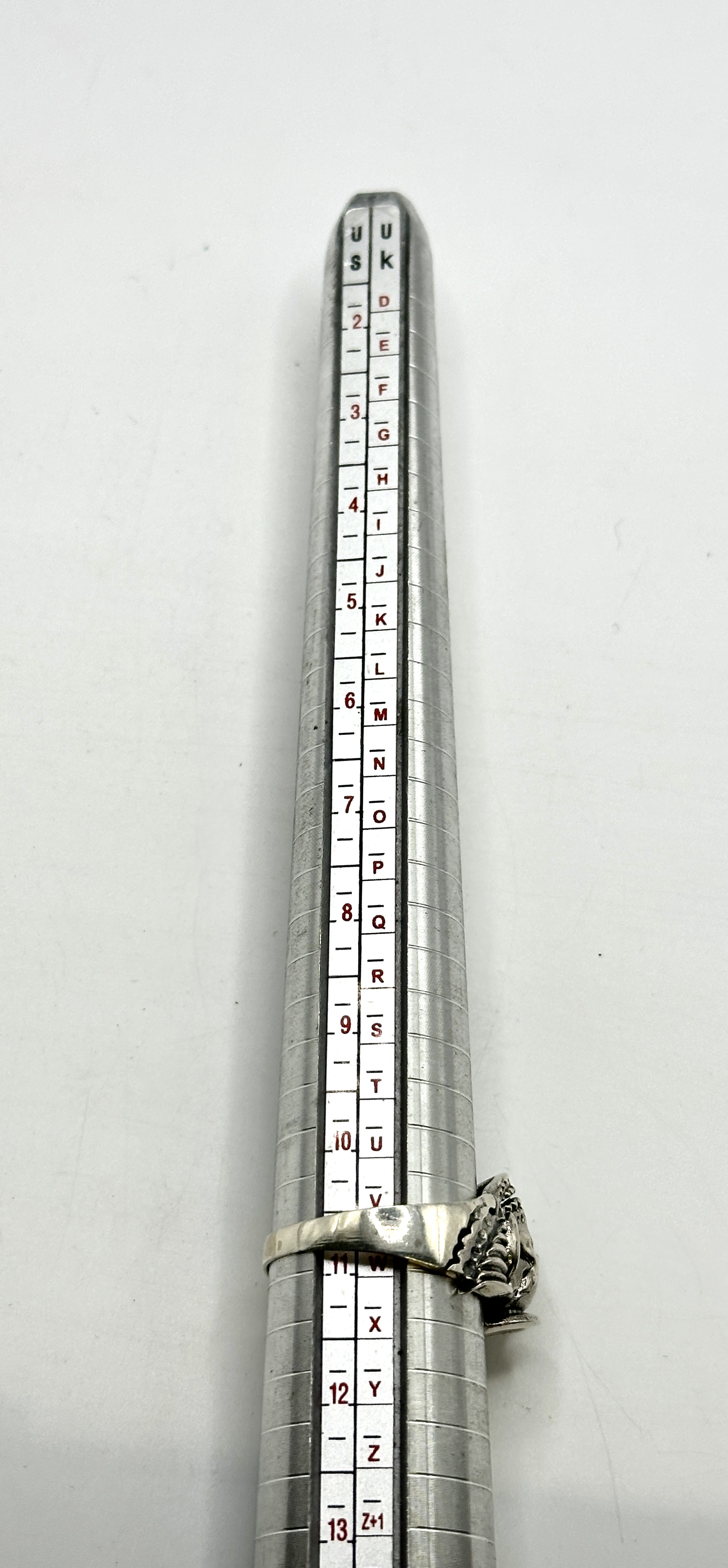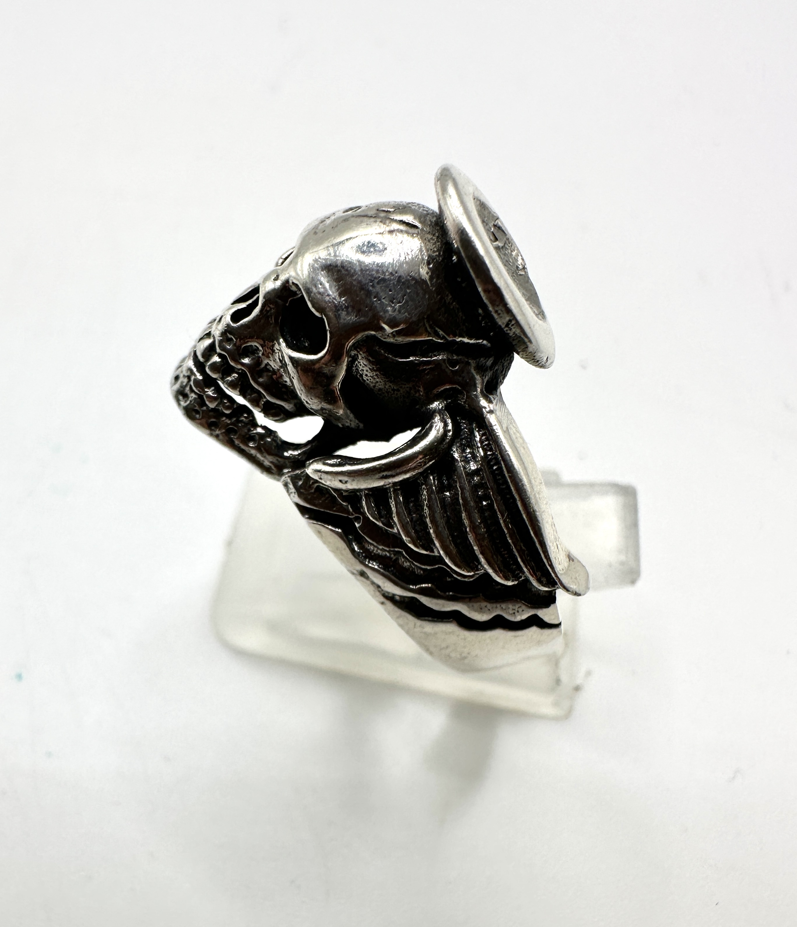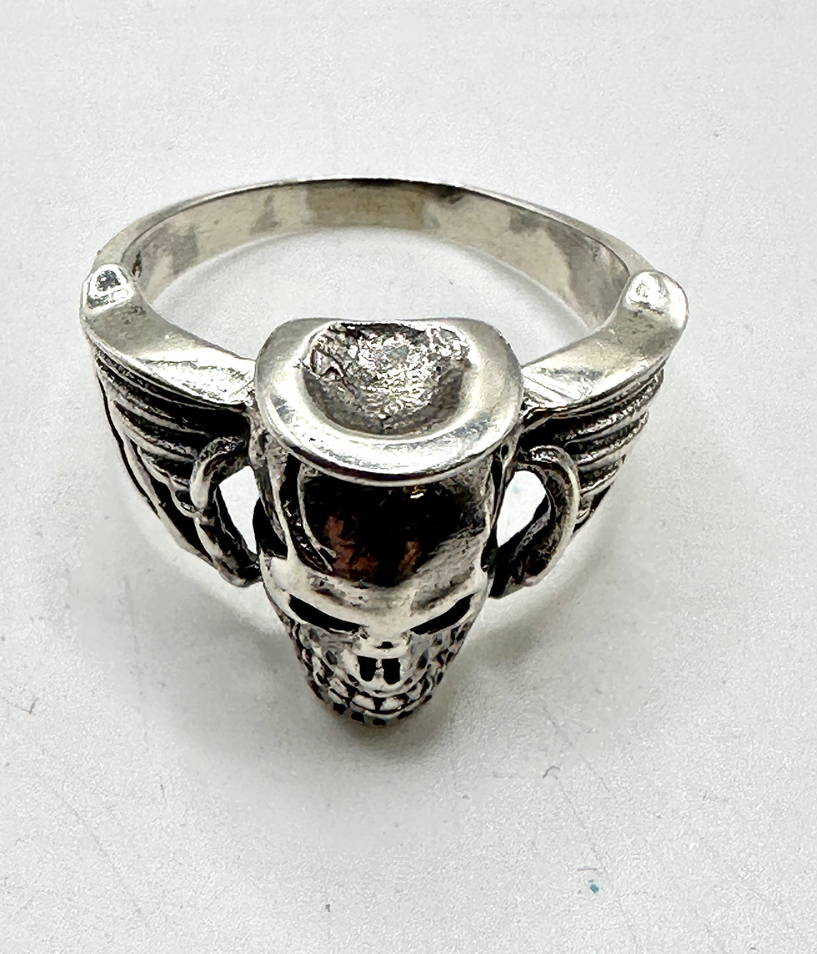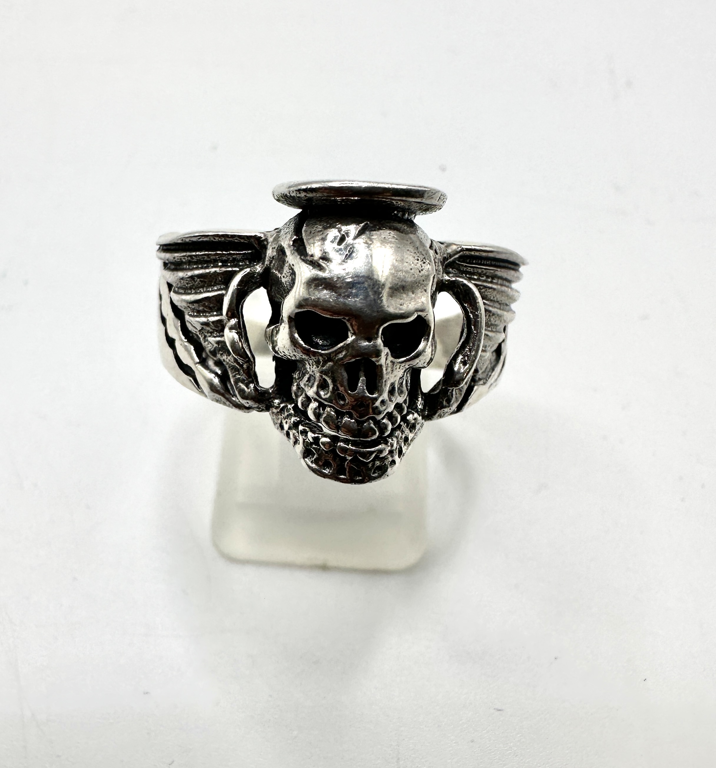 A 925 silver ring featuring a central gothic-style winged skull motif. The skull is rendered with an oxidised finish to provide depth and detail, surmounted by a flat circular disk. Stylised wings extend from the cranium to form the shoulders of the band. The interior of the shank bears a partially legible hallmark.