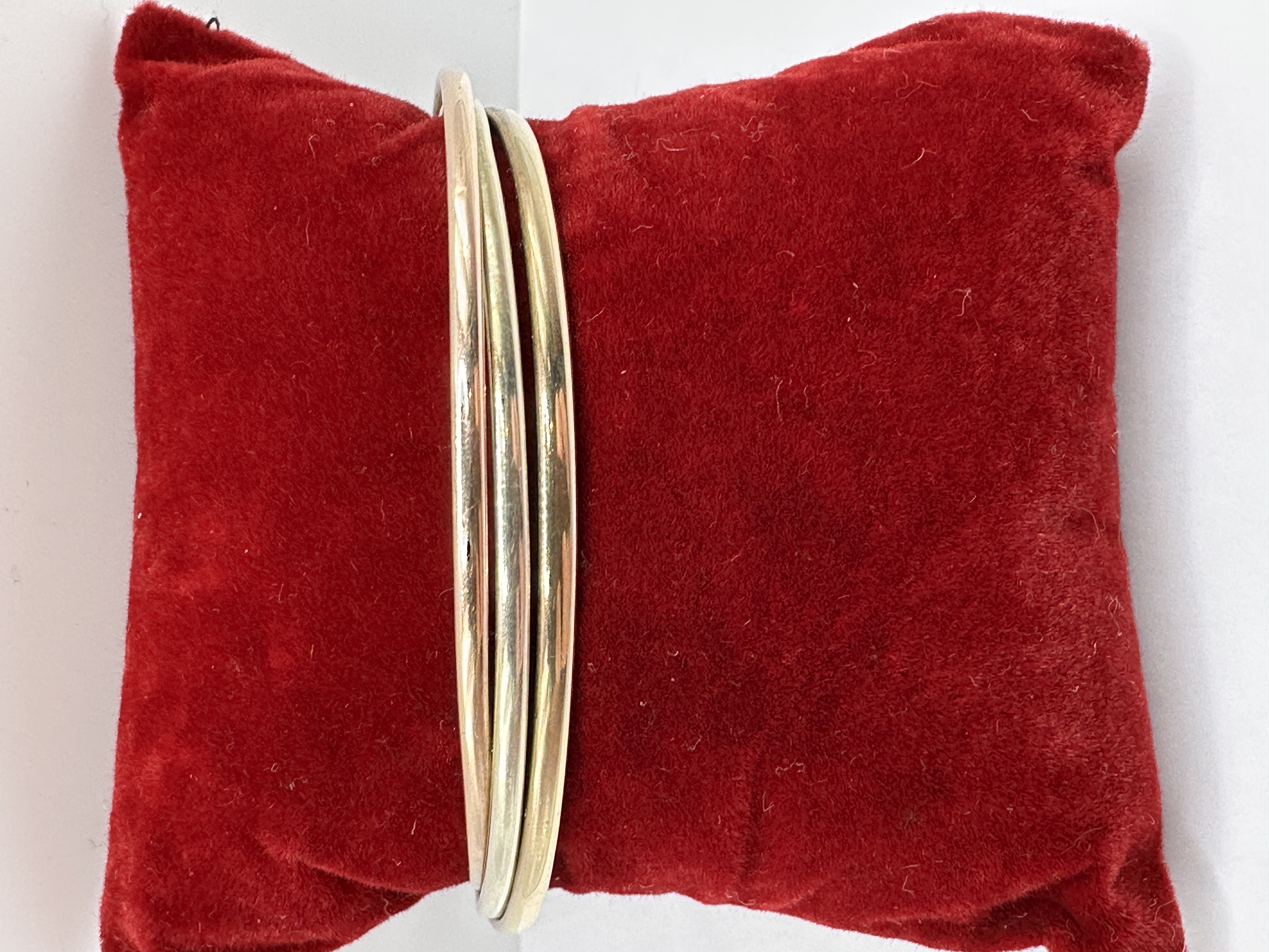 This 9k tri-colour gold open cuff bracelet features a triple-band design. The piece is constructed with three parallel, rounded bands that terminate in two polished spherical ball finials. The bracelet exhibits a minimalist style with a polished finish to the metal surfaces.
