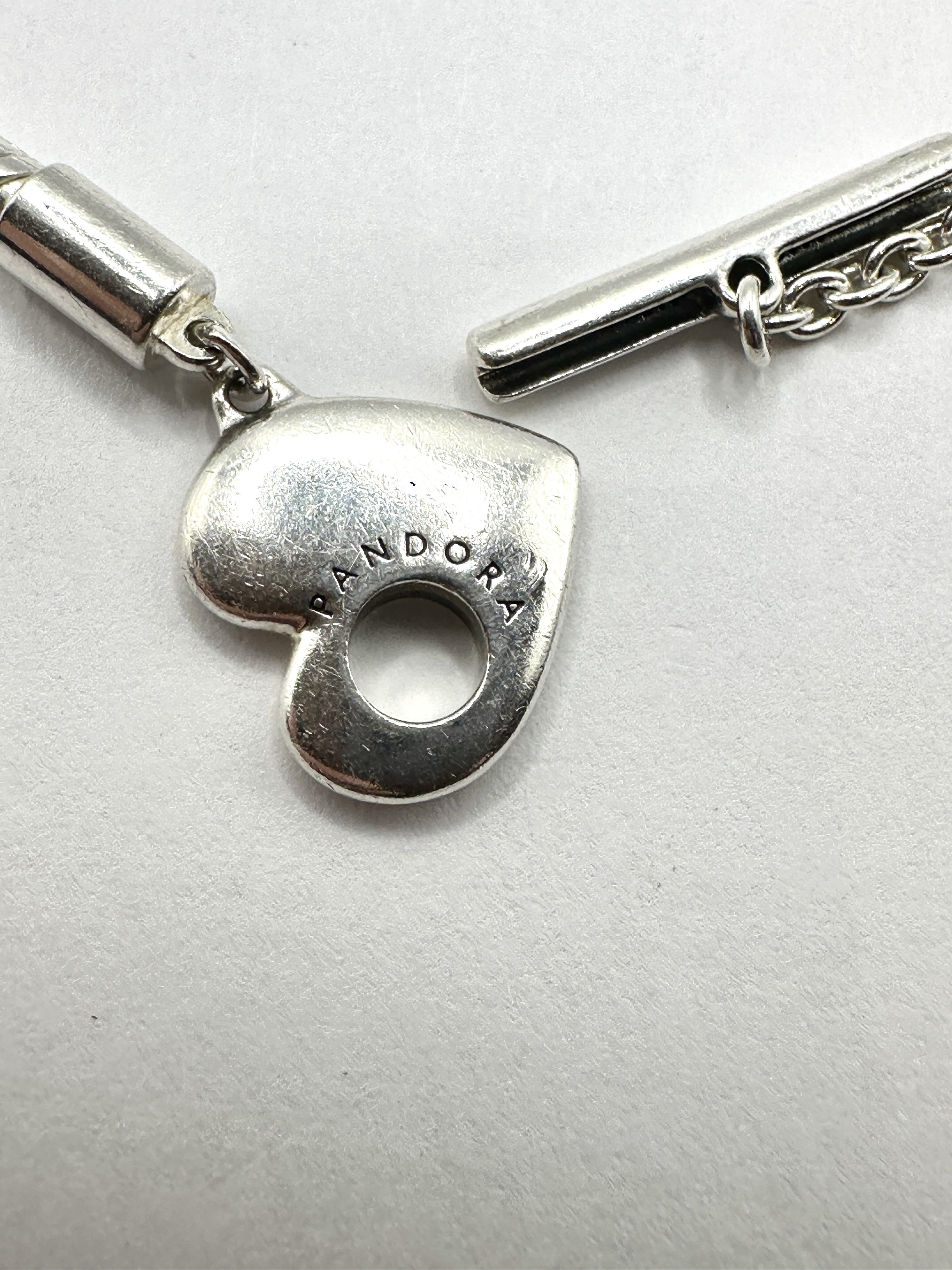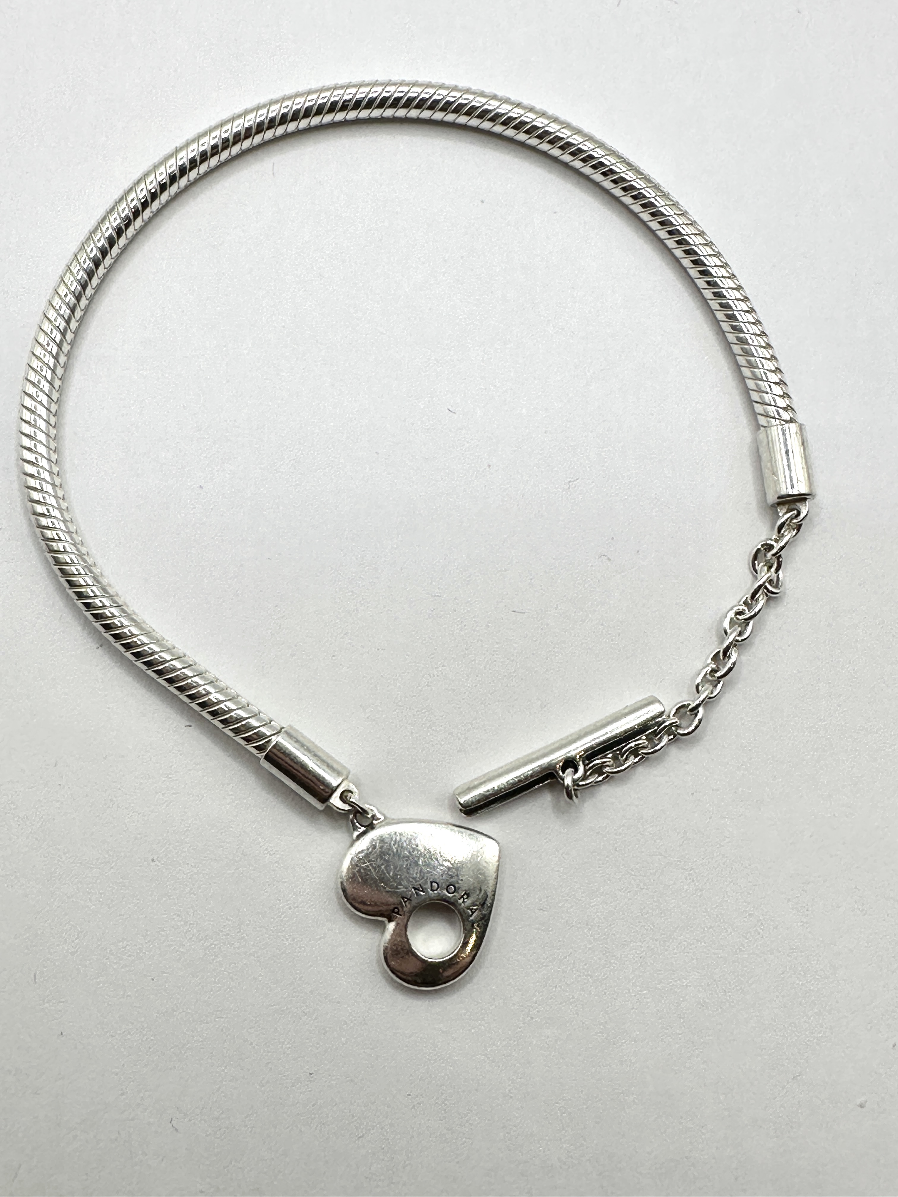A Pandora Moments Heart T-Bar Snake Chain Bracelet. This silver-toned jewellery item features a flexible snake chain with a characteristic ribbed texture, terminating in polished end caps. The fastening mechanism consists of a toggle-style clasp, featuring a heart-shaped element with a circular cutout and a matching T-bar fastener. The heart-shaped component is prominently engraved with the brand name PANDORA. The T-bar is secured to the main chain by a short length of link chain.