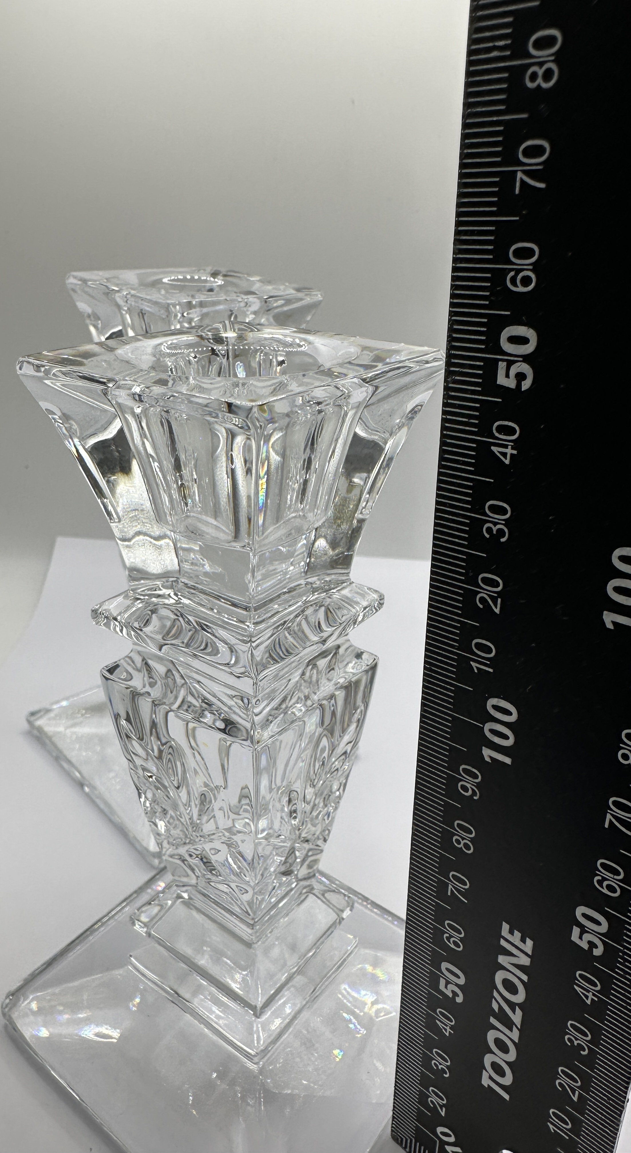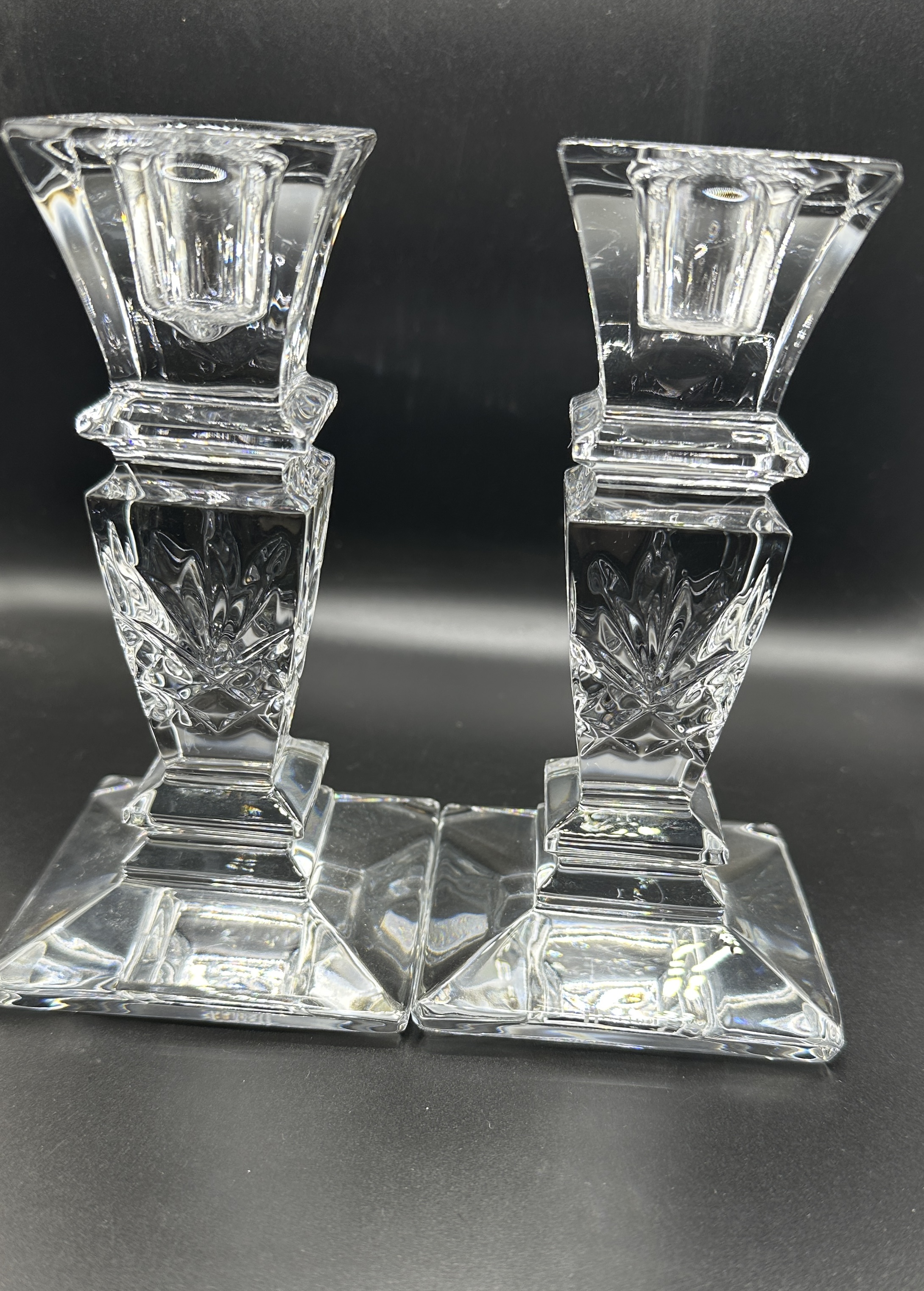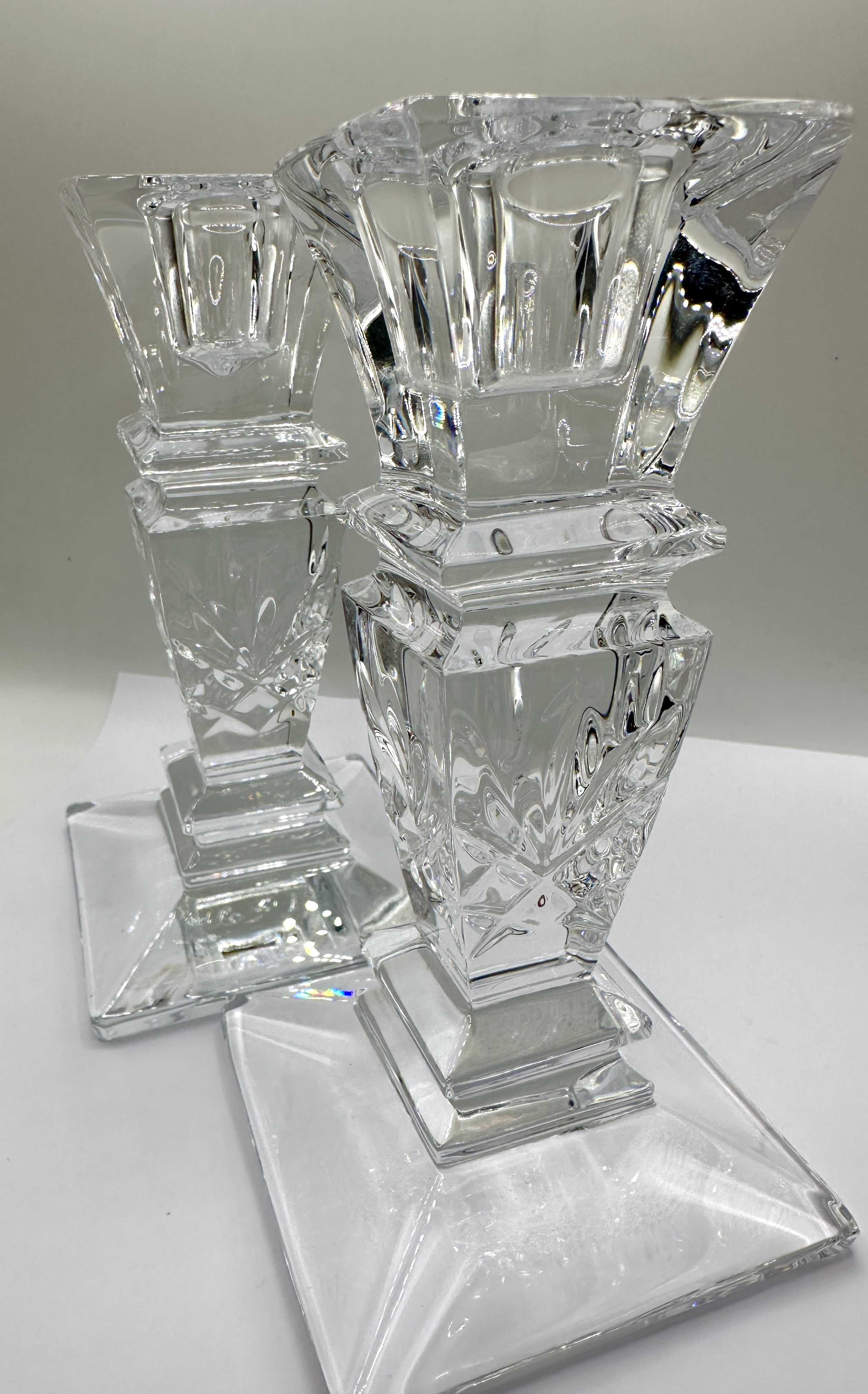 A pair of contemporary clear lead crystal candlesticks. Each candlestick features a square, stepped, and flared base leading to a faceted central column with a diamond-cut decorative band. The items terminate in square, flared candle cups. One base bears an etched Harrods signature to the underside.